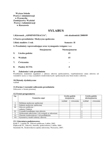 WyŜsza Szkoła Prawa i Administracji w Przemyślu Zamiejscowy Wydział Prawa i Administracji w Rzeszowie SYLABUS 1.Kierunek ,,ADMINISTRACJA”, rok akademicki 2008/09 2.Nazwa przedmiotu: Medycyna społeczna 3.Rok studiów: I rok Semestr: II 4. Przedmioty wprowadzające oraz wymagania wstępne: brak Stacjonarne Niestacjonarne 5. Liczba godzin: 15 6. Wykład: 15 7. Ćwiczenia: - 8. Punkty ECTS: 4 9. ZałoŜenia i cele przedmiotu PrzybliŜenie studentom zagadnień z zakresu zdrowia społeczeństwa, współzaleŜności stanu zdrowia od warunków Ŝycia ( a więc czynników środowiskowych i społecznych) oraz form troski o zdrowie. 10.Metody dydaktyczne wykład 11.Forma i warunki zaliczenia przedmiotu Zaliczenie w formie pisemnej 12.Treści programowe Lp. Liczba godzin stacjonarne Tematyka zajęć wykład I II III IV V VI VII Definicja medycyny społecznej Zadania medycyny społecznej Zdrowie publiczne zadania i funkcje Czynniki kształtujące stan zdrowia Zachowania zdrowotne i ich związek ze zdrowiem Choroby środowiskowe i ich profilaktyka Systemowy model ochrony zdrowia 13. Literatura podstawowa: Kulik T., Latalski M., Zdrowie publiczne, Lublin, 2002. Piątkowski W., Zdrowie, choroba, społeczeństwo, Lublin, 2004 Siemiński M., Środowiskowa opieka zdrowotna, Warszawa, 2007. Liczba godzin niestacjonarne wykład ćwiczenia 2 2 3 2 2 2 2 ćwiczenia 14. Literatura uzupełniająca: Zych A., Człowiek wobec starości, 1999 Rola i zadania medycyny społecznej u progu XXI wieku / Akademia Medyczna we Wrocławiu, Wrocław : 2002. Kulik B., Wrońska I., Zdrowie w medycynie i naukach społecznych, Stalowa Wola 2000. Janicki K., Klimza W., Szewczyk J., Środowisko a zdrowie, Częstochowa 2000. Czaplicki Z., Muzyka W., Styl Ŝycia a zdrowie, Olsztyn, 1995. Frąckiewicz L.,(red.), Czynniki warunkujące stan zdrowia ludności, Katowice 1989. 15. Nazwisko osoby prowadzącej zajęcia: - wykład: dr Agnieszka Grzywa-Bilkiewicz