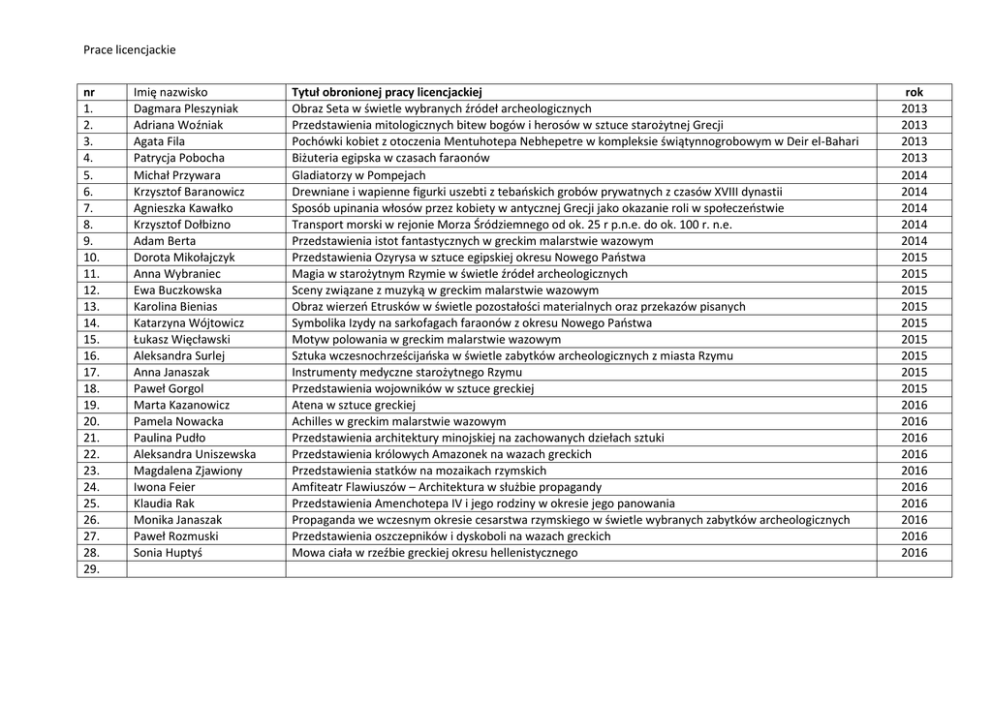 Prace licencjackie nr 1. 2. 3. 4. 5. 6. 7. 8. 9. 10. 11. 12. 13. 14. 15. 16. 17. 18. 19. 20. 21. 22. 23. 24. 25. 26. 27. 28. 29. Imię nazwisko Dagmara Pleszyniak Adriana Woźniak Agata Fila Patrycja Pobocha Michał Przywara Krzysztof Baranowicz Agnieszka Kawałko Krzysztof Dołbizno Adam Berta Dorota Mikołajczyk Anna Wybraniec Ewa Buczkowska Karolina Bienias Katarzyna Wójtowicz Łukasz Więcławski Aleksandra Surlej Anna Janaszak Paweł Gorgol Marta Kazanowicz Pamela Nowacka Paulina Pudło Aleksandra Uniszewska Magdalena Zjawiony Iwona Feier Klaudia Rak Monika Janaszak Paweł Rozmuski Sonia Huptyś Tytuł obronionej pracy licencjackiej Obraz Seta w świetle wybranych źródeł archeologicznych Przedstawienia mitologicznych bitew bogów i herosów w sztuce starożytnej Grecji Pochówki kobiet z otoczenia Mentuhotepa Nebhepetre w kompleksie świątynnogrobowym w Deir el-Bahari Biżuteria egipska w czasach faraonów Gladiatorzy w Pompejach Drewniane i wapienne figurki uszebti z tebańskich grobów prywatnych z czasów XVIII dynastii Sposób upinania włosów przez kobiety w antycznej Grecji jako okazanie roli w społeczeństwie Transport morski w rejonie Morza Śródziemnego od ok. 25 r p.n.e. do ok. 100 r. n.e. Przedstawienia istot fantastycznych w greckim malarstwie wazowym Przedstawienia Ozyrysa w sztuce egipskiej okresu Nowego Państwa Magia w starożytnym Rzymie w świetle źródeł archeologicznych Sceny związane z muzyką w greckim malarstwie wazowym Obraz wierzeń Etrusków w świetle pozostałości materialnych oraz przekazów pisanych Symbolika Izydy na sarkofagach faraonów z okresu Nowego Państwa Motyw polowania w greckim malarstwie wazowym Sztuka wczesnochrześcijańska w świetle zabytków archeologicznych z miasta Rzymu Instrumenty medyczne starożytnego Rzymu Przedstawienia wojowników w sztuce greckiej Atena w sztuce greckiej Achilles w greckim malarstwie wazowym Przedstawienia architektury minojskiej na zachowanych dziełach sztuki Przedstawienia królowych Amazonek na wazach greckich Przedstawienia statków na mozaikach rzymskich Amfiteatr Flawiuszów – Architektura w służbie propagandy Przedstawienia Amenchotepa IV i jego rodziny w okresie jego panowania Propaganda we wczesnym okresie cesarstwa rzymskiego w świetle wybranych zabytków archeologicznych Przedstawienia oszczepników i dyskoboli na wazach greckich Mowa ciała w rzeźbie greckiej okresu hellenistycznego rok 2013 2013 2013 2013 2014 2014 2014 2014 2014 2015 2015 2015 2015 2015 2015 2015 2015 2015 2016 2016 2016 2016 2016 2016 2016 2016 2016 2016