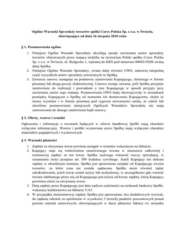 Ogólne Warunki Sprzedaży towarów spółki Corex Polska Sp. z o.o. w Świeciu, obowiązujące od dnia 16 sierpnia 2010 roku § 1. Postanowienia ogólne 1. Niniejsze Ogólne Warunki Sprzedaży określają zasady zawierania umów sprzedaży towarów oferowanych przez mającą siedzibę na terytorium Polski spółkę Corex Polska Sp. z o.o. w Świeciu, ul. Bydgoska 1, wpisaną do KRS pod numerem 0000219208 zwaną dalej Spółką. 2. Niniejsze Ogólne Warunki Sprzedaży, zwane dalej również OWS, stanowią integralną część wszystkich umów sprzedaży zawieranych ze Spółką. 3. Zawarcie umowy następuje na podstawie zamówienia Kupującego, złożonego w formie pisemnej lub drogą poczty elektronicznej. Umowa zostaje zawarta, jeśli Spółka przyjmie zamówienie do realizacji i powiadomi o tym Kupującego w sposób przyjęty przy zawieraniu umów tego rodzaju. Postanowienia OWS będą obowiązywały w stosunkach pomiędzy Kupującym a Spółką od momentu ich dostarczenia Kupującemu, chyba że strony wyraźnie i w formie pisemnej pod rygorem nieważności ustalą, że całość lub określone postanowienia niniejszych Ogólnych Warunków Sprzedaży nie mają zastosowania do danego zamówienia bądź umowy. § 2. Oferty, wzorce i cenniki Ogłoszenia i informacje o towarach będących w ofercie handlowej Spółki mają charakter wyłącznie informacyjny. Wzorce i próbki wystawiane przez Spółkę mają wyłącznie charakter materiałów poglądowych i wystawowych. § 3. Warunki płatności 1. Zapłata za otrzymany towar powinna nastąpić w terminie wskazanym na fakturze. 2. Kupujący staje się właścicielem zamówionego towaru w momencie całkowitej i terminowej zapłaty za ten towar. Spółka zastrzega własność rzeczy sprzedanej, w rozumieniu treści przepisu art. 589 kodeksu cywilnego. Jeżeli Kupujący nie dokona zapłaty w określonym terminie, Spółka jest uprawniona zażądać od Kupującego zwrotu towarów, za które cena nie została zapłacona. Spółka może również żądać odszkodowania, jeżeli towar został zużyty lub uszkodzony, w szczególności gdy wartość towaru odebranego przez nią od Kupującego jest niższa od kwoty zapłaty, którą Kupujący powinien uiścić za otrzymany towar. 3. Datą zapłaty przez Kupującego jest data wpływu należności na rachunek bankowy Spółki, wskazany każdorazowo na fakturze VAT. 4. W przypadku nieterminowej zapłaty Spółka jest uprawniona, bez dodatkowych wezwań, do żądania odsetek za opóźnienie w wysokości 3 (trzech) punktów procentowych ponad poziom odsetek ustawowych, obowiązujących w dacie płatności faktury (w stosunku 5. 6. 7. 8. 9. rocznym). Odsetki za opóźnienie liczone są od dnia następującego po dniu, w którym upłynął termin płatności. W przypadku nieterminowej zapłaty, Spółka jest uprawniona do dochodzenia, obok należności głównej i odsetek za opóźnienie, również zwrotu kosztów sądowych, egzekucyjnych oraz zastępstwa procesowego. Ponadto Spółka jest uprawniona do żądania i dochodzenia od Kupującego zwrotu zryczałtowanych kosztów związanych z windykacją tej należności do wysokości 10% sumy windykowanych należności. Jeżeli Kupujący opóźnia się z płatnościami należnymi na podstawie więcej niż jednej faktury, Spółka ma prawo zaliczenia jakiejkolwiek zapłaty dokonanej przez Kupującego z tytułu jakiejkolwiek faktury w pierwszej kolejności na poczet odsetek za opóźnienie, a następnie należności najdawniej wymagalnych. Postanowieniem niniejszym uchyla się uprawnienia Kupującego (dłużnika), o którym mowa w art. 451 §1 kodeksu cywilnego. Jednocześnie Spółka zastrzega sobie prawo dokonania kompensaty z tytułu innych wierzytelności i zobowiązań, zgodnie z przepisami kodeksu cywilnego. Kupującemu nie służy wobec Spółki prawo złożenia oświadczenia o potrąceniu. Zgłoszenie reklamacji nie uprawnia Kupującego do wstrzymania zapłaty za dostarczony towar bądź za jego część. Kupujący zobowiązuje się do niezwłocznego pisemnego zawiadomienia Spółki o każdorazowej zmianie swojej siedziby lub miejsca zamieszkania i adresu dla doręczeń korespondencji. Powiadomienie pod rygorem nieważności winno nastąpić na piśmie. Brak zawiadomienia powoduje, że doręczenia dokonane na adresy wskazane w zamówieniu lub też w podpisanych umowach lub innych porozumieniach, uważane są za skuteczne. § 4. Warunki dostawy 1. Dostawa towaru zakupionego przez Kupującego jest realizowana na podstawie jego zamówienia. 2. Zamówienie powinno być złożone w formie pisemnej i określać dokładną nazwę i adres Kupującego, asortyment, ilość zamawianego towaru, termin i miejsce dostawy. 3. Spółka może przyjąć zamówienie w całości lub w części. 4. Jeżeli niemożność spełnienia świadczenia przez Spółkę nastąpiła wskutek siły wyższej, Kupującemu nie przysługują żadne roszczenia o naprawienie szkody wynikłej z niewykonania bądź nienależnego wykonania zobowiązania. Spółka ma obowiązek niezwłocznego poinformowania Kupującego o zdarzeniach, które spowodowały niemożność realizacji dostawy. 5. W przypadku istnienia po stronie Kupującego przeterminowanych płatności, nieuregulowania odsetek za opóźnione płatności bądź w razie powzięcia przez Spółkę wiadomości o pogorszeniu się sytuacji finansowej Kupującego w sposób mogący negatywnie wpłynąć na wykonanie zobowiązań Kupującego wynikających z zawartej umowy, realizacja kolejnych zamówień może zostać wstrzymana do czasu dokonania stosownych płatności bądź zabezpieczenia płatności w sposób uzgodniony odrębnie przez Spółkę i Kupującego. § 5. Dostarczenie towarów 1. O ile strony nie umówiły się inaczej, towar Spółki jest sprzedawany ex works. 2. Towar, który nie może być dostarczony Kupującemu z przyczyn leżących po stronie Kupującego w ustalonym terminie, będzie przechowywany przez Spółkę na koszt i 