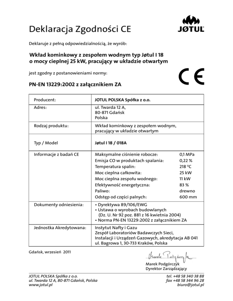 Deklaracja Zgodności CE Deklaruje z pełną odpowiedzialnością, że wyrób: Wkład kominkowy z zespołem wodnym typ Jøtul I 18 o mocy cieplnej 25 kW, pracujący w układzie otwartym jest zgodny z postanowieniami normy: PN-EN 13229:2002 z załącznikiem ZA Producent: JOTUL POLSKA Spółka z o.o. Adres: ul. Twarda 12 A, 80-871 Gdańsk Polska Rodzaj produktu: Wkład kominkowy z zespołem wodnym, pracujący w układzie otwartym Typ / Model Jøtul I 18 / 018A Informacje z badań CE Maksymalne ciśnienie robocze: Emisja CO w produktach spalania: Temperatura spalin: Moc cieplna całkowita: Moc cieplna zespołu wodnego: Efektywność energetyczna: Paliwo: Odstęp od części palnych: 0,1 MPa 0,22 % 218 0C 25 kW 11 kW 83 % drewno 600 mm Dokumenty odniesienia: • Dyrektywa 89/106/EWG • Ustawa o wyrobach budowlanych (Dz. U. Nr 92 poz. 881 z 16 kwietnia 2004) • Norma PN-EN 13229:2002 z załącznikiem ZA Jednostka Akredytowana: Instytut Nafty i Gazu Zespół Laboratoriów Badawczych Sieci, Instalacji i Urządzeń Gazowych, akredytacja AB 041 ul. Bagrowa 1, 30-733 Kraków, Polska Gdańsk, wrzesień 2011 Marek Podgórczyk Dyrektor Zarządzający JOTUL POLSKA Spółka z o.o. ul. Twarda 12 A, 80-871 Gdańsk, Polska www.jotul.pl tel. +48 58 340 38 88 fax +48 58 344 96 28 [email protected]