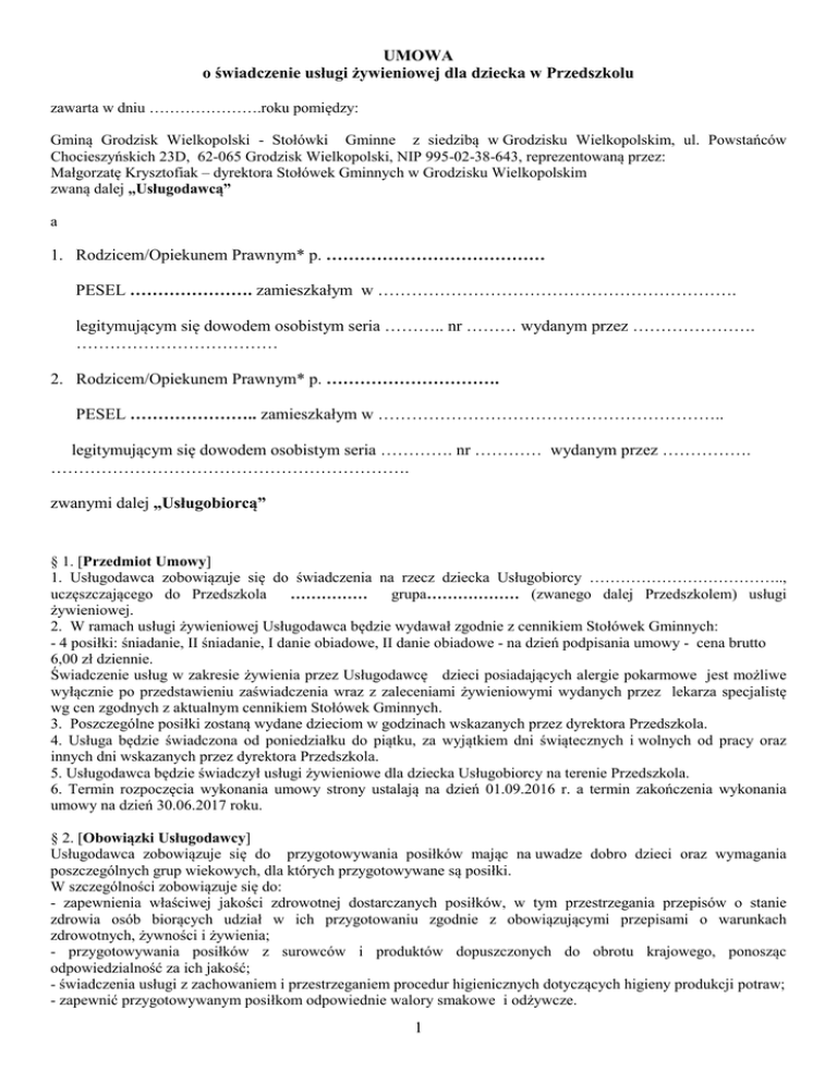 UMOWA o świadczenie usługi żywieniowej dla dziecka w Przedszkolu zawarta w dniu ………………….roku pomiędzy: Gminą Grodzisk Wielkopolski - Stołówki Gminne z siedzibą w Grodzisku Wielkopolskim, ul. Powstańców Chocieszyńskich 23D, 62-065 Grodzisk Wielkopolski, NIP 995-02-38-643, reprezentowaną przez: Małgorzatę Krysztofiak – dyrektora Stołówek Gminnych w Grodzisku Wielkopolskim zwaną dalej „Usługodawcą” a 1. Rodzicem/Opiekunem Prawnym* p. ………………………………… PESEL …………………. zamieszkałym w ………………………………………………………. legitymującym się dowodem osobistym seria ……….. nr ……… wydanym przez …………………. ……………………………… 2. Rodzicem/Opiekunem Prawnym* p. …………………………. PESEL ………………….. zamieszkałym w …………………………………………………….. legitymującym się dowodem osobistym seria …………. nr ………… wydanym przez ……………. ………………………………………………………. zwanymi dalej „Usługobiorcą” § 1. [Przedmiot Umowy] 1. Usługodawca zobowiązuje się do świadczenia na rzecz dziecka Usługobiorcy ……………………………….., uczęszczającego do Przedszkola …………… grupa……………… (zwanego dalej Przedszkolem) usługi żywieniowej. 2. W ramach usługi żywieniowej Usługodawca będzie wydawał zgodnie z cennikiem Stołówek Gminnych: - 4 posiłki: śniadanie, II śniadanie, I danie obiadowe, II danie obiadowe - na dzień podpisania umowy - cena brutto 6,00 zł dziennie. Świadczenie usług w zakresie żywienia przez Usługodawcę dzieci posiadających alergie pokarmowe jest możliwe wyłącznie po przedstawieniu zaświadczenia wraz z zaleceniami żywieniowymi wydanych przez lekarza specjalistę wg cen zgodnych z aktualnym cennikiem Stołówek Gminnych. 3. Poszczególne posiłki zostaną wydane dzieciom w godzinach wskazanych przez dyrektora Przedszkola. 4. Usługa będzie świadczona od poniedziałku do piątku, za wyjątkiem dni świątecznych i wolnych od pracy oraz innych dni wskazanych przez dyrektora Przedszkola. 5. Usługodawca będzie świadczył usługi żywieniowe dla dziecka Usługobiorcy na terenie Przedszkola. 6. Termin rozpoczęcia wykonania umowy strony ustalają na dzień 01.09.2016 r. a termin zakończenia wykonania umowy na dzień 30.06.2017 roku. § 2. [Obowiązki Usługodawcy] Usługodawca zobowiązuje się do przygotowywania posiłków mając na uwadze dobro dzieci oraz wymagania poszczególnych grup wiekowych, dla których przygotowywane są posiłki. W szczególności zobowiązuje się do: - zapewnienia właściwej jakości zdrowotnej dostarczanych posiłków, w tym przestrzegania przepisów o stanie zdrowia osób biorących udział w ich przygotowaniu zgodnie z obowiązującymi przepisami o warunkach zdrowotnych, żywności i żywienia; - przygotowywania posiłków z surowców i produktów dopuszczonych do obrotu krajowego, ponosząc odpowiedzialność za ich jakość; - świadczenia usługi z zachowaniem i przestrzeganiem procedur higienicznych dotyczących higieny produkcji potraw; - zapewnić przygotowywanym posiłkom odpowiednie walory smakowe i odżywcze. 1 § 3. [Obowiązki Usługobiorcy] 1. Usługobiorca zobowiązuje się do terminowego uiszczania opłaty za żywienie, wynikającej z wysokości dziennej stawki żywieniowej określonej w § 1 pomnożonej przez liczbę dni żywienia w danym miesiącu. Wysokość należnych do zapłaty kwot Usługobiorca otrzyma w formie pisemnej informacji w Przedszkolu na początku każdego kolejnego miesiąca kalendarzowego. 2. Opłaty, o których mowa w ust. 1 są płatne miesięcznie z dołu, najpóźniej do dnia 15-go następnego miesiąca za dany miesiąc, przelewem na rachunek bankowy prowadzony w Banku Spółdzielczym w Grodzisku Wielkopolskim o numerze: 94 9063 0008 0000 0025 8371 0001. Za datę zapłaty opłat określonych w umowie uważa się datę wpływu środków na rachunek bankowy Stołówek Gminnych w Grodzisku Wielkopolskim. 3. Niezapłacenie w terminie opłat, o których mowa w niniejszej umowie spowoduje naliczanie odsetek ustawowych za opóźnienie. § 4 . [Zwroty za niewykorzystanie żywienie] W przypadku nieobecności dziecka w przedszkolu Usługodawca może odstąpić od obciążenia Usługobiorcy opłatą za niewykorzystane żywienie. Warunkiem powyższego jest skuteczne powiadomienie Usługodawcy o nieobecności dziecka. Zgłoszenie nieobecności Rodzice/Opiekunowie Prawni mogą dokonać wybierając jednej z poniższych metod: a/ informując telefonicznie pod numer telefonu: 0 61 227 12 99, b/ wypełniając - kartę zgłoszenia nieobecności oraz przekazując ją do siedziby Stołówek Gminnych osobiście lub przesyłając na stronę [email protected]. Zgłoszenia nieobecności, które wpłyną do godz. 11.00 oraz ich pozytywna weryfikacja przez pracowników Stołówek spowodują odliczenie za niewykorzystane żywienie już od dnia następnego. § 5. [Rozwiązanie umowy] 1. Każda ze Stron może rozwiązać niniejszą umowę za pisemnym wypowiedzenie z zachowaniem miesięcznego okresu wypowiedzenia ze skutkiem na koniec miesiąca kalendarzowego. 2. W przypadku zalegania przez Usługobiorcę z płatnością za dwa pełne okresy płatności Usługodawca może rozwiązać umowę w trybie natychmiastowym, bez zachowania okresu wypowiedzenia. § 6. [Postanowienia końcowe] 1.Uchylanie się od terminowego regulowania należności może skutkować odmową wydania posiłków lub niewydaniem dziecku posiłków w pełnym wymiarze. 2. W sprawach nie uregulowanych niniejszą umową stosuje się przepisy kodeksu cywilnego. 3. Umowę sporządzono w dwóch jednobrzmiących egzemplarzach z przeznaczeniem po jednym dla każdej ze stron. Usługodawca Usługobiorca 2