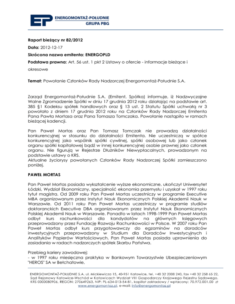 Raport bieżący nr 82/2012 Data: 2012-12-17 Skrócona nazwa emitenta: ENERGOPLD Podstawa prawna: Art. 56 ust. 1 pkt 2 Ustawy o ofercie - informacje bieżące i okresowe Temat: Powołanie Członków Rady Nadzorczej Energomontaż-Południe S.A. Zarząd Energomontaż-Południe S.A. (Emitent, Spółka) informuje, iż Nadzwyczajne Walne Zgromadzenie Spółki w dniu 17 grudnia 2012 roku działając na podstawie art. 385 §1 Kodeksu spółek handlowych oraz § 13 ust. 2 Statutu Spółki uchwałą nr 3 powołało z dniem 17 grudnia 2012 roku na Członków Rady Nadzorczej Emitenta Pana Pawła Mortasa oraz Pana Tomasza Tomczaka. Powołanie nastąpiło w ramach bieżącej kadencji. Pan Paweł Mortas oraz Pan Tomasz Tomczak nie prowadzą działalności konkurencyjnej w stosunku do działalności Emitenta. Nie uczestniczą w spółce konkurencyjnej jako wspólnik spółki cywilnej, spółki osobowej lub jako członek organu spółki kapitałowej bądź w innej konkurencyjnej osobie prawnej jako członek organu. Nie figurują w Rejestrze Dłużników Niewypłacalnych, prowadzonym na podstawie ustawy o KRS. Aktualne życiorysy powołanych Członków Rady Nadzorczej Spółki zamieszczono poniżej. PAWEŁ MORTAS Pan Paweł Mortas posiada wykształcenie wyższe ekonomiczne, ukończył Uniwersytet Łódzki, Wydział Ekonomiczny, specjalność ekonomia przemysłu i uzyskał w 1997 roku tytuł magistra. Od 2009 roku Pan Paweł Mortas uczestniczy w programie Executive MBA organizowanym przez Instytut Nauk Ekonomicznych Polskiej Akademii Nauk w Warszawie. Od 2011 roku Pan Paweł Mortas uczestniczy w programie studiów doktoranckich Executive DBA organizowanym przez Instytut Nauk Ekonomicznych Polskiej Akademii Nauk w Warszawie. Ponadto w latach 1998-1999 Pan Paweł Mortas odbył kurs rachunkowości dla kandydatów na głównych księgowych przeprowadzony przez Fundację Rozwoju Rachunkowości w Polsce. W 2007 roku Pan Paweł Mortas odbył kurs przygotowawczy do egzaminów na doradców inwestycyjnych przeprowadzony w Studium dla Doradców Inwestycyjnych i Analityków Papierów Wartościowych. Pan Paweł Mortas posiada uprawnienia do zasiadania w radach nadzorczych spółek Skarbu Państwa. Przebieg kariery zawodowej: - w 1997 roku miesięczna praktyka w Bankowym Towarzystwie Ubezpieczeniowym "HEROS" SA w Bełchatowie, - w latach 1997-1999 w Tongheung-ZTS Polska Sp. z o.o. w Grójcu kolejno na stanowiskach: specjalista finansowy, szef wydziału ekonomicznego, - w 2001 roku w Medim Sp. z o.o. w Warszawie kolejno na stanowiskach: kontroler finansowy, dyrektor ds. finansowych i organizacyjnych, - w latach 2003-2005 w TBS – Bemowo Sp. z o.o. w Warszawie na stanowisku wiceprezes zarządu (ds. finansowych), - w latach 2003-2005 w TBS – Wola Sp. z o.o. w Warszawie na stanowisku prezes zarządu, - w 2005 roku w TBS – Wola Sp. z o.o. w Warszawie na stanowisku likwidator, - w 2006 roku w TBS – Bemowo Sp. z o.o. w Warszawie na stanowisku prezes zarządu, - w 2007 roku w Kaskada Sp. z o.o. w Warszawie na stanowisku prezes zarządu, - w 2007 roku w BDM Grupa Inwestycyjna S.A. w Warszawie na stanowisku prezes zarządu, - w latach 2007-2009 w ENEA S.A. w Poznaniu kolejno na stanowiskach: p.o. prezesa zarządu, prezes zarządu, - w latach 2009-2010 w ALSTOM Sp. z o.o. w Warszawie na stanowisku doradca, - od 2010 roku i nadal w PBG S.A. (obecnie w upadłości układowej) w Wysogotowie na stanowisku dyrektor ds. organizacji sprzedaży, od 28 października 2012 na stanowisku Prezesa Zarządu, - od 26 listopada 2012 i nadal w RAFAKO S.A. na stanowisku Prezesa Zarządu. Zasiadał w Radzie Nadzorczej spółek: - w latach 2006-2007 w ENEA S.A. w Poznaniu, - w latach 2007-2009 w Elektrownia „Kozienice” S.A. w Świerżu Górnym, - w latach 2008-2009 w CENTRALWINGS Sp. z o.o. w Warszawie. TOMASZ TOMCZAK (ur. 18.08.1972, Poznań) Wykształcenie: 2008- Wielkopolska Szkoła Biznesu przy Akademii Ekonomicznej w Poznaniu, Executive Master of Business Administration realizowany przy współpracy z The Nottingham Trent University 2006- Akademia Górniczo-Hutnicza im. Stanisława Staszica, Świadectwo Ukończenia studiów podyplomowych w zakresie Górnictwo Otworowe Złóż Węglowodorów 2002- Canadian International Management Institute, szkolenie dotyczące trwałego sukcesu i roli menedżera; 1997- Politechnika Poznańska, Wydział Maszyn Roboczych i Pojazdów, Transport, specjalność transport drogowy Przebieg pracy zawodowej: PBG OIL AND GAS Sp. z o.o. - 10.10.2012 – do chwili obecnej - prezes zarządu PBG S.A. (dawniej TECHNOLOGIE GAZOWE PIECOBIOGAZ Sp. z o.o.): 01.04.2005 - do chwil obecnej- wiceprezes zarządu (19.03.2004 - 01.04.2005 - członek zarządu – dyrektor ds. technicznych; 01.04.2000 – 19.03.2004 dyrektor ds. technicznych; 01.05.1999 – 01.04.2000 - szef projektu; 01.03.1998 – 01.05.1999 kierownik robót; 01.01.1998 – 01.03.1998 - asystent zarządu ds. technicznych) „PIECOBIOGAZ„ s.c. J.Wiśniewski, M.Wiśniewska - 08.12.1997 -01.01.1998 – asystent ds. technicznych VOLVO –SERVICE Zbigniew Przymusiński - 03.02.1997 – 30.11.1997 – przedstawiciel handlowy a następnie zastępca service managera Obecnie zasiada w Radach Nadzorczych: PBG TECHNOLOGIA – od 30.04.2009; PBG Energia Sp. z o.o. – od 02.04.2011; RADA PROGRAMOWA FUNDACJA PBG – od 26.10.2010; ENERGOMONTAŻ – POŁUDNIE S.A. – od 17.12.2012 Zaświadczenia: 2004 – Dyrektor Okręgowego Urzędu Górniczego w Poznaniu, Świadectwo do zatrudnienia na stanowisku osoby średniego dozoru technicznego ruchu o specjalności technicznej mechanicznej w zakładach górniczych wydobywających otworami wiertniczymi ropę naftową i gaz ziemny 2004 – Armsystem, zaświadczenie nr 2436/2004 uczestnictwa w szkoleniu „Integracja systemów Wymagania normy PN-EN ISO 14001:1998. Aspekty środowiskowe. Wymagania normy PN-N-18001:2004. Ryzyko zawodowe” 2004 – Gdańska Fundacja Kształcenia Menedżerów – Świadectwo uczestnictwa w szkoleniu F