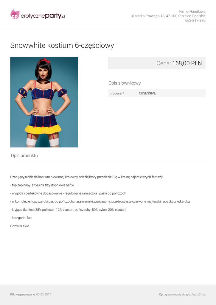 Firma Handlowa ul.Marka Prawego 18, 47-100 Strzelce Opolskie 662-817-870 Snowwhite kostium 6-częściowy Cena: 168,00 PLN Opis słownikowy producent OBSESSIVE Opis produktu Czarujący,niebieski kostium niewinnej królewny śnieżki,który przeniesie Cię w krainę najśmielszych fantazji! - top zapinany z tyłu na trzystopniowe haftki - wygoda i perfekcyjne dopasowanie - regulowane ramiączka i paski do pończoch - w komplecie: top, szeroki pas do pończoch, naramienniki, pończochy, przeźroczyste czerwone majteczki i opaska z kokardką - kryjąca tkanina (88% poliester, 12% elastan; pończochy: 80% nylon, 20% elastan) - kategoria: fun Rozmiar S/M Plik wygenerowano: 03-03-2017 Powered by TCPDF (www.tcpdf.org) Oprogramowanie sklepu: AptusShop