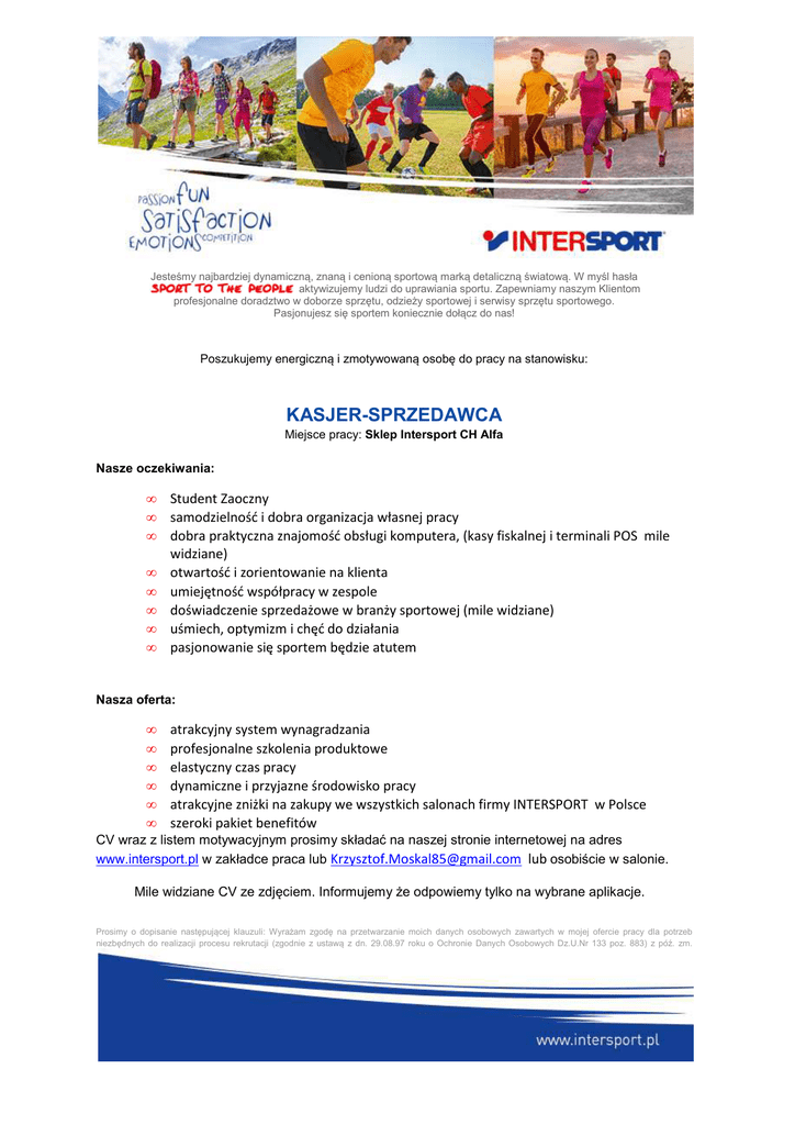 Jesteśmy najbardziej dynamiczną, znaną i cenioną sportową marką detaliczną światową. W myśl hasła aktywizujemy ludzi do uprawiania sportu. Zapewniamy naszym Klientom profesjonalne doradztwo w doborze sprzętu, odzieży sportowej i serwisy sprzętu sportowego. Pasjonujesz się sportem koniecznie dołącz do nas! Poszukujemy energiczną i zmotywowaną osobę do pracy na stanowisku: KASJER-SPRZEDAWCA Miejsce pracy: Sklep Intersport CH Alfa Nasze oczekiwania: • • • • • • • • Student Zaoczny samodzielność i dobra organizacja własnej pracy dobra praktyczna znajomość obsługi komputera, (kasy fiskalnej i terminali POS mile widziane) otwartość i zorientowanie na klienta umiejętność współpracy w zespole doświadczenie sprzedażowe w branży sportowej (mile widziane) uśmiech, optymizm i chęć do działania pasjonowanie się sportem będzie atutem Nasza oferta: • • • • • • atrakcyjny system wynagradzania profesjonalne szkolenia produktowe elastyczny czas pracy dynamiczne i przyjazne środowisko pracy atrakcyjne zniżki na zakupy we wszystkich salonach firmy INTERSPORT w Polsce szeroki pakiet benefitów CV wraz z listem motywacyjnym prosimy składać na naszej stronie internetowej na adres www.intersport.pl w zakładce praca lub [email protected] lub osobiście w salonie. Mile widziane CV ze zdjęciem. Informujemy że odpowiemy tylko na wybrane aplikacje. Prosimy o dopisanie następującej klauzuli: Wyrażam zgodę na przetwarzanie moich danych osobowych zawartych w mojej ofercie pracy dla potrzeb niezbędnych do realizacji procesu rekrutacji (zgodnie z ustawą z dn. 29.08.97 roku o Ochronie Danych Osobowych Dz.U.Nr 133 poz. 883) z póź. zm.