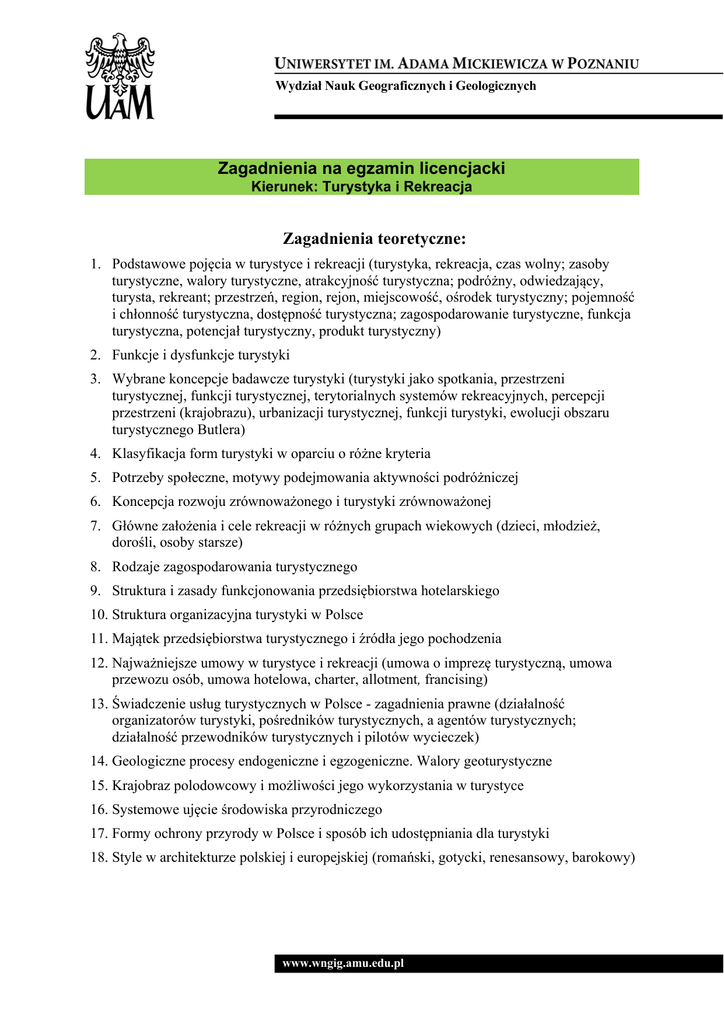 Wydział Nauk Geograficznych i Geologicznych Zagadnienia na egzamin licencjacki Kierunek: Turystyka i Rekreacja Zagadnienia teoretyczne: 1. Podstawowe pojęcia w turystyce i rekreacji (turystyka, rekreacja, czas wolny; zasoby turystyczne, walory turystyczne, atrakcyjność turystyczna; podróżny, odwiedzający, turysta, rekreant; przestrzeń, region, rejon, miejscowość, ośrodek turystyczny; pojemność i chłonność turystyczna, dostępność turystyczna; zagospodarowanie turystyczne, funkcja turystyczna, potencjał turystyczny, produkt turystyczny) 2. Funkcje i dysfunkcje turystyki 3. Wybrane koncepcje badawcze turystyki (turystyki jako spotkania, przestrzeni turystycznej, funkcji turystycznej, terytorialnych systemów rekreacyjnych, percepcji przestrzeni (krajobrazu), urbanizacji turystycznej, funkcji turystyki, ewolucji obszaru turystycznego Butlera) 4. Klasyfikacja form turystyki w oparciu o różne kryteria 5. Potrzeby społeczne, motywy podejmowania aktywności podróżniczej 6. Koncepcja rozwoju zrównoważonego i turystyki zrównoważonej 7. Główne założenia i cele rekreacji w różnych grupach wiekowych (dzieci, młodzież, dorośli, osoby starsze) 8. Rodzaje zagospodarowania turystycznego 9. Struktura i zasady funkcjonowania przedsiębiorstwa hotelarskiego 10. Struktura organizacyjna turystyki w Polsce 11. Majątek przedsiębiorstwa turystycznego i źródła jego pochodzenia 12. Najważniejsze umowy w turystyce i rekreacji (umowa o imprezę turystyczną, umowa przewozu osób, umowa hotelowa, charter, allotment, francising) 13. Świadczenie usług turystycznych w Polsce - zagadnienia prawne (działalność organizatorów turystyki, pośredników turystycznych, a agentów turystycznych; działalność przewodników turystycznych i pilotów wycieczek) 14. Geologiczne procesy endogeniczne i egzogeniczne. Walory geoturystyczne 15. Krajobraz polodowcowy i możliwości jego wykorzystania w turystyce 16. Systemowe ujęcie środowiska przyrodniczego 17. Formy ochrony przyrody w Polsce i sposób ich udostępniania dla turystyki 18. Style w architekturze polskiej i europejskiej (romański, gotycki, renesansowy, barokowy) www.wngig.amu.edu.pl Wydział Nauk Geograficznych i Geologicznych 19. Regionalizacja fizycznogeograficzna, a turystyczna Polski 20. Regiony turystyczne - definiowanie pojęcia, typy regionów i metody ich delimitacji 21. Walory turystyczne Basenu Morza Śródziemnego 22. Walory turystyczne Skandynawii 23. Walory turystyczne państw sąsiadujących z Polską 24. Walory turystyczne regionu alpejskiego 25. Metodyka programowania imprez turystycznych 26. Funkcje pilota wycieczek i przewodnika turystycznego 27. Zasady zachowania turysty w krajach o odmiennej religii, zwyczajach, tradycji i kuchni 28. Metodyka oprowadzania i pilotowania różnych grup turystycznych, przekazywanie treści krajoznawczych 29. Mapa jako źródło informacji w turystyce 30. Współczesne trendy w turystyce i rekreacji Zagadnienia dotyczące regionów i walorów turystycznych Polski: 1. Walory turystyczne Wielkopolski 2. Walory turystyczne polskiej części Wybrzeża Bałtyku 3. Walory turystyczne Pojezierza Pomorskiego 4. Walory turystyczne Pojezierza Mazurskiego 5. Walory turystyczne Gór Świętokrzyskich i okolic 6. Walory turystyczne polskiej części Sudetów 7. Walory turystyczne polskiej części Karpat 8. Walory turystyczne polskiej części Tatr i Podhala 9. Walory turystyczne Dolnego Śląska 10. Walory turystyczne Krakowa i okolic 11. Walory turystyczne Łodzi i okolic 12. Walory turystyczne Poznania i okolic 13. Walory turystyczne Torunia i okolic www.wngig.amu.edu.pl Wydział Nauk Geograficznych i Geologicznych 14. Walory turystyczne Trójmiasta i okolic 15. Walory turystyczne Warszawy i okolic 16. Walory turystyczne Wrocławia i okolic 17. Walory turystyczne województwa podlaskiego www.wngig.amu.edu.pl