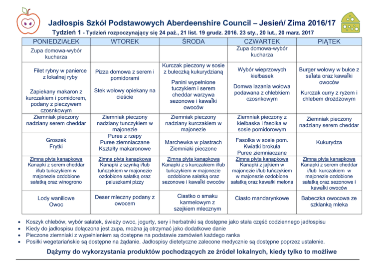 Jadłospis Szkół Podstawowych Aberdeenshire Council – Jesień/ Zima 2016/17 Tydzień 1 - Tydzień rozpoczynający się 24 paź., 21 list. 19 grudz. 2016. 23 sty., 20 lut., 20 marz. 2017 PONIEDZIAŁEK WTOREK ŚRODA CZWARTEK PIĄTEK Zupa domowa-wybór kucharza Zupa domowa-wybór kucharza Filet rybny w panierce z lokalnej ryby Pizza domowa z serem i pomidorami Zapiekany makaron z kurczakiem i pomidorem, podany z pieczywem czosnkowym Ziemniak pieczony nadziany serem cheddar Stek wołowy opiekany na cieście Kurczak pieczony w sosie z bułeczką kukurydzianą Wybór wieprzowych kiełbasek Panini wypełnione tuczykiem i serem cheddar warzywa sezonowe i kawaĪki owoców Domwa lazania wołowa podawana z chlebkiem czosnkowym Burger wołowy w bułce z saĪata oraz kawaĪki owoców Kurczak curry z ryżem i chlebem drożdżowym Ziemniak pieczony nadziany kurczakiem w majonezie Ziemniak pieczony z kielbaska i fasolka w sosie pomidorowym Ziemniak pieczony nadziany serem cheddar Groszek Frytki Ziemniak pieczony nadziany tunczykiem w majonezie Puree z rzepy Puree ziemniaczane Kształty makaronowe Marchewka w plastrach Ziemniaki pieczone Fasolka w sosie pom. Kwiatki brokuła Puree ziemniaczane Kukurydza Zimna płyta kanapkowa Kanapki z serem cheddar i/lub tuńczykiem w majonezie ozdobione sałatką oraz winogrono Zimna płyta kanapkowa Kanapki z szynką i/lub tuńczykiem w majonezie ozdobione sałatką oraz paluszkami pizzy Zimna płyta kanapkowa Kanapki z s kurczakiem i/lub tuńczykiem w majonezie ozdobione sałatką oraz sezonowe i kawaĪki owoców Zimna płyta kanapkowa Kanapki z jajkiem w majonezie i/lub tuńczykiem w majonezie ozdobione sałatką oraz kawałki melona Zimna płyta kanapkowa Kanapki z serem cheddar i/lub kurczakiem w majonezie ozdobione sałatką oraz sezonowe i kawaĪki owoców Lody waniliowe Owoc Deser mleczny podany z owocem Ciasto mandarynkowe Babeczka owocowa ze szklanką mleka Ciastko o smaku karmelowym z szejkiem mlecznym Koszyk chlebów, wybór sałatek, świeży owoc, jogurty, sery i herbatniki są dostępne jako stała część codziennego jadłospisu Kiedy do jadłospisu dołączona jest zupa, można ją otrzymać jako dodatkowe danie Pieczone ziemniaki z wypełnieniem są dostępne na podstawie zamówień każdego ranka Posiłki wegetariańskie są dostępne na żądanie. Jadłospisy dietetyczne zalecone medycznie są dostępne poprzez ustalenie. Dążymy do wykorzystania produktów pochodzących ze źródeł lokalnych, kiedy tylko to możliwe Jadłospis Szkół Podstawowych Aberdeenshire Council – Jesień/ Zima 2016/17 Tydzień 2 - Tydzień rozpoczynający się 31 paź., 28 list. 2016. 2 sty., 30 sty., 27 lut. oraz 27 marz. 2017 PONIEDZIAŁEK WTOREK ŚRODA Zupa domowa-wybór kucharza CZWARTEK PIĄTEK Zupa domowa-wybór kucharza Wybór kiełbasek wieprzowych orasz ‘Yorkshire Pudding’ Indyk panierowany w bułce oraz sezonowe i kawaĪki owoców Filet rybny w panierce z lokalnej ryby Tradycyjny makaron w sosie serowym Kurczak w słodkim chili z ryżem Salatka z szynki i ananasa Ziemniak pieczony nadziany tunczykiem w majonezie Kwiatki brokuła Fasolka w sosie pom. Puree ziemniaczane Wołowina lokalna pieczona w sosie z kukurydzą Ziemniak pieczony nadziewany miesem mielonym Ziemniak pieczony nadziewany w sosie slodkim chilli Ziemniak pieczony wypelniony salatka coleslaw Ziemniak pieczony nadziewany serem cheddar Kapusta duszona Gotowame ziemniaki Groszek Frytki Burak w plastrach Sałatka Coleslaw dom. Ziemniaki krojone w kostkę Marchewka w plastrach Puree ziemniaczane Zimna płyta kanapkowa Kanapki z tuńczykiem w majonezie i/lub serem cheddar ozdobione sałatką oraz winogrono Zimna płyta kanapkowa Kanapki z kurczakiem i/lub szynką ozdobione sałatką z oraz sezonowe i kawaĪki owoców Zimna płyta kanapkowa Kanapki z jajkiem w majonezie i/lub tuńczykiem w majonezie ozdobione sałatką oraz winogrono Zimna płyta kanapkowa Kanapki z szynką i/lub tuńczykiem w majonezie podane z sałatką oraz kawałki melona Zimna płyta kanapkowa Kanapki z serem cheddar i/lub tuńczykiem w majonezie podane z sałatką oraz sezonowe i kawaĪki owoców Ciasto jogurtowoczekoladowe z budyniem Galaretka z owocem Herbatniki otrębowe z napojem mlecznym Galaretka z owocem Ciasto marchewkowe z lukrem Tradycyjny kurczak w cieście Paluszki rybne Mieso wieprzowe pieczone, w bulce Jadłospis Szkół Podstawowych Aberdeenshire Council – Jesień/ Zima 2016/17 Tydzień 3 - Tydzień rozpoczynający się 7 list., 5 grudz. 2016. 9 sty., 6 lut. & 6 marz. 2017 PONIEDZIAŁEK WTOREK ŚRODA CZWARTEK Zupa domowa-wybór kucharza Zupa domowa-wybór kucharza Pizza domowa z serem i pomidorami Kurczak pieczony w sosie z kukurydzą Kremowy makaron z szynką z chlebem czosnkowym Makaron z wolowina w sosie chilli Ziemniak pieczony nadziewany serem cheddar Zieminiak pieczony nadziany wolowina w sosie chilli Kukurydza Puree ziemniaczane Puree z rzepy Kwiatki brokułów Pieczone ziemniaki Zimna płyta Kanapki z serem cheddar i/lub tuńczykiem w majonezie ozdobione sałatką oraz paluszki pizzy Zimna płyta Kanapki z szynką i/lub jajkiem w majonezie ozdobione sałatką oraz winogrono Precel czekoladowy z budyniem Babeczka cytrynowa podana z szejkiem mlecznym Wybór kiełbasek wieprzowych oraz sezonowe i kawaĪki owoców PIĄTEK Filet rybny w panierce z lokalnej ryby Kurczak curry z ryżem i chlebem drożdżowym Gulasz wymieszany z ziemniakami, z ciastkiem otrebowym Ziemniak pieczony nadziany kurczakiem w majonezie Ziemniak pieczony nadziany tunczykiem w majonezie Marchewka w plastrach Fasolka w sosie pom. Sałatka Coleslaw dom. Frytki Spaghetti Bolognaise podane z chlebkiem czosnkowym Zapiekana bułka Panini wypełniona serem cheddar z szynką oraz sezonowe i kawaĪki owoców Ziemniak pieczony z miesem w sosie bolonskim Groszek Zimna płyta Kanapki z serem cheddar i/lub Kurczak z maj. w cieście z sałatką oraz sezonowe i kawaĪki owoców Zimna płyta Kanapki z tuńczykiem w majonezie i/lub szynką ozdobio
