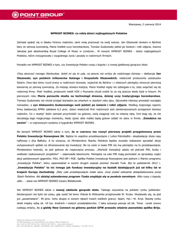 Warszawa, 2 czerwca 2014 WPROST BIZNES: co robią dzieci najbogatszych Polaków Zamiast opalać się w blasku fortuny rodziców, sami wolą pracować na swój sukces. Jan Olszewski otwiera w Berlinie bary ze zdrową żywnością, Maria Voelkel uczy koronkarstwa, Tomasz Gudzowaty jeździ po świecie i robi zdjęcia, Joanna Jakubas jest absolwentką Royal College of Music w Londynie… W nowym WPROST BIZNES - dzieci najbogatszych Polaków, które zrezygnowały z wygodnego życia i posady w rodzinnych firmach. Ponadto we WPROST BIZNES o tym, czy Inwestycje Polskie ruszą z kopyta i o nowej giełdowej gorączce złota. Chcę stworzyć nowego Starbucksa. Jeżeli mi się to uda, na pewno nie wrócę do rodzinnego biznesu – deklaruje Jan Olszewski, syn polskich milionerów Solange i Krzysztofa Olszewskich, właścicieli producenta autobusów Solaris. Dwa lata temu rzucił pracę w rodzinnym biznesie, wyjechał do Berlina i z własnych pieniędzy otworzył pierwszą kawiarnię ze zdrową żywnością. Za miesiąc otwiera kolejną. Maria Voelkel nigdy nie zabiegała o to, żeby wepchać się do rodzinnej firmy. Piotr Voelkel, producent mebli VOX z Poznania chciał zrobić to za nią jeszcze kiedy była w liceum. Po pierwszym roku Maria porzuciła studia na technologii drewna, dzisiaj uczy tradycyjnego koronkarstwa. Tomasz Gudzowaty nie chciał przejąć biznesów po zmarłym w zeszłym roku ojcu. Ojcowskie interesy prowadzi wynajęty menadżer, a syn Aleksandra Gudzowatego woli jeździć po świecie i robić zdjęcia. Według majowego raportu firmy badawczej KPMG zaledwie 6,3 proc. dzieci właścicieli firm rodzinnych jest zainteresowanych przejęciem biznesu rodziców. Co z resztą? Jedni zamiast przychodzić na gotowe, wolą osiągnąć coś na własną rękę. Inni boją się, że nie doczekają tego magicznego momentu, kiedy ojciec albo matka będą gotowi oddać im stery w firmie. „Dziedzice na swoim” – w najnowszym wydaniu e-tygodnika WPROST BIZNES. Na łamach WPROST BIZNES także o tym, że w czerwcu ma ruszyć pierwszy projekt przygotowany przez Polskie Inwestycje Rozwojowe SA. Będzie to wspólne przedsięwzięcie z Lotos Petrobaltic– eksploatacja złoża ropy naftowej z dna Bałtyku. A to oznacza, że Ministerstwo Skarbu Państwa będzie musiało niebawem sprzedać akcje wytypowanych spółek na sfinansowanie tej inwestycji. Bo na razie w kasie PIR nie ma pieniędzy na to przedsięwzięcie. Ministerstwo twierdzi, ze jest gotowe do rozpoczęcia procesu. „Wartość transakcji zależy od potrzeb PIR, liczby i wielkości realizowanych projektów” – odpowiada lakonicznie. Pieniądze na cele PIR mają pochodzić ze sprzedaży części akcji państwowych gigantów: PZU, PKO BP i PGE. Spółka Polskie Inwestycje Rozwojowe jest jednym z filarów programu „Inwestycje Polskie”, który zapowiedział w swoim drugim exposé premier Donald Tusk. Był to październik 2012 r. „Inwestycje Polskie” to nic innego jak fundusz inwestycyjny na kształt działających już od kilku lat w krajach Europy Zachodniej. Żeby całe przedsięwzięcie miało sens, musi zostać odważnie dokapitalizowane przez Skarb Państwa. Ale dzisiaj sztandarowy program Tuska znajduje się w punkcie zwrotnym. Albo ruszy z kopyta, albo… - pisze we WPROST BIZNES Cezary Bielakowski. We WPROST BIZNES także o nowej odsłonie gorączki złota. Takiego ożywienia na polskim rynku jubilerskobiżuteryjnym nie było od czasu, gdy sześć lat temu Vistula & Wólczanka przejmowała W. Kruka. Wydawało się, że jest już „pozamiatane”. 40 proc. tortu skupia w swoich rękach trzech wielkich graczy: Apart, Yes i W. Kruk. Resztę rynku dzieli między sobą ok. 10 tys. średnich i małych przedsiębiorców. I taka sytuacja panuje od lat. Teraz rynek znowu czekają zmiany, bo z giełdy New Connect na główny parkiet GPW przeszła właśnie poznańska spółka Briju. Platforma Mediowa Point Group SA 02-486 Warszawa, Al. Jerozolimskie 212, Batory Office Building II tel. (+48 22) 347 50 00, fax (+48 22) 347 50 01, www.point-group.pl NIP: 521-00-88-831, REGON: 010768408, KRS: 0000051017, Kapitał zakładowy: 103 897 325 zł Chcemy dołączyć do wielkiej trójki. Rynek w Polsce nie jest jeszcze poukładany i jest szansa na zawalczenie z konkurencją – mówi Przemysław Piotrowski, prezes Briju. „Gieldowa gorączka złota” – na łamach WPROST BIZNES. WPROST BIZNES to nowy tygodnik gospodarczy dostępny wyłącznie w formie e-wydania. Tygodnik jest dostępny w formie cyfrowej dla prenumeratorów w systemie dystrybucji e-wydań wydawcy na stronie: ewydanie.wprostbiznes.pl. Magazyn jest także dostępny u wszystkich dystrybutorów prasy cyfrowej oraz na platformach na urządzenia mobilne w formie pojedynczych wydań i prenumeraty. Czytelnicy, którzy kupują papierowe wydanie WPROST, co tydzień znajdą w nim kod dostępu do e-wydania WPROST BIZNES, którym mogą się zalogować na stronie wydawcy. E-tygodnik WPROST BIZNES jest już również dostępny w aplikacji natywnej, zarówno w App Store, jak i w Google Play. Aplikacja na iOS jest dostępna pod adresem: https://itunes.apple.com/us/app/wprost-biznes/id861093888?mt=8. Aplikacja na urządzenia z Androidem - pod adresem:https://play.google.com/store/apps/details?id=pl.wprost.biznes. Ważne linki: - e-wydanie dostępne z kodem i główna strona www www.wprostbiznes.pl - e-wydanie dostępne odpłatnie: www.ewydanie.wprostbiznes.pl Twitter: www.twitter.com/Wprostbiznes, @WprostBiznes FB: www.facebook.com/WprostBiznes LinkedIn: www.linkedin.com/company/wprost-biznes e-mail: [email protected] Platforma Mediowa Point Group SA 02-486 Warszawa, Al. Jerozolimskie 212, Batory Office Building II tel. (+48 22) 347 50 00, fax (+48 22) 347 50 01, www.point-group.pl NIP: 521-00-88-831, REGON: 010768408, KRS: 0000051017, Kapitał zakładowy: 103 897 325 zł
