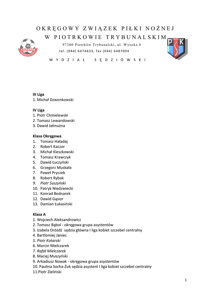 OKRĘGOWY ZWIĄZEK PIŁKI NOŻNEJ W PIOTRKOWIE TRYBUNALSKIM 97300 Piotrków T r ybunalski, ul. W yso ka 6 tel. (044) 6474633, fax (044) 6487004 W Y D Z I A Ł S Ę D Z I O W S K I III Liga 1. Michał Dzwonkowski IV Liga 1. Piotr Chmielewski 2. Tomasz Lewandowski 3. Dawid Jałmużna Klasa Okręgowa 1. Tomasz Haładaj 2. Robert Kaczor 3. Michał Kieszkowski 4. Tomasz Krawczyk 5. Dawid Łuczyński 6. Grzegorz Muskała 7. Paweł Pryczek 8. Robert Rybak 9. Piotr Suszyński 10. Patryk Niedzwiecki 11. Konrad Bednarek 12. Dawid Gąsior 13. Damian Łukasiński Klasa A 1. Wojciech Aleksandrowicz 2. Tomasz Bąbol - okręgowa grupa asystentów 3. Izabela Dróżdż sędzia główna I liga kobiet szczebel centralny 4. Bartłomiej Janiec 5. Piotr Kotarski 6. Marcin Mielczarek 7. Rafał Mielczarek 8. Maciej Muszyński 9. Arkadiusz Nowak - okręgowa grupa asystentów 10. Paulina Socha-Żuk sędzia asystent I liga kobiet szczebel centralny 11.Piotr Zieliński 1 12. Igor Gierasimiuk 13. Krzysztof Koper 14.Przemysław Kowalik 15.Mateusz Król 16.Adrian Łuszcz 17.Łukasz Ryszkiewicz 18.Mariusz Chodorowicz 19. Waldemar Markiewicz Klasa B 1. Rafał Jurek 2. Mateusz Wiewiórowski 3. Łukasz Chmal 4. Wiesław Burzyński 5. Jarosław Dąbrowski 6. Rami Fares 7. Emil Giermata 8. Jan Kaczmarek 9. Andrzej Kozłowski 10. Józef Krajewski 11. Hubert Maj 12. Tomasz Markiewicz 13. Seweryn Miśkiewicz 14. Mikołaj Nowak 15. Tomasz Rośniak 16. Krzysztof Ruszkiewicz 17. Benedykt Siedlecki 18. Łukasz Sigorski 19. Marcin Suma 20. Hubert Trenda 21. Michał Dajcz 22. Karolina Kubiak 23. Arkadiusz Gadomski 24. Paweł Chodorowicz Bezklasowi 1. Filip Barczak 2. Zenon Białas 3. Damian Chmielewski 4. Jakub Kania 5. Dominik Kierczak 6. Andrzej Laskiewicz 7.Michał Ledwan 8. Dawid Peroński 9. Jarosław Psut 10. Michał Sitarz 11. Tobiasz Stolarski 2 12. Rafał Trzmiel 13. Marcin Lewicki 14. Krzysztof Opyd 15. Bartłomiej Rochala 16.Przemysław Męcina 17. Dominik Gaca 18. Dariusz Pieścik KURS 2016 1. Jakub Adamczyk 2. Robert Bora 3. Dawid Cieślak 4. Szymon Cukiernik 5. Dawid Kędzierski 6. Łukasz Koczberski 7. Damian Kugiel 8. Damian Lech 9. Mateusz Mamrot 10. Alan Pluciński 11. Bartłomiej Sidor 12. Rafał Rutowicz 13. Kamil Teresik 14. Krzysztof Wieczorek 15. Łukasz Włodarczyk PRZEWODNICZĄCY WS OZPN w PIOTRKOWIE TRYBUNALSKIM Andrzej Kozłowski 3