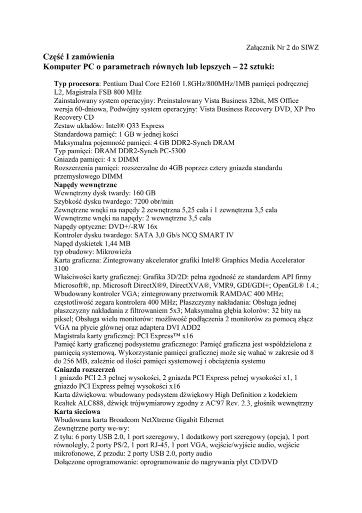 Załącznik Nr 2 do SIWZ Część I zamówienia Komputer PC o parametrach równych lub lepszych – 22 sztuki: Typ procesora: Pentium Dual Core E2160 1.8GHz/800MHz/1MB pamięci podręcznej L2, Magistrala FSB 800 MHz Zainstalowany system operacyjny: Preinstalowany Vista Business 32bit, MS Office wersja 60-dniowa, Podwójny system operacyjny: Vista Business Recovery DVD, XP Pro Recovery CD Zestaw układów: Intel® Q33 Express Standardowa pamięć: 1 GB w jednej kości Maksymalna pojemność pamięci: 4 GB DDR2-Synch DRAM Typ pamięci: DRAM DDR2-Synch PC-5300 Gniazda pamięci: 4 x DIMM Rozszerzenia pamięci: rozszerzalne do 4GB poprzez cztery gniazda standardu przemysłowego DIMM Napędy wewnętrzne Wewnętrzny dysk twardy: 160 GB Szybkość dysku twardego: 7200 obr/min Zewnętrzne wnęki na napędy 2 zewnętrzna 5,25 cala i 1 zewnętrzna 3,5 cala Wewnętrzne wnęki na napędy: 2 wewnętrzne 3,5 cala Napędy optyczne: DVD+/-RW 16x Kontroler dysku twardego: SATA 3,0 Gb/s NCQ SMART IV Napęd dyskietek 1,44 MB typ obudowy: MikrowieŜa Karta graficzna: Zintegrowany akcelerator grafiki Intel® Graphics Media Accelerator 3100 Właściwości karty graficznej: Grafika 3D/2D: pełna zgodność ze standardem API firmy Microsoft®, np. Microsoft DirectX®9, DirectXVA®, VMR9, GDI/GDI+; OpenGL® 1.4.; Wbudowany kontroler VGA; zintegrowany przetwornik RAMDAC 400 MHz; częstotliwość zegara kontrolera 400 MHz; Płaszczyzny nakładania: Obsługa jednej płaszczyzny nakładania z filtrowaniem 5x3; Maksymalna głębia kolorów: 32 bity na piksel; Obsługa wielu monitorów: moŜliwość podłączenia 2 monitorów za pomocą złącz VGA na płycie głównej oraz adaptera DVI ADD2 Magistrala karty graficznej: PCI Express™ x16 Pamięć karty graficznej podsystemu graficznego: Pamięć graficzna jest współdzielona z pamięcią systemową. Wykorzystanie pamięci graficznej moŜe się wahać w zakresie od 8 do 256 MB, zaleŜnie od ilości pamięci systemowej i obciąŜenia systemu Gniazda rozszerzeń 1 gniazdo PCI 2.3 pełnej wysokości, 2 gniazda PCI Express pełnej wysokości x1, 1 gniazdo PCI Express pełnej wysokości x16 Karta dźwiękowa: wbudowany podsystem dźwiękowy High Definition z kodekiem Realtek ALC888, dźwięk trójwymiarowy zgodny z AC'97 Rev. 2.3, głośnik wewnętrzny Karta sieciowa Wbudowana karta Broadcom NetXtreme Gigabit Ethernet Zewnętrzne porty we-wy: Z tyłu: 6 porty USB 2.0, 1 port szeregowy, 1 dodatkowy port szeregowy (opcja), 1 port równoległy, 2 porty PS/2, 1 port RJ-45, 1 port VGA, wejście/wyjście audio, wejście mikrofonowe, Z przodu: 2 porty USB 2.0, porty audio Dołączone oprogramowanie: oprogramowanie do nagrywania płyt CD/DVD Klawiatura: standardowa klawiatura (PS/2) Urządzenie wskazujące: Mysz optyczna PS/2 2-przyciskowa z przewijaniem ZuŜycie energii: Maksymalnie 300 W Zasilanie: Pasywny stabilizator PFC z przełącznikiem napięcia zasilania ustawionym na 230 V — brak stabilizatora PFC, gdy przełącznik napięcia zasilania jest w połoŜeniu 115 V; Zakres napięcia znamionowego 90-140 V lub 180-264 V; Zakres napięcia znamionowego 100-127 V lub 200-240 V; częstotliwość znamionowa linii 50–60 Hz; częstotliwość robocza linii od 47 do 63 Hz; maksymalne napięcie znamionowe 300 W; wentylator 80 mm wbudowany w zasilacz — szybkość obrotów regulowana w celu poprawy akustyki; Pobór mocy w trybie ES — Suspend to RAM (S3) (Instantly Available PC)) Zakres temperatur podczas eksploatacji: Od 10°C do 35°C Dopuszczalna wilgotność względna podczas eksploatacji: od 10 do 90% Dopuszczalna wilgotność względna: od 10 do 95% Gwarancja: minimum 36 miesięcy Serwer PC o parametrach równych lub lepszych – 3 sztuki: Typ procesora: Intel Xeon 3040 Dual Core 1,86 GHz 1,86 GHz, 1 x 2 MB współdzielonej pamięci podręcznej L2, Magistrala FSB 1066 MHz Pamięć podręczna: 1 x 2 MB współuŜytkowanej pamięci podręcznej L2 Pamięć [MB]: 1024 DDR2 PC2-5300 (667 MHz) Gniazda pamięci: 4 gniazda DIMM Maksymalna ilość pamięci: 8 GB Dysk twardy: Jednocalowy dysk SATA 160 GB 7 200 obr./min Wewnętrzne wnęki na napędy: 4 niepodłączane podczas pracy 3,5-calowe dyski SATA/SAS Napędy optyczne: Napęd CD-ROM IDE (ATAPI) 48x Obudowa: Obudowa 4U typu wieŜa Zasilanie: Zasilacz 370 W Port I/O: Równoległe — 0; Szeregowe — 2; Urządzenie wskazujące (mysz, PS2) — 1; Karta graficzna — 1; Klawiatura (PS2) — 1; USB — 6 (2 z tyłu, 2 na panelu przednim, 2 wewnętrzne, w tym 1 do podłączenia napędu taśm USB); Złącza sieciowe RJ-45 (Ethernet) — 1; Zarządzanie: Opcjonalny port na kartę Lights-Out 100c Remote Management Interfejs sieciowy: Wbudowana gigabitowa karta sieciowa PCIe NC320i Gniazdo rozszerzeń: Dwa 32-bitowe gniazda PCI 33 MHz, 3,3 V; Dwa gniazda PCIExpress (x4 i x8, obydwa w złączu x8) Kontrolery dysków: Wbudowany 4-portowy kontroler SATA z wbudowanymi funkcjami RAID Obsługiwane systemy operacyjne: Microsoft® Windows® Server 2003: Standard i Enterprise Edition (32- i 64-bitowy); Microsoft® Windows® Small Business Server 2003; Microsoft® Windows® 2003 Server Web Edition; Novell NetWare 6.5 SBS (wyłącznie wersje późniejsze od wersji z pakietem serwisowym SP6); RedHat Enterprise Linux; SUSE Linux Enterprise Server Gwarancja: minimum 36 miesięcy Notebook z torbą - 5 sztuk: Procesor: Intel® Celeron® M 530 1,73 GHz, 1 MB pamięci podręcznej L2, Magistrala FSB 533 MHz Zestaw układów: Zestaw układów Mobile™ Intel® 960GL Express Wewnętrzny dysk twardy: Serial ATA 120 GB (5400 obr./min) Napędy optyczne: Wbudowany napęd SuperMulti DVD+/-RW z obsługą nośników dwuwarstwowych i technologii LightScribe Typ pamięci: DDR II, 667 MHz, 1024 MB Gniazda pamięci: 2 gniazda SODIMM z obsługą pamięci dwukanałowej Rozszerzenia pamięci: MoŜliwość rozszerzenia do 4096 MB Funkcje wyświetlacza: WXGA BrightView 15,4 cala (rozdzielczość 1280x800) Technologie bezprzewodowe: Broadcom 802.11b/g, karta mini-PCI Faks-modem: