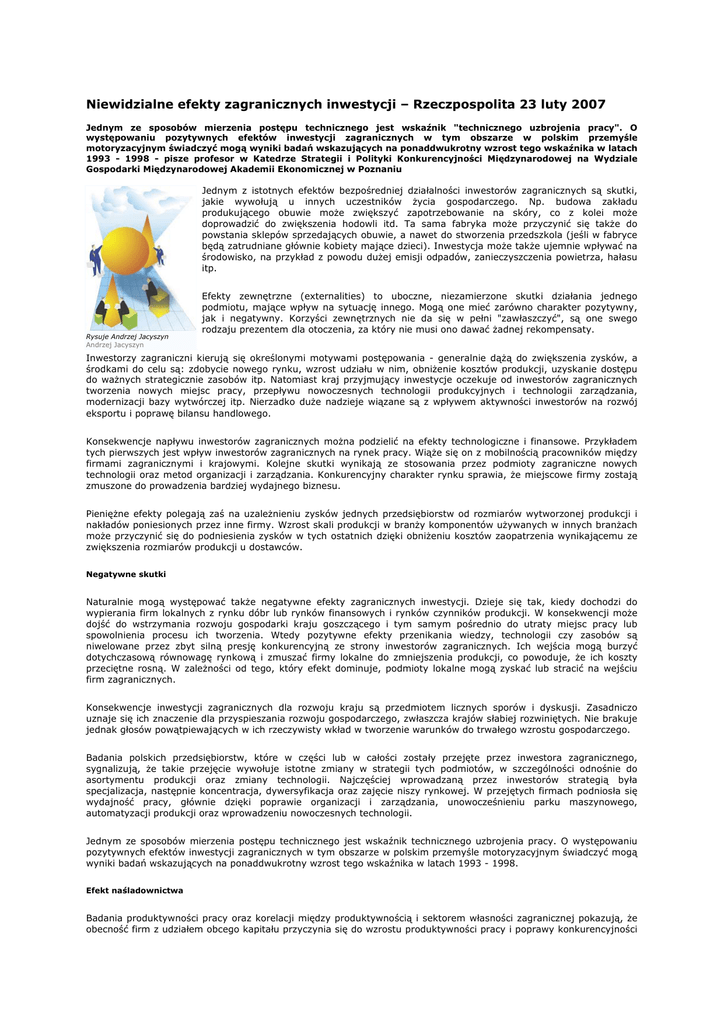 Niewidzialne efekty zagranicznych inwestycji – Rzeczpospolita 23 luty 2007 Jednym ze sposobów mierzenia postępu technicznego jest wskaźnik "technicznego uzbrojenia pracy". O występowaniu pozytywnych efektów inwestycji zagranicznych w tym obszarze w polskim przemyśle motoryzacyjnym świadczyć mogą wyniki badań wskazujących na ponaddwukrotny wzrost tego wskaźnika w latach 1993 - 1998 - pisze profesor w Katedrze Strategii i Polityki Konkurencyjności Międzynarodowej na Wydziale Gospodarki Międzynarodowej Akademii Ekonomicznej w Poznaniu Jednym z istotnych efektów bezpośredniej działalności inwestorów zagranicznych są skutki, jakie wywołują u innych uczestników życia gospodarczego. Np. budowa zakładu produkującego obuwie może zwiększyć zapotrzebowanie na skóry, co z kolei może doprowadzić do zwiększenia hodowli itd. Ta sama fabryka może przyczynić się także do powstania sklepów sprzedających obuwie, a nawet do stworzenia przedszkola (jeśli w fabryce będą zatrudniane głównie kobiety mające dzieci). Inwestycja może także ujemnie wpływać na środowisko, na przykład z powodu dużej emisji odpadów, zanieczyszczenia powietrza, hałasu itp. Rysuje Andrzej Jacyszyn Andrzej Jacyszyn Efekty zewnętrzne (externalities) to uboczne, niezamierzone skutki działania jednego podmiotu, mające wpływ na sytuację innego. Mogą one mieć zarówno charakter pozytywny, jak i negatywny. Korzyści zewnętrznych nie da się w pełni "zawłaszczyć", są one swego rodzaju prezentem dla otoczenia, za który nie musi ono dawać żadnej rekompensaty. Inwestorzy zagraniczni kierują się określonymi motywami postępowania - generalnie dążą do zwiększenia zysków, a środkami do celu są: zdobycie nowego rynku, wzrost udziału w nim, obniżenie kosztów produkcji, uzyskanie dostępu do ważnych strategicznie zasobów itp. Natomiast kraj przyjmujący inwestycje oczekuje od inwestorów zagranicznych tworzenia nowych miejsc pracy, przepływu nowoczesnych technologii produkcyjnych i technologii zarządzania, modernizacji bazy wytwórczej itp. Nierzadko duże nadzieje wiązane są z wpływem aktywności inwestorów na rozwój eksportu i poprawę bilansu handlowego. Konsekwencje napływu inwestorów zagranicznych można podzielić na efekty technologiczne i finansowe. Przykładem tych pierwszych jest wpływ inwestorów zagranicznych na rynek pracy. Wiąże się on z mobilnością pracowników między firmami zagranicznymi i krajowymi. Kolejne skutki wynikają ze stosowania przez podmioty zagraniczne nowych technologii oraz metod organizacji i zarządzania. Konkurencyjny charakter rynku sprawia, że miejscowe firmy zostają zmuszone do prowadzenia bardziej wydajnego biznesu. Pieniężne efekty polegają zaś na uzależnieniu zysków jednych przedsiębiorstw od rozmiarów wytworzonej produkcji i nakładów poniesionych przez inne firmy. Wzrost skali produkcji w branży komponentów używanych w innych branżach może przyczynić się do podniesienia zysków w tych ostatnich dzięki obniżeniu kosztów zaopatrzenia wynikającemu ze zwiększenia rozmiarów produkcji u dostawców. Negatywne skutki Naturalnie mogą występować także negatywne efekty zagranicznych inwestycji. Dzieje się tak, kiedy dochodzi do wypierania firm lokalnych z rynku dóbr lub rynków finansowych i rynków czynników produkcji. W konsekwencji może dojść do wstrzymania rozwoju gospodarki kraju goszczącego i tym samym pośrednio do utraty miejsc pracy lub spowolnienia procesu ich tworzenia. Wtedy pozytywne efekty przenikania wiedzy, technologii czy zasobów są niwelowane przez zbyt silną presję konkurencyjną ze strony inwestorów zagranicznych. Ich wejścia mogą burzyć dotychczasową równowagę rynkową i zmuszać firmy lokalne do zmniejszenia produkcji, co powoduje, że ich koszty przeciętne rosną. W zależności od tego, który efekt dominuje, podmioty lokalne mogą zyskać lub stracić na wejściu firm zagranicznych. Konsekwencje inwestycji zagranicznych dla rozwoju kraju są przedmiotem licznych sporów i dyskusji. Zasadniczo uznaje się ich znaczenie dla przyspieszania rozwoju gospodarczego, zwłaszcza krajów słabiej rozwiniętych. Nie brakuje jednak głosów powątpiewających w ich rzeczywisty wkład w tworzenie warunków do trwałego wzrostu gospodarczego. Badania polskich przedsiębiorstw, które w części lub w całości zostały przejęte przez inwestora zagranicznego, sygnalizują, że takie przejęcie wywołuje istotne zmiany w strategii tych podmiotów, w szczególności odnośnie do asortymentu produkcji oraz zmiany technologii. Najczęściej wprowadzaną przez inwestorów strategią była specjalizacja, następnie koncentracja, dywersyfikacja oraz zajęcie niszy rynkowej. W przejętych firmach podniosła się wydajność pracy, głównie dzięki poprawie organizacji i zarządzania, unowocześnieniu parku maszynowego, automatyzacji produkcji oraz wprowadzeniu nowoczesnych technologii. Jednym ze sposobów mierzenia postępu technicznego jest wskaźnik technicznego uzbrojenia pracy. O występowaniu pozytywnych efektów inwestycji zagranicznych w tym obszarze w polskim przemyśle motoryzacyjnym świadczyć mogą wyniki badań wskazujących na ponaddwukrotny wzrost tego wskaźnika w latach 1993 - 1998. Efekt naśladownictwa Badania produktywności pracy oraz korelacji między produktywnością i sektorem własności zagranicznej pokazują, że obecność firm z udziałem obcego kapitału przyczynia się do wzrostu produktywności pracy i poprawy konkurencyjności technologicznej. Innowacje generowane przez inwestorów zagranicznych przez efekty naśladownictwa, uczenia się oraz kooperacji podlegają procesom dyfuzji. Bardzo interesujących wniosków dostarczają wyniki badań prowadzonych w polskim przemyśle przetwórczym. Wskazują one na znaczenie rodzaju inwestycji zagranicznych dla napływu i dyfuzji wiedzy w gospodarce kraju goszczącego w wyniku działalności podmi