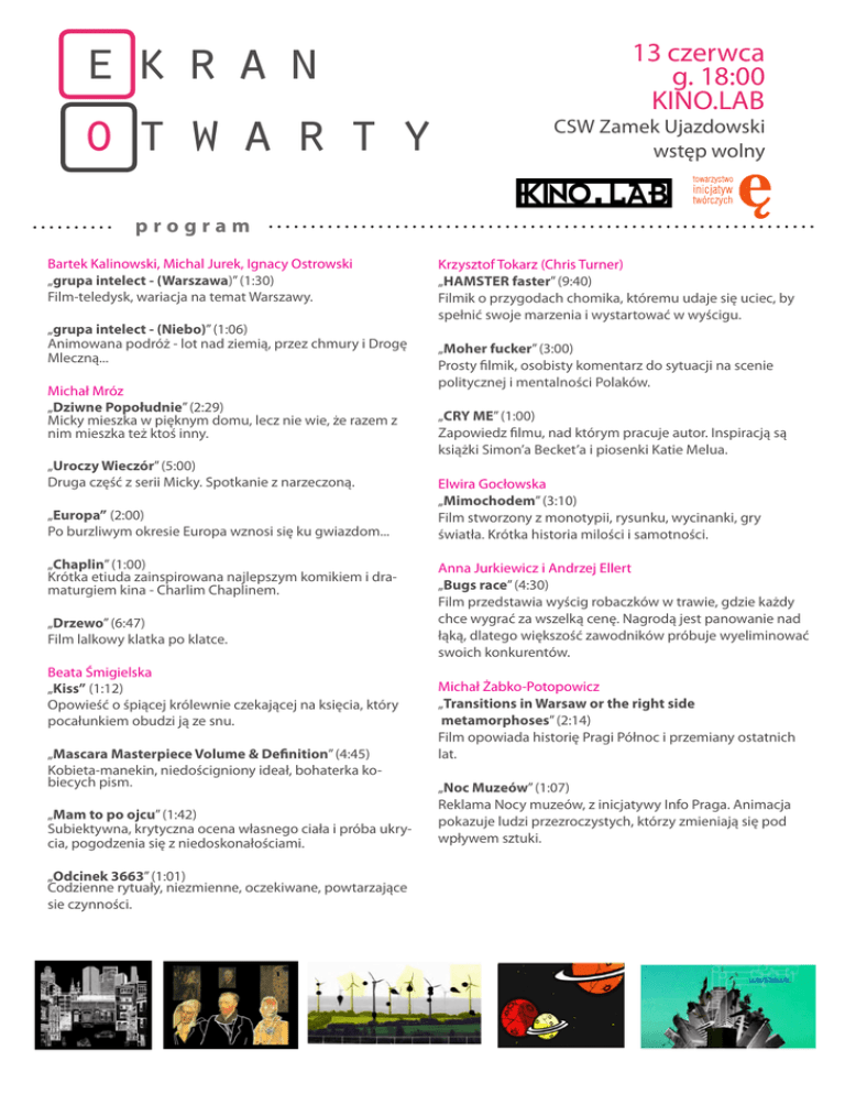 ekran otwarty 13 czerwca g. 18:00 KINO.LAB CSW Zamek Ujazdowski wstęp wolny program Bartek Kalinowski, Michal Jurek, Ignacy Ostrowski „grupa intelect - (Warszawa)” (1:30) Film-teledysk, wariacja na temat Warszawy. „grupa intelect - (Niebo)” (1:06) Animowana podróż - lot nad ziemią, przez chmury i Drogę Mleczną... Michał Mróz „Dziwne Popołudnie” (2:29) Micky mieszka w pięknym domu, lecz nie wie, że razem z nim mieszka też ktoś inny. „Uroczy Wieczór” (5:00) Druga część z serii Micky. Spotkanie z narzeczoną. „Europa” (2:00) Po burzliwym okresie Europa wznosi się ku gwiazdom... „Chaplin” (1:00) Krótka etiuda zainspirowana najlepszym komikiem i dramaturgiem kina - Charlim Chaplinem. „Drzewo” (6:47) Film lalkowy klatka po klatce. Beata Śmigielska „Kiss” (1:12) Opowieść o śpiącej królewnie czekającej na księcia, który pocałunkiem obudzi ją ze snu. „Mascara Masterpiece Volume & Definition” (4:45) Kobieta-manekin, niedościgniony ideał, bohaterka kobiecych pism. „Mam to po ojcu” (1:42) Subiektywna, krytyczna ocena własnego ciała i próba ukrycia, pogodzenia się z niedoskonałościami. „Odcinek 3663” (1:01) Codzienne rytuały, niezmienne, oczekiwane, powtarzające sie czynności. Krzysztof Tokarz (Chris Turner) „HAMSTER faster” (9:40) Filmik o przygodach chomika, któremu udaje się uciec, by spełnić swoje marzenia i wystartować w wyścigu. „Moher fucker” (3:00) Prosty filmik, osobisty komentarz do sytuacji na scenie politycznej i mentalności Polaków. „CRY ME” (1:00) Zapowiedz filmu, nad którym pracuje autor. Inspiracją są książki Simon’a Becket’a i piosenki Katie Melua. Elwira Gocłowska „Mimochodem” (3:10) Film stworzony z monotypii, rysunku, wycinanki, gry światła. Krótka historia milości i samotności. Anna Jurkiewicz i Andrzej Ellert „Bugs race” (4:30) Film przedstawia wyścig robaczków w trawie, gdzie każdy chce wygrać za wszelką cenę. Nagrodą jest panowanie nad łąką, dlatego większość zawodników próbuje wyeliminować swoich konkurentów. Michał Żabko-Potopowicz „Transitions in Warsaw or the right side metamorphoses” (2:14) Film opowiada historię Pragi Północ i przemiany ostatnich lat. „Noc Muzeów” (1:07) Reklama Nocy muzeów, z inicjatywy Info Praga. Animacja pokazuje ludzi przezroczystych, którzy zmieniają się pod wpływem sztuki.