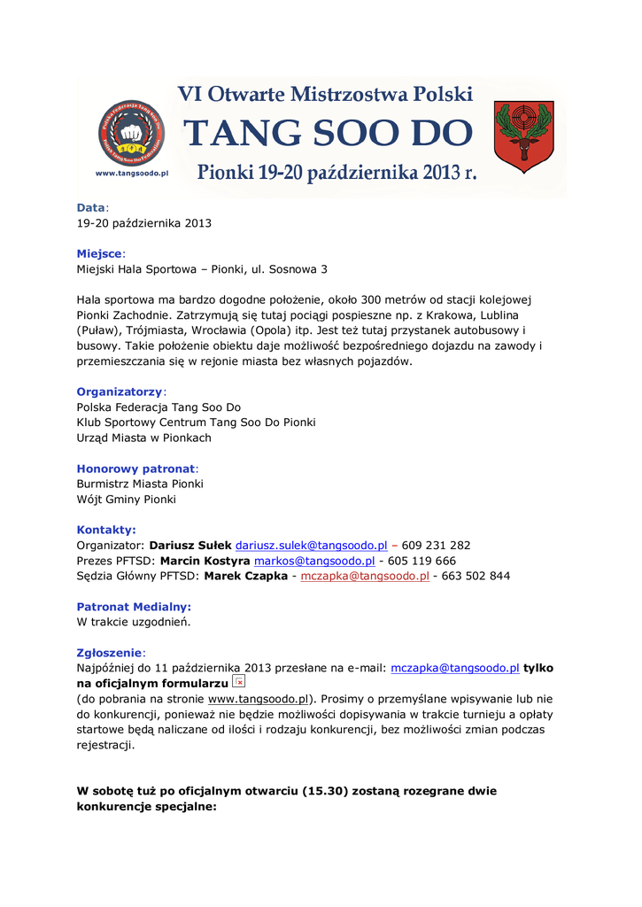 Data: 19-20 października 2013 Miejsce: Miejski Hala Sportowa – Pionki, ul. Sosnowa 3 Hala sportowa ma bardzo dogodne położenie, około 300 metrów od stacji kolejowej Pionki Zachodnie. Zatrzymują się tutaj pociągi pospieszne np. z Krakowa, Lublina (Puław), Trójmiasta, Wrocławia (Opola) itp. Jest też tutaj przystanek autobusowy i busowy. Takie położenie obiektu daje możliwość bezpośredniego dojazdu na zawody i przemieszczania się w rejonie miasta bez własnych pojazdów. Organizatorzy: Polska Federacja Tang Soo Do Klub Sportowy Centrum Tang Soo Do Pionki Urząd Miasta w Pionkach Honorowy patronat: Burmistrz Miasta Pionki Wójt Gminy Pionki Kontakty: Organizator: Dariusz Sułek [email protected] – 609 231 282 Prezes PFTSD: Marcin Kostyra [email protected] - 605 119 666 Sędzia Główny PFTSD: Marek Czapka - [email protected] - 663 502 844 Patronat Medialny: W trakcie uzgodnień. Zgłoszenie: Najpóźniej do 11 października 2013 przesłane na e-mail: [email protected] tylko na oficjalnym formularzu (do pobrania na stronie www.tangsoodo.pl). Prosimy o przemyślane wpisywanie lub nie do konkurencji, ponieważ nie będzie możliwości dopisywania w trakcie turnieju a opłaty startowe będą naliczane od ilości i rodzaju konkurencji, bez możliwości zmian podczas rejestracji. W sobotę tuż po oficjalnym otwarciu (15.30) zostaną rozegrane dwie konkurencje specjalne: 1) Bicie rekordu Polski w kopnięciu dosiężnym! Rekordzista otrzyma nagrodę rzeczową lub pieniężną. Konkurencja OPEN (bez podziałów na wiek, kategorie wzrostowe). 2) Ekstremalne techniki rozbić! – konkurencja OPEN, dla osób powyżej 18 r.ż. Zawodnik prezentuje dowolne i widowiskowe techniki rozbić. Materiały dowolne (np. drewno, lód, metal, pustaki, itp.) – organizator nie zapewnia materiałów. Zwycięzcy (pierwsze trzy miejsca) otrzymają nagrodę rzeczową lub pieniężna. Ramowy program VI MP TSD: Rejestracja i ważenie. Planujemy przeprowadzić 2 razy wagę – w piątek wieczorem i w sobotę wieczorem – tylko dla osób startujących w light kick. Ekipy, które przyjadą w piątek powinny dokonać wszystkich formalności rejestracyjnych już tego dnia. Na wagę stawia się cały klub (chyba, że ktoś dojeżdża tylko na konkurencje light w sobotę wieczorem – ale należy wcześniej uzgodnić to z organizatorem). Ważne – jeśli zawodnik startuje w konkurencji walk semi i light, to waży i mierzy się tylko raz (w piątek). Podczas rejestracji są pobierane opłaty startowe i opłaty za noclegi i wyżywienie (jeśli klub będzie korzystać), będą sprawdzane badania lekarskie i weryfikacja wagi – w tej kolejności. Uwaga – niektóre ekipy pytają o możliwość weryfikacji wagi w sobotę rano. Będzie taka możliwość, jednak, jeśli zawodnik nie zmieści się w kategorii (nie ma żadnej tolerancji wagowej), to zostaje zdyskwalifikowany (dlatego rejestrację zaczynamy od pobrania opłaty startowej). Nie ma możliwości zmiany kategorii w sobotę rano. Piątek 18.10.2013 18.00-21.00 - Waga i rejestracja drużyn Miejska Hala Sportowa ul. Sosnowa 3, Pionki. Sobota 19.10.2013 7.00. - Wywieszenie kategorii do form i drabinek semi contact 7.00.- 8.30. – Przyjmowanie protestów wynikających z błędów rejestracyjnych – po godz. 8.30 tylko skreślamy z listy startujących 8.30.-9.00 – Odprawa sędziów, kierowników ekip, trenerów, asystentów – obecność obowiązkowa 9.00. – Konkurencje form 11.00. – Konkurencje form z bronią 12.00. - Konkurencja technik specjalnych, kopnięcie dosiężne (według rozpiski) - Walki semi - contact (od najniższych kategorii) - Walki touch – contact 14.30.-15.00. - Przerwa obiadowa 15.00. -15.30 – Oficjalne otwarcie VI Otwartych Mistrzostw Polski Tang Soo Do – obecność ekip obowiązkowa 15.30. - Konkurencje specjalne 15.45. – Dalszy ciąg walk semi – contact - Wręczenie medali i dyplomów za rozegrane konkurencje 16.00. - Konkurencja rozbić (od najniższych stopni i najmłodszych) 17.00-18.00 – Weryfikacja wagi zawodników biorących udział w walkach light-kick (tylko jeśli nie biorą udziału w walkach semi-contact) 19.00.-19.30 - Wywieszenie drabinek do light contact, przyjmowanie protestów 19.30. - Zakończenie walk semi – contact. Niedziela 20.10.2013 8.00-8.30. - Przyjmowanie protestów do kategorii (tylko wynikających z błędów sędziowskich) 8.30.-9.00 – Odprawa sędziów, kierowników ekip i trenerów 9.15. – Rozpoczęcie walk light kick (od najlżejszych kategorii - finały i walki o 3 miejsce tuż po rozegraniu kategorii) 13.30.-14.00. – Przerwa obiadowa 14.15. – Wznowienie walk 19:00. – Zakończenie zawodów Uwaga –zgłaszanie protestów do kategorii, tylko na oficjalnych drukach dostępnych u Sędziego Głównego. Uczestnicy: Kluby członkowskie Polskiej Federacji Tang Soo Do, kluby Polskiej Unii Taekwondo. Zawody mają charakter otwarty dla przedstawicieli różnych szkół walki, które zaakceptują regulamin PFTSD. Zawodnicy od rocznika 2005 i starsi. Dla zawodników młodszych możliwość udziału w konkurencjach form. Cel imprezy: Propagowanie Tang Soo Do i idei fair play, szacunku i idei pojednania w sztukach walki oraz międzystylowej rywalizacji, wyłonienie najlepszych zawodników w poszczególnych klubach, promocja miasta Pionki oraz dobrej zabawy poprzez sport. Nagrody: Medale tłoczone i dyplomy za zdobyte miejsca. Konkurencje: 1) Walki touch - contact - walki dla dzieci. 2) Walki semi – contact – młodzicy, kadeci, juniorzy, seniorzy. 3) Walki light - contact - walki tylko dla kadetów. 4) Walki light - kick (ciągła z kopnięciem na udo) - juniorzy i seniorzy. 5) Formy tradycyjne – dla wszystkich grup wiekowych. 6) Formy z bronią - dla wszystkich grup wiekowych. 7) Techniki specjalne - dla wszystkich grup wiekowych. 8) Techniki rozbić desek - dla wszystkich grup wiekowych. Kategorie wiekowe: dziecko 2005-2003 młodzik 2002 - 2001 kadet 2000 - 1998 junior 1997 -