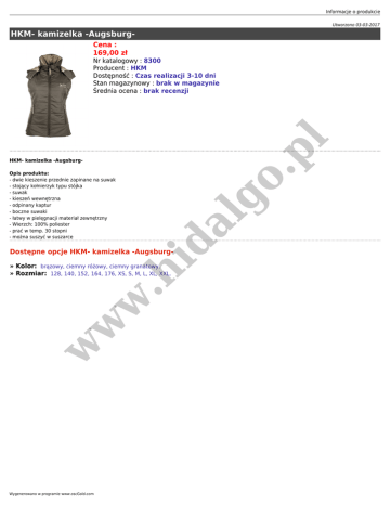 Informacje o produkcie Utworzono 03-03-2017 HKM- kamizelka -AugsburgCena : 169,00 zł .p l Nr katalogowy : 8300 Producent : HKM Dostępność : Czas realizacji 3-10 dni Stan magazynowy : brak w magazynie Średnia ocena : brak recenzji HKM- kamizelka -Augsburg- id al go Opis produktu: - dwie kieszenie przednie zapinane na suwak - stojący kołnierzyk typu stójka - suwak - kieszeń wewnętrzna - odpinany kaptur - boczne suwaki - łatwy w pielęgnacji materiał zewnętrzny - Wierzch: 100% poliester - prać w temp. 30 stopni - można suszyć w suszarce Dostępne opcje HKM- kamizelka -Augsburg- w w w .h » Kolor: brązowy, ciemny różowy, ciemny granatowy. » Rozmiar: 128, 140, 152, 164, 176, XS, S, M, L, XL, XXL. Wygenerowano w programie www.oscGold.com
