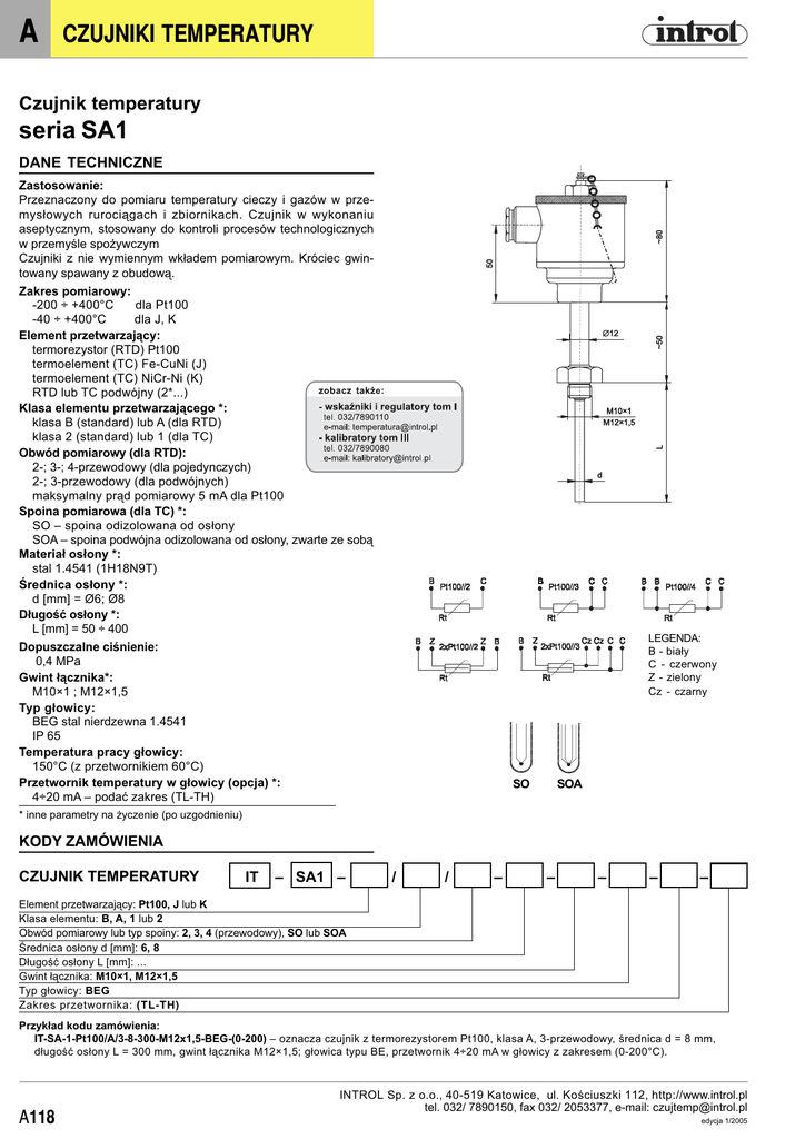 A CZUJNIKI TEMPERATURY Czujnik temperatury seria SA1 DANE TECHNICZNE TECHNICZNE 12 ~50 50 ~80 Zastosowanie: Przeznaczony do pomiaru temperatury cieczy i gazów w przemysłowych rurociągach i zbiornikach. Czujnik w wykonaniu aseptycznym, stosowany do kontroli procesów technologicznych w przemyśle spożywczym Czujniki z nie wymiennym wkładem pomiarowym. Króciec gwintowany spawany z obudową. Zakres pomiarowy: -200 ÷ +400°C dla Pt100 -40 ÷ +400°C dla J, K Element przetwarzający: termorezystor (RTD) Pt100 termoelement (TC) Fe-CuNi (J) termoelement (TC) NiCr-Ni (K) RTD lub TC podwójny (2*...) Klasa elementu przetwarzającego *: klasa B (standard) lub A (dla RTD) klasa 2 (standard) lub 1 (dla TC) Obwód pomiarowy (dla RTD): 2-; 3-; 4-przewodowy (dla pojedynczych) 2-; 3-przewodowy (dla podwójnych) maksymalny prąd pomiarowy 5 mA dla Pt100 Spoina pomiarowa (dla TC) *: SO – spoina odizolowana od osłony SOA – spoina podwójna odizolowana od osłony, zwarte ze sobą Materiał osłony *: stal 1.4541 (1H18N9T) Średnica osłony *: d [mm] = Ø6; Ø8 Długość osłony *: L [mm] = 50 ÷ 400 Dopuszczalne ciśnienie: 0,4 MPa Gwint łącznika*: M10×1 ; M12×1,5 Typ głowicy: BEG stal nierdzewna 1.4541 IP 65 Temperatura pracy głowicy: 150°C (z przetwornikiem 60°C) Przetwornik temperatury w głowicy (opcja) *: 4÷20 mA – podać zakres (TL-TH) L M10×1 M12×1,5 d LEGENDA: B - bia³y C - czerwony Z - zielony Cz - czarny SO SOA * inne parametry na życzenie (po uzgodnieniu) KODY ZAMÓWIENIA CZUJNIK TEMPERATURY IT – SA1 – / / – – – – – Element przetwarzający: Pt100, J lub K Klasa elementu: B, A, 1 lub 2 Obwód pomiarowy lub typ spoiny: 2, 3, 4 (przewodowy), SO lub SOA Średnica osłony d [mm]: 6, 8 Długość osłony L [mm]: ... Gwint łącznika: M10×1, M12×1,5 Typ głowicy: BEG Zakres przetwornika: (TL-TH) Przykład kodu zamówienia: IT-SA-1-Pt100/A/3-8-300-M12x1,5-BEG-(0-200) – oznacza czujnik z termorezystorem Pt100, klasa A, 3-przewodowy, średnica d = 8 mm, długość osłony L = 300 mm, gwint łącznika M12×1,5; głowica typu BE, przetwornik 4÷20 mA w głowicy z zakresem (0-200°C). A118 INTROL Sp. z o.o., 40-519 Katowice, ul. Ko ściusz ki 112, http://www.introl.pl tel. 032/ 7890150, fax 032/ 2053377, e-mail: [email protected] edycja 1/2005