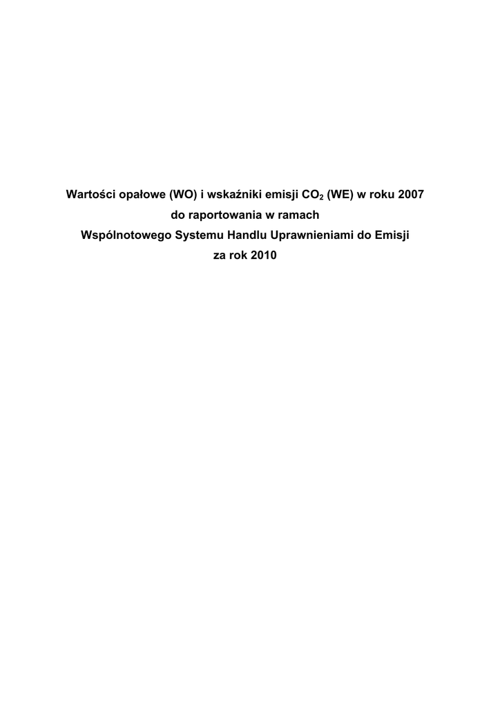 Wartości opałowe (WO) i wskaźniki emisji CO2 (WE) w roku 2007 do raportowania w ramach Wspólnotowego Systemu Handlu Uprawnieniami do Emisji za rok 2010 Prezentowane tabele zawierają dane na temat wartości opałowych (WO) i wskaźników emisji CO2 (WE) dla paliw wykorzystywanych w gospodarce krajowej w 2007 roku. W tabelach 1-11 zestawione zostały krajowe wartości WO i WE dla węgla dla poszczególnych rodzajów działalności (jeżeli wg danych statystycznych występowało w danym dziale zużycie tego paliwa). Wskaźniki emisji zestawione w tych tabelach odpowiadają wyłącznie podanej dla nich wartości opałowej. W tabeli 12 podane zostały wskaźniki emisji CO2 dla pozostałych paliw. Wartości tych wskaźników emisji oparte są na domyślnych wskaźnikach emisji C podawanych w wytycznych IPCC (wartości dla biomasy i odpadów pochodzą z 2006 IPCC Guidelines for National Greenhouse Gas Inventories, a dla pozostałych paliw z Revised 1996 IPCC Guidelines for National Greenhouse Gas Inventories) i mogą być stosowane niezależnie od rodzaju działalności. Wartości opałowe w tabeli 12 (pochodzące z wytycznych IPCC) zostały podane w celach informacyjnych dla ułatwienia raportowania przez operatorów instalacji. Podmioty nie są zobligowane do stosowania wskaźnika emisji w połączeniu z podaną w tej tabeli wartością opałową. Wartości opałowe przedstawione w tabeli 12 nie są stosowane w krajowej inwentaryzacji emisji gazów cieplarnianych. Dodatkowo zamieszczona została tabela 13, w której podano wartości wskaźników emisji CO2 dla węgla kamiennego i brunatnego, obliczone na podstawie średnich krajowych wartości opałowych dla tych paliw (średnie wartości WO dla węgla kamiennego i brunatnego wyliczono na podstawie krajowego bilansu tych paliw dla roku 2007, przygotowanego w oparciu o dane zgodne z podanymi dla Polski w bazie Eurostatu). Wskaźniki emisji z tej tabeli mogą być wykorzystane przez operatorów instalacji tylko w przypadku, kiedy w danej instalacji zużywany był węgiel a w tabeli odpowiadającej danemu rodzajowi działalności (tab. 1-11) nie ma wartości WO i WE dla węgla (może to mieć miejsce w sytuacji, kiedy zużycie węgla w danej branży było tak niewielkie, że nie zostało wykazane w statystyce ogólnokrajowej). Emisji CO2 ze spalania biomasy (drewna opałowego i odpadów pochodzenia drzewnego, odpadów komunalnych biogenicznych i biogazu) nie wlicza się do sumy emisji ze spalania paliw, zgodnie z zasadami Wspólnotowego systemu handlu uprawnieniami do emisji oraz IPCC. Podejście to jest równoważne stosowaniu zerowego wskaźnika emisji dla biomasy. Współczynnik utlenienia jest już uwzględniony w wartości wskaźnika emisji danego paliwa. Wartości z tabel zawierających wskaźniki emisji i wartości opałowe dla węgla (tab. 1-11) należy wykorzystywać stosownie do podstawowego rodzaju działalności (PKD) wpisywanego na sprawozdaniach G-02 i G-03. Dla poszczególnych rodzajów działalności w niniejszym opracowaniu dane są umieszczone następująco: Rodzaj działalności Nr tabeli produkcja energii elektrycznej i ciepła w elektrowniach i elektrociepłowniach zawodowych 1 produkcja energii elektrycznej i ciepła w elektrociepłowniach przemysłowych 2 produkcja ciepła w ciepłowniach 3 koksownie 4 produkcja metali - stopy żelaza (PKD dział 27) 5 produkcja chemikaliów i wyrobów chemicznych (dział 24) 6 produkcja celulozowo-papiernicza (dział 21) oraz działalność wydawnicza i poligraficzna (dział 22) 7 produkcja artykułów spożywczych napojów i tytoniu (dział 15 oraz 16) 8 kopalnictwo surowców nieenergetycznych (dział 13 i 14), włókiennictwo (dział 17), produkcja odzieży oraz futrzarstwo (dział 18), obróbka skóry i produkcja wyrobów ze skóry (dział 19), produkcja drewna i wyrobów z drewna (dział 20), produkcja wyrobów z gumy i tworzyw sztucznych (dział 25), produkcja wyrobów z pozostałych surowców niemetalicznych, która obejmuje m.in. produkcję cementu, wapna, szkła i ceramiki (dział 26), produkcja wyrobów z metali, bez maszyn i urządzeń (dział 28), produkcja maszyn i urządzeń (dział 29 oraz 30), produkcja maszyn i aparatury elektrycznej, radiowej, telewizyjnej i komunikacyjnej (dział 31 oraz 32), produkcja instrumentów medycznych, precyzyjnych i optycznych (dział 33), produkcja pojazdów mechanicznych i innego sprzętu transportowego (dział 34 oraz 35), produkcja mebli - i pozostała działalność produkcyjna (dział 36), zagospodarowanie odpadów (dział 37), zaopatrywanie w gaz (grupa 40.2) zaopatrywanie w wodę (dział 41) 9 handel /usługi/ instytucje 10 rolnictwo / leśnictwo /rybołówstwo 11 Dla pozostałych paliw (innych niż węgiel) stosuje się wartości z tabeli 12, niezależnie od podstawowego rodzaju działalności (PKD). Wartości opałowe (WO) i wskaźniki emisji CO2 (WE) w roku 2007 do raportowania we Wspólnotowym Systemie Handlu Uprawnieniami do Emisji za rok 2010 Tabela 1. ELEKTROWNIE I ELEKTROCIEPŁOWNIE ZAWODOWE RODZAJ PALIWA Węgiel kamienny Węgiel brunatny Tabela 2. ELEKTROCIEPŁOWNIE PRZEMYSŁOWE RODZAJ PALIWA Węgiel kamienny Tabela 3. CIEPŁOWNIE RODZAJ PALIWA Węgiel kamienny Węgiel brunatny Tabela 4. KOKSOWNIE RODZAJ PALIWA Węgiel kamienny Tabela 5. Produkcja metali - Stopy żelaza (dział 27) RODZAJ PALIWA Węgiel kamienny Tabela 6. Produkcja chemikaliów i wyrobów chemicznych (dział 24) RODZAJ PALIWA Węgiel kamienny Tabela 7. Produkcja celulozowo-papiernicza (dział 21) oraz działalność wydawnicza i poligraficzna (dział 22) RODZAJ PALIWA Węgiel kamienny WO MJ/kg 21,10 8,85 WE CO2 kg/GJ 94,42 108,74 WO MJ/kg 21,51 WE CO2 kg/GJ 94,86 WO MJ/kg 21,65 8,81 WE CO2 kg/GJ 94,82 107,54 WO MJ/kg 24,93 WE CO2 kg/GJ 94,10 WO MJ/kg 23,87 WE CO2 kg/GJ 94,31 WO MJ/kg 23,87 WE CO2 kg/GJ 94,31 WO MJ/kg 23,87 WE CO2 kg/GJ 94,31 Tabela 8. Produkcja artykułów spożywczych napojów i tytoniu (dział 15 oraz 16) RODZAJ PALIWA WO MJ/kg Węgiel k