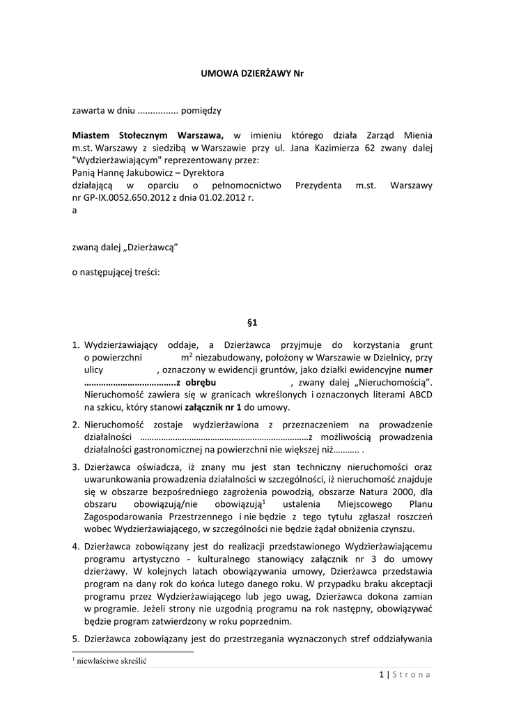 UMOWA DZIERŻAWY Nr zawarta w dniu ................ pomiędzy Miastem Stołecznym Warszawa, w imieniu którego działa Zarząd Mienia m.st. Warszawy z siedzibą w Warszawie przy ul. Jana Kazimierza 62 zwany dalej "Wydzierżawiającym" reprezentowany przez: Panią Hannę Jakubowicz – Dyrektora działającą w oparciu o pełnomocnictwo Prezydenta m.st. Warszawy nr GP-IX.0052.650.2012 z dnia 01.02.2012 r. a zwaną dalej „Dzierżawcą” o następującej treści: §1 1. Wydzierżawiający oddaje, a Dzierżawca przyjmuje do korzystania grunt o powierzchni m2 niezabudowany, położony w Warszawie w Dzielnicy, przy ulicy , oznaczony w ewidencji gruntów, jako działki ewidencyjne numer ………………………………..z obrębu , zwany dalej „Nieruchomością”. Nieruchomość zawiera się w granicach wkreślonych i oznaczonych literami ABCD na szkicu, który stanowi załącznik nr 1 do umowy. 2. Nieruchomość zostaje wydzierżawiona z przeznaczeniem na prowadzenie działalności ………………………………………………………………z możliwością prowadzenia działalności gastronomicznej na powierzchni nie większej niż……….. . 3. Dzierżawca oświadcza, iż znany mu jest stan techniczny nieruchomości oraz uwarunkowania prowadzenia działalności w szczególności, iż nieruchomość znajduje się w obszarze bezpośredniego zagrożenia powodzią, obszarze Natura 2000, dla obszaru obowiązują/nie obowiązują1 ustalenia Miejscowego Planu Zagospodarowania Przestrzennego i nie będzie z tego tytułu zgłaszał roszczeń wobec Wydzierżawiającego, w szczególności nie będzie żądał obniżenia czynszu. 4. Dzierżawca zobowiązany jest do realizacji przedstawionego Wydzierżawiającemu programu artystyczno - kulturalnego stanowiący załącznik nr 3 do umowy dzierżawy. W kolejnych latach obowiązywania umowy, Dzierżawca przedstawia program na dany rok do końca lutego danego roku. W przypadku braku akceptacji programu przez Wydzierżawiającego lub jego uwag, Dzierżawca dokona zamian w programie. Jeżeli strony nie uzgodnią programu na rok następny, obowiązywać będzie program zatwierdzony w roku poprzednim. 5. Dzierżawca zobowiązany jest do przestrzegania wyznaczonych stref oddziaływania 1 niewłaściwe skreślić 1|Strona akustycznego oraz obowiązujących przepisów dotyczących dopuszczalnych poziomów hałasu w środowisku, co oznacza niedopuszczenie do emisji dźwięku z terenu dzierżawionego poza wyznaczoną strefę oddziaływania akustycznego, której granice zostały określone w załączniku nr 4 do umowy. §2 1. Okres dzierżawy ustala się od dnia …………………………..2015 r. do dnia ……………….. r. 2. Wznoszenie jakichkolwiek obiektów trwale bądź nietrwale związanych z gruntem wymaga pisemnej zgody Wydzierżawiającego. Wysokość ani charakter nakładów poniesionych na zagospodarowanie terenu nie będzie stanowić podstawy do domagania się przedłużenia umowy dzierżawy, jak również do zgłaszania przez Dzierżawcę jakichkolwiek innych roszczeń wobec Wydzierżawiającego po wygaśnięciu umowy. 3. Przekazanie Dzierżawcy przedmiotu dzierżawy, a także jego odbiór po zakończeniu dzierżawy odbywać się będzie na podstawie protokołów zdawczo - odbiorczych. §3 1. Strony ustalają miesięczną stawkę czynszu dzierżawnego: 1.1. w sezonie tj. w okresie …………………….: w kwocie netto …………….zł (słownie: ………………….. złotych netto), 1.2. poza sezonem tj. w okresie ………………………………: w kwocie netto ……………… zł (słownie: …………………… złotych netto). 1.3. Kwota czynszu będzie każdorazowo powiększona o podatek VAT, ustalony według obowiązującej stawki, która w dniu zawarcia umowy wynosi 23%. 2. Wpłat z tytułu czynszu należy dokonywać z góry przelewem na konto Wydzierżawiającego w Banku Handlowym w Warszawie S.A. Nr 64 1030 1508 0000 0005 5004 1006 w terminie do dnia 10-tego każdego miesiąca, niezależnie od terminu doręczenia faktury. 3. Nie nalicza się czynszu dzierżawnego za dni, w których z powodu wysokich stanów wód rzeki Wisły korzystanie z terenu dzierżawnego nie jest możliwe, tj. przy stanach wód przekraczających ………………………………………. na wodowskazie Warszawa Port. 4. Dzierżawca zgodnie z ustawą z dnia 12.01.1991 r. o podatkach i opłatach lokalnych (jt. Dz. U. z 2014 r. poz.849) jest zobowiązany uiścić podatek od nieruchomości w Wydziale Budżetowo - Księgowym Urzędu Dzielnicy ………………………... W tym zakresie ma on również obowiązek przedstawienia Wydzierżawiającemu kopii deklaracji podatkowej lub zaświadczenia o zwolnieniu z obowiązku uiszczenia podatku od nieruchomości. 5. Przy dokonywaniu wpłat należy podać numer umowy dzierżawy. §4 1. W przypadku opóźnienia w zapłacie czynszu Wydzierżawiający będzie upoważniony do naliczenia odsetek ustawowych. 2. Dwumiesięczne opóźnienie w zapłacie czynszu lub opłat eksploatacyjnych za dwa okresy rozliczeniowe, w tym odmowa zapłaty czynszu podwyższonego zgodnie z § 5 stanowić będzie podstawę do rozwiązania umowy bez zachowania okresu 2|Strona wypowiedzenia, jeżeli Dzierżawca po udzieleniu mu dodatkowego miesięcznego terminu nie dokona zapłaty zaległego czynszu. 3. Nie realizowanie przez Dzierżawcę wcześniej przedstawionego i zatwierdzonego przez Wydzierżawiającego programu będzie podstawą do rozwiązania umowy bez zachowania trzymiesięcznego okresu wypowiedzenia. 4. Zmiana sposobu zagospodarowania terenu przedstawionego w ofercie i zatwierdzonego przez Wydzierżawiającego będzie podstawą do rozwiązania umowy bez zachowania trzymiesięcznego okresu wypowiedzenia. 5. W przypadku korzystania z nieruchomości bez tytułu prawnego Dzierżawca zobowiązuje się do zapłaty Wydzierżawiającemu wynagrodzenia za bezumowne korzystanie z nieruchomości w wysokości 200%