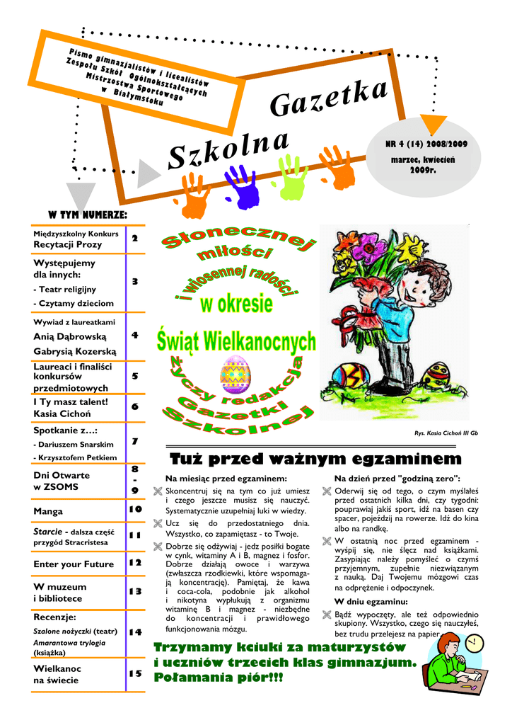 Pism o gim Zesp nazj ołu Szkó al istów i l ł Mist rzos Ogólnok icealistó twa szta łcąc w Sp w B ych iałym ortoweg o stok u S a k t e Ga z a n l o zk NR 4 (14) 2008/2009 marzec, kwiecień 2009r. W TYM NUMERZE: Międzyszkolny Konkurs Recytacji Prozy Występujemy dla innych: - Teatr religijny 2 3 - Czytamy dzieciom Wywiad z laureatkami Anią Dąbrowską 4 Gabrysią Kozerską Laureaci i finaliści konkursów przedmiotowych I Ty masz talent! Kasia Cichoń 5 6 Spotkanie z…: - Dariuszem Snarskim Rys. Kasia Cichoń III Gb 7 - Krzysztofem Petkiem Dni Otwarte w ZSOMS 8 9 Manga 10 Starcie - dalsza część 11 przygód Stracristesa Enter your Future 12 W muzeum i bibliotece 13 Recenzje: Szalone noŜyczki (teatr) Amarantowa trylogia (ksiąŜka) Wielkanoc na świecie 14 15 TuŜ przed waŜnym egzaminem Na miesiąc przed egzaminem: Skoncentruj się na tym co juŜ umiesz i czego jeszcze musisz się nauczyć. Systematycznie uzupełniaj luki w wiedzy. Ucz się do przedostatniego dnia. Wszystko, co zapamiętasz - to Twoje. Dobrze się odŜywiaj - jedz posiłki bogate w cynk, witaminy A i B, magnez i fosfor. Dobrze działają owoce i warzywa (zwłaszcza rzodkiewki, które wspomagają koncentrację). Pamiętaj, Ŝe kawa i coca-cola, podobnie jak alkohol i nikotyna wypłukują z organizmu witaminę B i magnez - niezbędne do koncentracji i prawidłowego funkcjonowania mózgu. Na dzień przed "godziną zero": Oderwij się od tego, o czym myślałeś przed ostatnich kilka dni, czy tygodni: pouprawiaj jakiś sport, idź na basen czy spacer, pojeździj na rowerze. Idź do kina albo na randkę. W ostatnią noc przed egzaminem wyśpij się, nie ślęcz nad ksiąŜkami. Zasypiając naleŜy pomyśleć o czymś przyjemnym, zupełnie niezwiązanym z nauką. Daj Twojemu mózgowi czas na odpręŜenie i odpoczynek. W dniu egzaminu: Bądź wypoczęty, ale teŜ odpowiednio skupiony. Wszystko, czego się nauczyłeś, bez trudu przelejesz na papier. Trzymamy kciuki za maturzystów i uczniów trzecich klas gimnazjum. Połamania piór!!! PISMO GIMNAZJALISTÓW I LICEALISTÓW ZSOMS W BIAŁYMSTOKU Zdarzyło się... kwiecień1025 Koronacja Bolesława Chrobrego Był to pierwszy koronowany władca Polski. Panował 33 lata, lecz królem został dopiero przed śmiercią. Dokładna data koronacji nie jest znana. Lecz niektórzy historycy twierdzą, Ŝe nastąpiła ona podczas Wielkanocy 1025 roku. 30.04.1916 Pierwsza zmiana czasu zimowego na letni KaŜdego roku, w nocy z ostatniej soboty na ostatnią niedzielę marca i w nocy z ostatniej soboty na ostatnią niedzielę października przestawiamy wskazówki naszych zegarków. Zmiana czasu po raz pierwszy została wcielona w Ŝycie w Niemczech. Było to podczas I wojny światowej. W nocy 30 kwietnia 1916 r. wskazówki niemieckich zegarów zostały posunięte o godzinę do przodu. Wkrótce za tym przykładem poszły równieŜ inne państwa. 31.03.1889 Zakończenie budowy WieŜy Eiffla Na całym świecie nie ma chyba bardziej znanej budowli niŜ WieŜa Eiffla. Przez Francuzów często jest nazywana „najpiękniejszą paryŜanką”. Składana była przy uŜyciu drewnianych rusztowań i małych, parowych Ŝurawi, które „wchodziły” coraz wyŜej po torach przeznaczonych dla wind. Za ich pomocą wciągano na górę poszczególne elementy wieŜy. Opr. Marta Golc III Gd IV Międzyszkolny Konkurs Recytacji Prozy III m. - Urszula Czochańska - PG 9 w Białymstoku wyróŜnienie - Sandra Małaszewicz - PG 1 w Białymstoku wyróŜnienie - Tadeusz Czemiel - PG w Michałowie Wręczenie nagród 21 lutego 2009 r. w naszej szkole odbył się finał IV Międzyszkolnego Konkursu Recytacji Prozy pod honorowym patronatem Prezydenta Miasta Białegostoku oraz Marszałka Województwa Podlaskiego. Mottem były słowa Antoine'a de Saint-Exupéry'ego: „Czy nie lepiej byłoby, zamiast tępić zło, szerzyć dobro?”. W szranki stanęli uczniowie zarówno gimnazjów jak i liceów. Poziom był bardzo wysoki, a jury miało duŜe trudności z wytypowaniem zwycięzców, którzy otrzymali cenne nagrody ksiąŜkowe. Jury w składzie: Anna Danilewicz (asystentka dyrektora Teatru Dramatycznego), Katarzyna Zalesko (nauczycielka jęz. polskiego w ZSOMS), Agnieszka Budrecka (nauczycielka jęz. polskiego w Zespole Szkół Rolniczych) przyznało następujące wyróŜnienia: Gimnazjum: I m. - Sylwia Michnowicz - PG 1 w Białymstoku II m. - Magda Stelmach - PG w Zabłudowie Str. 2 Szkoły ponadgimnazjalne: I m. - Karolina Bielwska - I LO w Białymstoku II m. - Aleksandra Ołdzijewicz - I LO w Białymstoku III m. - Justyna Gawełko - III LO w Białymstoku wyróŜnienie - Paula Milewska - XIII LO w Białymstoku wyróŜnienie - Marzena Popławska - Zespół Szkół Rolniczych w Białymstoku Konkurs zorganizowali nauczyciele języka polskiego ZSOMS: ElŜbieta Badońska, Sylwia Dunda, Marzena Kościuszko, Anna MóŜdŜyńska, Katarzyna Zalesko i Mariusz Cybulko. Informacje za stroną WWW.zsoms.bialystok.pl Paula Milewska, uczennica XIII LO – recytatorka wyróŜniona w konkursie GAZETKA SZKOLNA NR 4(14) 2008/2009 (MARZEC, KWIECIEŃ) Str. 3 Teatr i my... Witam Was serdecznie. Mam na imię Paulina, jestem tegoroczną maturzystką. Chce opowiedzieć Wam o mojej przygodzie z teatrem. Zaczęło się od zagrania przeze mnie postaci Diabła w szkolnych jasełkach. Nasz występ bardzo spodobał się zaproszonym gościom. Katecheta, pan Grzegorz Rogalewski zgłosił więc naszą grupę do II Miejskiego Konkursu Szkolnych Teatrów Religijnych. Konkurs miał odbyć się 9 kwietnia, trochę juŜ było za późno na wystawianie jasełek. Znaleźliśmy więc scenariusz o tematyce paschalnej - Misterium Trzech KrzyŜy. W przygotowaniach pomagał nam nasz wychowawca, pan Paweł Brzosko, który wystąpił z nami na scenie. W przedstawieniu grali: Anna Dymko III Lb, Paulina Kocewa III Lb, Paulina Puciłowska III Lb, Karol Pawłowicz III Lb, Jacek Kowalewski III Ld, Aureliusz Stelmaszek III Ld i Jarosław Uszyński II Le. Ja tym razem w