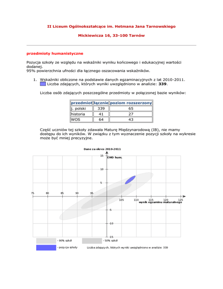 II Liceum Ogólnokształcące im. Hetmana Jana Tarnowskiego Mickiewicza 16, 33-100 Tarnów przedmioty humanistyczne Pozycja szkoły ze względu na wskaźniki wyniku końcowego i edukacyjnej wartości dodanej. 95% powierzchnia ufności dla łącznego oszacowania wskaźników. 1. Wskaźniki obliczone na podstawie danych egzaminacyjnych z lat 2010-2011. Liczba zdających, których wyniki uwzględniono w analizie: 339. Liczba osób zdających poszczególne przedmioty w połączonej bazie wyników: przedmiot łącznie poziom rozszerzony j. polski 339 65 historia 41 27 WOS 64 43 Część uczniów tej szkoły zdawała Maturę Międzynarodową (IB), nie mamy dostępu do ich wyników. W związku z tym wyznaczenie pozycji szkoły na wykresie może być mniej precyzyjne. przedmioty matematyczno-przyrodnicze Pozycja szkoły ze względu na wskaźniki wyniku końcowego i edukacyjnej wartości dodanej. 95% powierzchnia ufności dla łącznego oszacowania wskaźników. 1. Wskaźniki obliczone na podstawie danych egzaminacyjnych z lat 2010-2011. Liczba zdających, których wyniki uwzględniono w analizie: 339. Liczba osób zdających poszczególne przedmioty w połączonej bazie wyników: przedmiot matematyka łącznie poziom rozszerzony 339 62 biologia 67 43 chemia 28 24 7 6 79 63 2 2 fizyka geografia informatyka Część uczniów tej szkoły zdawała Maturę Międzynarodową (IB), nie mamy dostępu do ich wyników. W związku z tym wyznaczenie pozycji szkoły na wykresie może być mniej precyzyjne. matematyka Pozycja szkoły ze względu na wskaźniki wyniku końcowego i edukacyjnej wartości dodanej. 95% powierzchnia ufności dla łącznego oszacowania wskaźników. 1. Wskaźniki obliczone na podstawie danych egzaminacyjnych z lat 2010-2011. Liczba zdających, których wyniki uwzględniono w analizie: 339. Liczba osób zdających poszczególne przedmioty w połączonej bazie wyników: przedmiot matematyka łącznie poziom rozszerzony 339 62 Część uczniów tej szkoły zdawała Maturę Międzynarodową (IB), nie mamy dostępu do ich wyników. W związku z tym wyznaczenie pozycji szkoły na wykresie może być mniej precyzyjne.