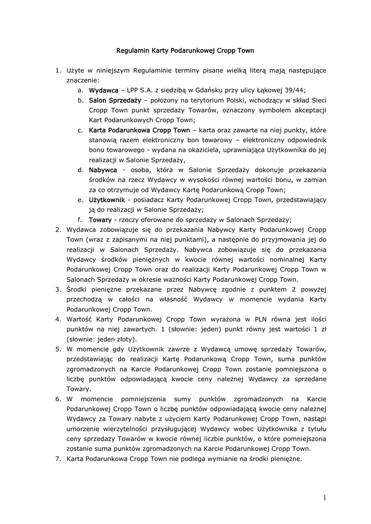 Regulamin Karty Podarunkowej Cropp Town 1. Użyte w niniejszym Regulaminie terminy pisane wielką literą mają następujące znaczenie: a. Wydawca – LPP S.A. z siedzibą w Gdańsku przy ulicy Łąkowej 39/44; b. Salon Sprzedaży – położony na terytorium Polski, wchodzący w skład Sieci Cropp Town punkt sprzedaży Towarów, oznaczony symbolem akceptacji Kart Podarunkowych Cropp Town; c. Karta Podarunkowa Cropp Town – karta oraz zawarte na niej punkty, które stanowią razem elektroniczny bon towarowy – elektroniczny odpowiednik bonu towarowego - wydana na okaziciela, uprawniająca Użytkownika do jej realizacji w Salonie Sprzedaży, d. Nabywca - osoba, która w Salonie Sprzedaży dokonuje przekazania środków na rzecz Wydawcy w wysokości równej wartości bonu, w zamian za co otrzymuje od Wydawcy Kartę Podarunkową Cropp Town; e. Użytkownik - posiadacz Karty Podarunkowej Cropp Town, przedstawiający ją do realizacji w Salonie Sprzedaży; f. Towary - rzeczy oferowane do sprzedaży w Salonach Sprzedaży; 2. Wydawca zobowiązuje się do przekazania Nabywcy Karty Podarunkowej Cropp Town (wraz z zapisanymi na niej punktami), a następnie do przyjmowania jej do realizacji w Salonach Sprzedaży. Nabywca zobowiązuje się do przekazania Wydawcy środków pieniężnych w kwocie równej wartości nominalnej Karty Podarunkowej Cropp Town oraz do realizacji Karty Podarunkowej Cropp Town w Salonach Sprzedaży w okresie ważności Karty Podarunkowej Cropp Town. 3. Środki pieniężne przekazane przez Nabywcę zgodnie z punktem 2 powyżej przechodzą w całości na własność Wydawcy w momencie wydania Karty Podarunkowej Cropp Town. 4. Wartość Karty Podarunkowej Cropp Town wyrażona w PLN równa jest ilości punktów na niej zawartych. 1 (słownie: jeden) punkt równy jest wartości 1 zł (słownie: jeden złoty). 5. W momencie gdy Użytkownik zawrze z Wydawcą umowę sprzedaży Towarów, przedstawiając do realizacji Kartę Podarunkową Cropp Town, suma punktów zgromadzonych na Karcie Podarunkowej Cropp Town zostanie pomniejszona o liczbę punktów odpowiadającą kwocie ceny należnej Wydawcy za sprzedane Towary. 6. W momencie pomniejszenia sumy punktów zgromadzonych na Karcie Podarunkowej Cropp Town o liczbę punktów odpowiadającą kwocie ceny należnej Wydawcy za Towary nabyte z użyciem Karty Podarunkowej Cropp Town, nastąpi umorzenie wierzytelności przysługującej Wydawcy wobec Użytkownika z tytułu ceny sprzedaży Towarów w kwocie równej liczbie punktów, o które pomniejszona zostanie suma punktów zgromadzonych na Karcie Podarunkowej Cropp Town. 7. Karta Podarunkowa Cropp Town nie podlega wymianie na środki pieniężne. 1 8. Karta Podarunkowa Cropp Town zachowuje ważność przez rok od dnia jej wydania Nabywcy. W momencie wydania Karty Podarunkowej Cropp Town Nabywcy następuje jej aktywacja. Karta Podarunkowa Cropp Town nie aktywowana przez Wydawcę jest nieważna. Okres ważności Karty Podarunkowej Cropp Town nie może zostać przedłużony. 9. Karta Podarunkowa Cropp Town może być realizowana wyłącznie po aktywacji, w Salonach Sprzedaży. 10. Przekazanie przez Wydawcę Karty Podarunkowej Cropp Town Nabywcy ma miejsce wyłącznie w Salonie Sprzedaży. 11. Salon Sprzedaży nie ponosi odpowiedzialności za Karty Podarunkowe Cropp Town, które zostały utracone (lub uszkodzone) po ich wydaniu Nabywcy. 12. Realizacja Karty Podarunkowej Cropp Town przez Użytkownika będzie stanowiła ważną transakcję nawet w wypadku, gdy Użytkownik wejdzie w posiadanie Karty Podarunkowej Cropp Town w sposób nieuprawniony. 13. W wypadku utraty, zniszczenia lub kradzieży Karty Podarunkowej Cropp Town Użytkownikowi nie przysługują wobec Wydawcy żadne roszczenia. 14. Użytkownik dokonuje realizacji Karty Podarunkowej Cropp Town poprzez przedstawienie personelowi Salonów Sprzedaży Karty Podarunkowej. Personel dokona pobrania z Karty liczby punktów odpowiadającej cenie Towaru nabytego przez Użytkownika od Wydawcy. 15. Nabywca jest zobowiązany do poinformowania Użytkownika, że Karta Podarunkowa Cropp Town: a. może być zrealizowana wyłącznie w Salonach Sprzedaży; b. nie podlega wymianie na środki pieniężne; c. posiada termin ważności, po którym nie może być zrealizowana. 16. Wydawca ma prawo odmówić realizacji Karty Podarunkowej Cropp Town w wypadku: a. upływu terminu ważności Karty Podarunkowej Cropp Town, b. braku technicznej możliwości realizacji Karty Podarunkowej Cropp Town, w szczególności: i. niemożności uzyskania połączenia z systemem informatycznym Wydawcy, ii. uszkodzenia Karty uniemożliwiającym Podarunkowej odczytanie Cropp danych Town w zapisanych na stopniu Karcie Podarunkowej Cropp Town. 17. Wydawca nie odpowiada za skutki braku możliwości realizacji Karty Podarunkowej Cropp Town wynikające z okoliczności, za które Wydawca nie ponosi odpowiedzialności, w tym w szczególności wynikające z utraty przez Salony Sprzedaży połączenia elektronicznego lub telefonicznego z systemem informatycznym Wydawcy. 18. W wypadku gdy pomimo upływu terminu ważności Karty Podarunkowej Cropp Town punkty zawarte na Karcie Podarunkowej Cropp Town pozostaną 2 niewykorzystane, Użytkownik nie ma prawa żądać od Wydawcy zwrotu środków pieniężnych przekazanych Wydawcy. 19. W wypadku gdy cena Towarów nabywanych przez Użytkownika z wykorzystaniem Karty Podarunkowej Cropp Town będzie wyższa niż ilość odpowiadających jej punktów zapisanych na Karcie Podarunkowej Cropp Town, Użytkownik zobowiązany będzie różnicę dopłacić gotówką lub kartą płatniczą. 20. W wypadku gdy Cena Towarów nabywanych przez Użytkownika z wykorzystaniem Karty Podarunkowej Cropp Town będzie wyższa niż liczba odpowiadających jej punktów zawartych na Karcie Podarunkowej Cropp Town, Użytkownik może wykorzystać punkty zawarte na innej Karcie Podarunkowej Cropp Town. 21. Wszelkie reklamacje związane z Kartami Podarunkowymi Cropp Town będą