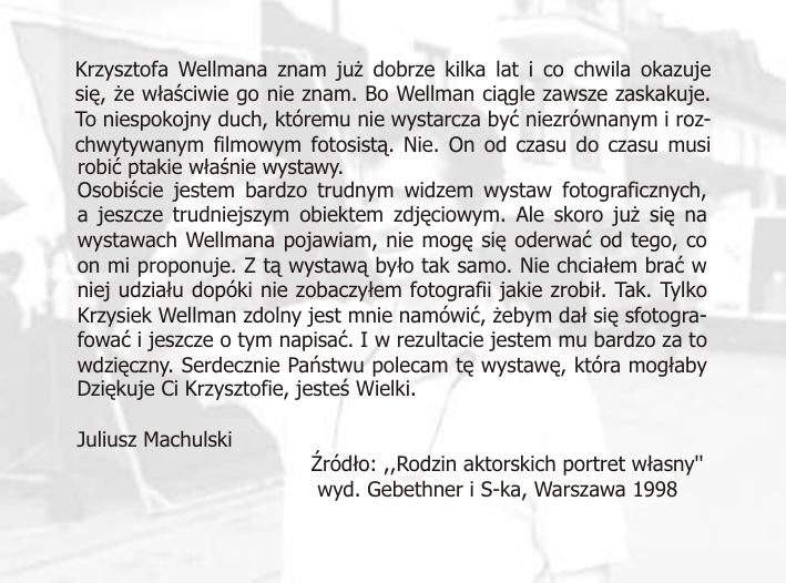Krzysztofa Wellmana znam już dobrze kilka lat i co chwila okazuje się, że właściwie go nie znam. Bo Wellman ciągle zawsze zaskakuje. To niespokojny duch, któremu nie wystarcza być niezrównanym i rozchwytywanym filmowym fotosistą. Nie. On od czasu do czasu musi robić ptakie właśnie wystawy. Osobiście jestem bardzo trudnym widzem wystaw fotograficznych, a jeszcze trudniejszym obiektem zdjęciowym. Ale skoro już się na wystawach Wellmana pojawiam, nie mogę się oderwać od tego, co on mi proponuje. Z tą wystawą było tak samo. Nie chciałem brać w niej udziału dopóki nie zobaczyłem fotografii jakie zrobił. Tak. Tylko Krzysiek Wellman zdolny jest mnie namówić, żebym dał się sfotografować i jeszcze o tym napisać. I w rezultacie jestem mu bardzo za to wdzięczny. Serdecznie Państwu polecam tę wystawę, która mogłaby Dziękuje Ci Krzysztofie, jesteś Wielki. Juliusz Machulski Źródło: ,,Rodzin aktorskich portret własny'' wyd. Gebethner i S-ka, Warszawa 1998