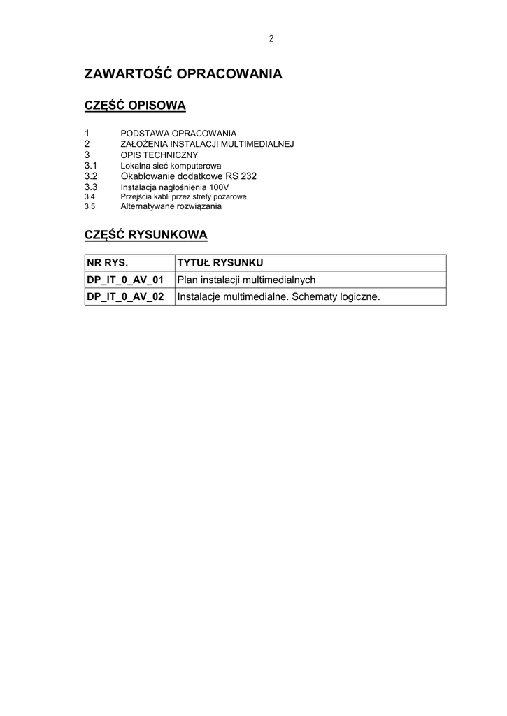 2 ZAWARTOŚĆ OPRACOWANIA CZĘŚĆ OPISOWA 1 2 3 3.1 3.2 3.3 PODSTAWA OPRACOWANIA ZAŁOŻENIA INSTALACJI MULTIMEDIALNEJ OPIS TECHNICZNY Lokalna sieć komputerowa 3.4 3.5 Przejścia kabli przez strefy pożarowe Okablowanie dodatkowe RS 232 Instalacja nagłośnienia 100V Alternatywane rozwiązania CZĘŚĆ RYSUNKOWA NR RYS. TYTUŁ RYSUNKU DP_IT_0_AV_01 Plan instalacji multimedialnych DP_IT_0_AV_02 Instalacje multimedialne. Schematy logiczne. 3 4 5 6 Janusz Warzecha Chajczyny 2 97-425 Zelów nr upr.: LOD/0249/POOE/04 dnia 15.06.2015r. OŚWIADCZENIE Projektanta * / Osoby sprawdzającej * Stosownie do zapisów art.20 ust.4 ustawy z dnia 7 lipca 1994 r. – Prawo budowlane (tekst jedn. Dz. U. Nr 243 z 2010 r. poz. Nr 1623 z późn. zm.) oświadczam, iż projekt budowlany: PROJEKT WYSTAWY STAŁEJ ORAZ ARANŻACJI I WYPOSAŻENIA WNĘTRZ ŻYDOWSKIEGO DOMU PRZEDPOGRZEBOWEGO W GLIWICACH – PROJEKT INSTALACJI TELETECHNICZNYCH (nazwa projektu) MUZEUM W GLIWICACH ul. Dolnych Wałów 8A 44-100 Gliwice (inwestor) ul. Księcia Poniatowskiego 14 44-100 Gliwice (adres inwestycji) opracowany: 15.06.2015r. (data opracowania projektu) został wykonany zgodnie z warunkami technicznymi, obowiązującymi przepisami, Polskimi Normami oraz Prawem Budowlanym. Równocześnie oświadczam, że dokumentacja projektowa, stanowiąca przedmiot zlecenia, jest kompletna z punktu widzenia celu, któremu ma służyć. …………………………………… (Projektant) 7 CZĘŚĆ OPISOWA 1 PODSTAWA OPRACOWANIA - zlecenie Inwestora aktualne podkłady architektoniczne projekty branżowe obowiązujące Normy i Przepisy 2 ZAŁOŻENIA INSTALACJI MULTIMEDIALNEJ Podstawowym elementem instalacji multimedialnej są komputery przemysłowe – kontrolery. Mogą do nich być podłączone: monitory nakładki dotykowe na monitor głośniki aktywne słuchawki moduły wejść z przyciskami Kontrolery będą miały zainstalowane dedykowane aplikacje o odpowiedniej funkcjonalności w zależności od stanowiska i podłączonych urządzeń dodatkowych. Wszystkie stanowiska multimedialne oraz inne urządzenia takie jak: komputer sterujący ścianą wideo główny serwer sterujący projektor połączone są poprzez lokalną sieć komputerową. Nadrzędną jednostką monitorująca i sterującą pracą całej instalacji jest główny serwer sterujący. Obsługa muzeum i administratorzy mają możliwość sterowania, zarządzania i monitorowania urządzeń instalacji multimedialnej poprzez dedykowane aplikacje przy zachowaniu stosownych praw dostępu. Ogólna informacja o budynku Teren na którym jest planowana inwestycja zlokalizowany przy ul Księcia Poniatowskiego 14 w Gliwicach. 3 OPIS TECHNICZNY 3.1 Lokalna sieć komputerowa Lokalna sieć komputerowa posiada jeden wspólny punk dystrybucyjny zlokalizowany w centrali teletechnicznej. Zakończenia przewodów po stronie urządzeń multimedialnych należy wykonać w postaci gniazdek. Zakończenia przewodów po stronie centrali teletechnicznej wykonać na panelach w szafce teletechnicznej. 3.2 Okablowanie dodatkowe RS 232 Pod możliwość przyszłej rozbudowy i zwiększenia funkcjonalności instalacji multimedialnej przewidziano okablowanie RS232. 8 3.3 Instalacja nagłośnienia 100V Do nagłośnienia sali edukacyjnej i wybranych pomieszczeń wystawowych zastosowano system nagłośnienia radiowęzłowego który bazuje na dwóch wzmacniaczach zlokalizowanych w sali edukacyjnej i centrali teletechnicznej. Szczegółowe opisy wykonawcze w odrębnym opracowaniu. SE DP_AV_SE_08 DP_AV_SE_01 DP_AV_SE_02 DP_AV_SE_03 DP_AV_SE_04 DP_AV_SE_05 DP_AV_SE_06 DP_AV_SE_07 SE_WZ_1 SE_ZGT_1 SG DP_AV_SG_01 DP_AV_SG_02 Wz_1 SALA EDUKACYJNA Ekran projekcyjny - elektrycznie rozwijany i zwijany - montowany do sufitu na linkach lub na uchwytach do ściany - sterowany poprzez włącznik SE_Wł_1 - opcjonalnie możliwość sterowania poprzez system centralny przy zastosowaniu odpowiedniego włącznika Projektor - montowany do sufitu na odpowiednim wysięgniku - możliwość sterowania i konfiguracji poprzez sieć komputerową i RS232 - źródła sygnały wideo podłączane poprzez zespół gniazd teletechnicznych SE_ZGT_1 lub bezpośrednio z szafki teletechnicznej SE_SzT_1 - do projektora należy doprowadzić zasilanie Głośniki - montowane do sufitu - równomierne nagłośnienie sali - szerokie pasmo przenoszenia odtwarzanie zarówno mowy jak i multimediów Wzmacniacz - zlokalizowany w szafce teletechnicznej - podłączenie źródeł dźwięku lokalnie lub poprzez zespół gniazd teletechnicznych SE_ZGT_1 - komunikacja poprzez RS232 i/lub LAN - sterowanie lokalnie lub poprzez system centralny Zespół gniazd teletechnicznych - podłączenie do projektora źródła wideo poprzez: HDMI, VGA, USB - podłączenie do systemu nagłośnienia źródeł audio: audio line - podłączenie do sieci komputerowej - gniazdo elektryczne 230V SALA GŁÓWNA Głośniki - montowane do sufitu - nagłośnienie wybranego obszaru ekspozycji Wzmacniacz 9 - dedykowany kanał do obsługi głośników DP_AV_SG_01, DP_AV_SG_02 - zlokalizowany w centrali teletechnicznej SR_Centrala_Teltech - komunikacja poprzez RS232 i/lub LAN - sterowanie lokalnie lub poprzez system centralny Kon_3 Kontroler - zlokalizowany w centrali teletechnicznej SR_Centrala_Teltech - dostarczanie treść audio odtwarzaną w głośnikach DP_AV_SG_01, DP_AV_SG_02 - komunikacja poprzez siec Ethernet - sterowanie poprzez system centralny SR DP_AV_SR_03 RECEPCJA Ścian wideo jeden wspólny komputer SR_Serwer obsługujący podłączone monitory funkcja niezależnego wyświetlania treści wideo na każdym z monitorów funkcja wyświetlania wspólnej treści na całej powierzchni monitorów komunikacja poprzez sieć LAN sterowanie i zarządzanie poprzez system centralny komputer sterujący ścianą wideo zlokalizowany w centrali teletechnicznej SR_Centrala_Teltech DP_AV_SR_04 Głośnik montowany do sufitu nagłośnienie wybranego obszaru ekspozycji źródło sygnału audio odtwarzane p
