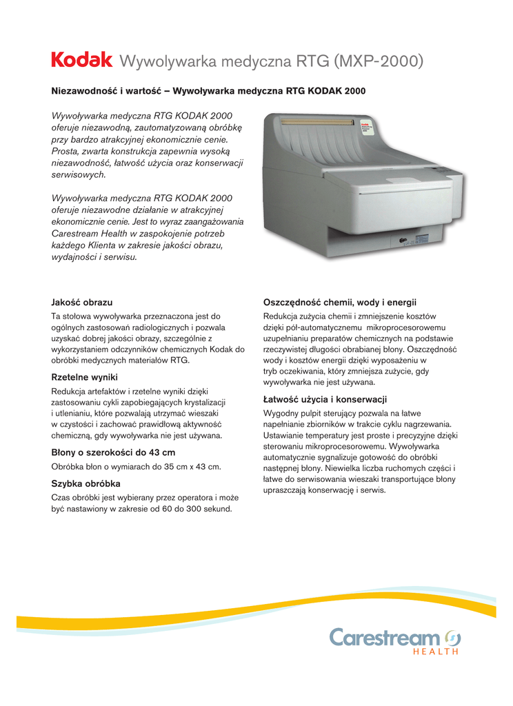 Wywolywarka medyczna RTG (MXP-2000) Niezawodność i wartość – Wywoływarka medyczna RTG KODAK 2000 Wywoływarka medyczna RTG KODAK 2000 oferuje niezawodną, zautomatyzowaną obróbkę przy bardzo atrakcyjnej ekonomicznie cenie. Prosta, zwarta konstrukcja zapewnia wysoką niezawodność, łatwość użycia oraz konserwacji serwisowych. Wywoływarka medyczna RTG KODAK 2000 oferuje niezawodne działanie w atrakcyjnej ekonomicznie cenie. Jest to wyraz zaangażowania Carestream Health w zaspokojenie potrzeb każdego Klienta w zakresie jakości obrazu, wydajności i serwisu. Jakość obrazu Oszczędność chemii, wody i energii Ta stołowa wywoływarka przeznaczona jest do ogólnych zastosowań radiologicznych i pozwala uzyskać dobrej jakości obrazy, szczególnie z wykorzystaniem odczynników chemicznych Kodak do obróbki medycznych materiałów RTG. Redukcja zużycia chemii i zmniejszenie kosztów dzięki pół-automatycznemu mikroprocesorowemu uzupełnianiu preparatów chemicznych na podstawie rzeczywistej długości obrabianej błony. Oszczędność wody i kosztów energii dzięki wyposażeniu w tryb oczekiwania, który zmniejsza zużycie, gdy wywoływarka nie jest używana. Rzetelne wyniki Redukcja artefaktów i rzetelne wyniki dzięki zastosowaniu cykli zapobiegających krystalizacji i utlenianiu, które pozwalają utrzymać wieszaki w czystości i zachować prawidłową aktywność chemiczną, gdy wywoływarka nie jest używana. Błony o szerokości do 43 cm Obróbka błon o wymiarach do 35 cm x 43 cm. Szybka obróbka Czas obróbki jest wybierany przez operatora i może być nastawiony w zakresie od 60 do 300 sekund. Łatwość użycia i konserwacji Wygodny pulpit sterujący pozwala na łatwe napełnianie zbiorników w trakcie cyklu nagrzewania. Ustawianie temperatury jest proste i precyzyjne dzięki sterowaniu mikroprocesorowemu. Wywoływarka automatycznie sygnalizuje gotowość do obróbki następnej błony. Niewielka liczba ruchomych części i łatwe do serwisowania wieszaki transportujące błony upraszczają konserwację i serwis. Wywolywarka medyczna RTG (MXP-2000) Serwis i wsparcie techniczne Dane techniczne Serwis i wsparcie techniczne zapewniane są przez autoryzowanych dystrybutorów produktów Kodak prowadzących sprzedaż wywoływarek medycznych RTG KODAK. Cykl obróbki Regulowany czas trwania cyklu: 60-300 sekund Bezproblemowa instalacja Dzięki łatwej instalacji możliwe jest szybkie rozpoczęcie obróbki błon. Wywoływarka może zostać zainstalowana przez personel placówki lub można zwrócić się o wykonanie instalacji przez wyszkolonego i autoryzowanego dystrybutora Carestream Health. Dołączone akcesoria Przerób 245 błon/godz. (35 cm x 43 cm) przy cyklu 60 sekund Objętości zbiorników Wywoływacz: 12,5 l Utrwalacz: 12,0 l Roztwór płuczący: 13,0 l Wymiary Długość: 97 cm Szerokość: 68 cm Wysokość: 127 cm Parametry elektryczne Model 212: 220V - 240V, 50Hz, 16A Model 213: 220V - 240V, 60Hz, 15A Zgodność z normami CE Zużycie: - Obróbka: 2,5 kW/godz. - Gotowość: 0,23 kW/godz. Ciężar Bez roztworów: 77 kg Z roztworami: 115 kg Numery katalogowe Model 212: Nr KAT. 516 1666 232 błon/godz. (35 cm x 43 cm) przy cyklu 90 sekund Stojak do wywoływarki medycznej Dwa zbiorniki uzupełniające 25 l Model 213: Nr KAT. 516 1674 Dodatkowe informacje W celu uzyskania dodatkowych informacji lub złożenia zamówienia, należy skontaktować się z przedstawicielem Carestream Health lub Skamex. Dystrybutor w Polsce: www.skamex.com.pl www.carestreamhealth.com Skamex Spółka z ograniczoną odpowiedzialnością Sp. k. 93-121 Łódź, ul. Częstochowska 38/52 tel.: +48 42 677 14 11 fax: +48 42 672 40 10 Produkt licencjonowany przez firmę Znak towarowy Kodak oraz handlowa szata graficzna są wykorzystywane na podstawie licencji firmy Kodak. Wydrukowano na papierze z recyklingu, zawierającym 10% włókien z surowców wtórnych, z wykorzystaniem farb na bazie soi. M3-408 Wydrukowano w Polsce. 5/10 © Carestream Health, Inc. 2009 Nr KAT. 821 4470 Carestream Health, Inc. 150 Verona Street Rochester, N.Y. 14608 U.S.A.