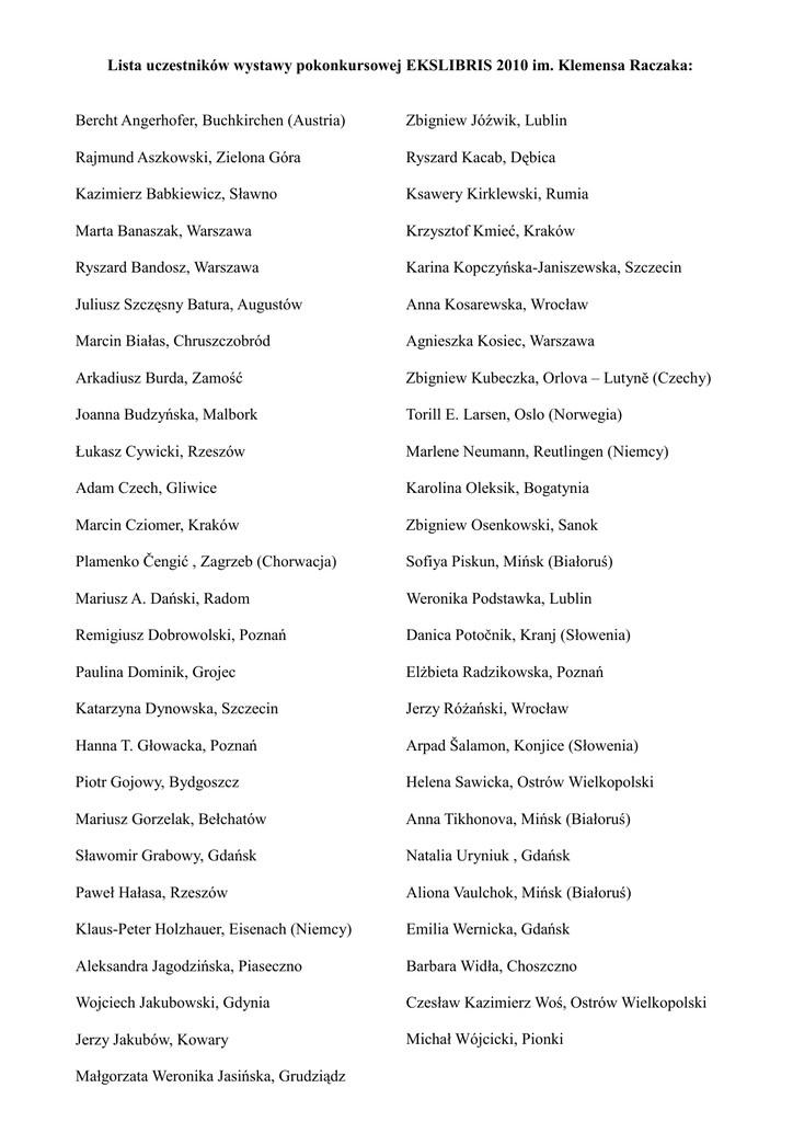 Lista uczestników wystawy pokonkursowej EKSLIBRIS 2010 im. Klemensa Raczaka: Bercht Angerhofer, Buchkirchen (Austria) Zbigniew Jóźwik, Lublin Rajmund Aszkowski, Zielona Góra Ryszard Kacab, Dębica Kazimierz Babkiewicz, Sławno Ksawery Kirklewski, Rumia Marta Banaszak, Warszawa Krzysztof Kmieć, Kraków Ryszard Bandosz, Warszawa Karina Kopczyńska-Janiszewska, Szczecin Juliusz Szczęsny Batura, Augustów Anna Kosarewska, Wrocław Marcin Białas, Chruszczobród Agnieszka Kosiec, Warszawa Arkadiusz Burda, Zamość Zbigniew Kubeczka, Orlova – Lutynĕ (Czechy) Joanna Budzyńska, Malbork Torill E. Larsen, Oslo (Norwegia) Łukasz Cywicki, Rzeszów Marlene Neumann, Reutlingen (Niemcy) Adam Czech, Gliwice Karolina Oleksik, Bogatynia Marcin Cziomer, Kraków Zbigniew Osenkowski, Sanok Plamenko Čengić , Zagrzeb (Chorwacja) Sofiya Piskun, Mińsk (Białoruś) Mariusz A. Dański, Radom Weronika Podstawka, Lublin Remigiusz Dobrowolski, Poznań Danica Potočnik, Kranj (Słowenia) Paulina Dominik, Grojec Elżbieta Radzikowska, Poznań Katarzyna Dynowska, Szczecin Jerzy Różański, Wrocław Hanna T. Głowacka, Poznań Arpad Šalamon, Konjice (Słowenia) Piotr Gojowy, Bydgoszcz Helena Sawicka, Ostrów Wielkopolski Mariusz Gorzelak, Bełchatów Anna Tikhonova, Mińsk (Białoruś) Sławomir Grabowy, Gdańsk Natalia Uryniuk , Gdańsk Paweł Hałasa, Rzeszów Aliona Vaulchok, Mińsk (Białoruś) Klaus-Peter Holzhauer, Eisenach (Niemcy) Emilia Wernicka, Gdańsk Aleksandra Jagodzińska, Piaseczno Barbara Widła, Choszczno Wojciech Jakubowski, Gdynia Czesław Kazimierz Woś, Ostrów Wielkopolski Jerzy Jakubów, Kowary Michał Wójcicki, Pionki Małgorzata Weronika Jasińska, Grudziądz