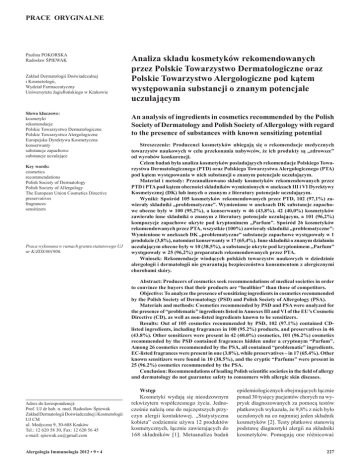 PRACE ORYGINALNE Paulina POKORSKA Radosław ŚPIEWAK Zakład Dermatologii Doświadczalnej i Kosmetologii, Wydział Farmaceutyczny Uniwersytetu Jagiellońskiego w Krakowie Słowa kluczowe: kosmetyki rekomendacje Polskie Towarzystwo Dermatologiczne Polskie Towarzystwo Alergologiczne Europejska Dyrektywa Kosmetyczna konserwanty substancje zapachowe substancje uczulające Key words: cosmetics recommendations Polish Society of Dermatology Polish Society of Allergology The European Union Cosmetics Directive preservatives fragrances sensitizers Praca wykonana w ramach grantu statutowego UJ nr K/ZDS/001906. Analiza składu kosmetyków rekomendowanych przez Polskie Towarzystwo Dermatologiczne oraz Polskie Towarzystwo Alergologiczne pod kątem występowania substancji o znanym potencjale uczulającym An analysis of ingredients in cosmetics recommended by the Polish Society of Dermatology and Polish Society of Allergology with regard to the presence of substances with known sensitizing potential Streszczenie: Producenci kosmetyków ubiegają się o rekomendacje medycznych towarzystw naukowych w celu przekonania nabywców, że ich produkty są „zdrowsze” od wyrobów konkurencji. Celem badań była analiza kosmetyków posiadających rekomendacje Polskiego Towarzystwa Dermatologicznego (PTD) oraz Polskiego Towarzystwa Alergologicznego (PTA) pod kątem występowania w nich substancji o znanym potencjale uczulającym. Materiał i metody: Przeanalizowano składy kosmetyków rekomendowanych przez PTD i PTA pod kątem obecności składników wymienionych w aneksach III i VI Dyrektywy Kosmetycznej (DK) lub innych o znanym z literatury potencjale uczulającym. Wyniki: Spośród 105 kosmetyków rekomendowanych przez PTD, 102 (97,1%) zawierały składniki „problematyczne”. Wymienione w aneksach DK substancje zapachowe obecne były w 100 (95,2%), a konserwanty w 46 (43,8%). 42 (40,0%) kosmetyków zawierało inne składniki o znanym z literatury potencjale uczulającym, a 101 (96,2%) kompozycje zapachowe ukryte pod kryptonimem „Parfum”. Spośród 26 kosmetyków rekomendowanych przez PTA, wszystkie (100%) zawierały składniki „problematyczne”: Wymienione w aneksach DK „problematyczne” substancje zapachowe występowały w 1 produkcie (3,8%), natomiast konserwanty w 17 (65,4%). Inne składniki o znanym działaniu uczulającym obecne były w 10 (38,5%), a substancje ukryte pod kryptonimem „Parfum” występowały w 25 (96,2%) preparatach rekomendowanych przez PTA. Wniosek: Rekomendacje wiodących polskich towarzystw naukowych w dziedzinie alergologii i dermatologii nie gwarantują bezpieczeństwa konsumentom z alergicznymi chorobami skóry. Abstract: Producers of cosmetics seek recommendations of medical societies in order to convince the buyers that their products are “healthier” than those of competitors. Objective: To analyze the presence of sensitizing ingredients in cosmetics recommended by the Polish Society of Dermatology (PSD) and Polish Society of Allergology (PSA). Materials and methods: Cosmetics recommended by PSD and PSA were analyzed for the presence of “problematic” ingredients listed in Annexes III and VI of the EU’s Cosmetic Directive (CD), as well as non-listed ingredients known to be sensitizers. Results: Out of 105 cosmetics recommended by PSD, 102 (97.1%) contained CDlisted ingredients, including fragrances in 100 (95.2%) products, and preservatives in 46 (43.8%). Other sensitizers were present in 42 (40.0%) cosmetics, 101 (96.2%) cosmetics recommended by the PSD contained fragrances hidden under a cryptonym “Parfum”. Among 26 cosmetics recommended by the PSA, all contained “problematic” ingredients. EC-listed fragrances were present in one (3.8%), while preservatives – in 17 (65.4%). Other known sensitizers were found in 10 (38.5%), and the cryptic “Parfums” were present in 25 (96.2%) cosmetics recommended by the PSA. Conclusion: Recommendations of leading Polish scientific societies in the field of allergy and dermatology do not guarantee safety to consumers with allergic skin diseases. Adres do korespondencji: Prof. UJ dr hab. n. med. Radosław Śpiewak Zakład Dermatologii Doświadczalnej i Kosmetologii UJ CM ul. Medyczna 9, 30-688 Kraków Tel.: 12 620 58 30, Fax: 12 620 56 45 e-mail: [email protected] Alergologia Immunologia 2012 • 9 • 4 Wstęp Kosmetyki wydają się nieodzownym rekwizytem współczesnego życia. Jednocześnie należą one do najczęstszych przyczyn alergii kontaktowej. „Statystyczna kobieta” codziennie używa 12 produktów kosmetycznych, łącznie zawierających do 168 składników [1]. Metaanaliza badań epidemiologicznych obejmujących łącznie ponad 30 tysięcy pacjentów chorych na wyprysk diagnozowanych za pomocą testów płatkowych wykazała, że 9,8% z nich było uczulonych na co najmniej jeden składnik kosmetyków [2]. Testy płatkowe stanowią podstawę diagnostyki alergii na składniki kosmetyków. Pomagają one różnicować 227 pomiędzy alergią a reakcjami podrażnieniowymi, ponadto ich wykonanie zwiększa szansę postawienia trafnej diagnozy, oraz obniża koszty leczenia i poprawy jakości życia pacjentów [3].W przeprowadzonych w latach 2000-2005 badaniach zespołu łódzkiego, spośród 1937 kolejnych pacjentów testowanych za pomocą serii podstawowej, alergię na środki zapachowe (mieszanka zapachowa I) potwierdzono u 5,1% pacjentów, w tym 5,2% kobiet i 4,9% mężczyzn [4]. Skład mieszanki zapachowej I obejmuje: alkohol cynamonowy, aldehyd cynamonowy, hydroksycytronellal, aldehyd amylowocynamonowy, geraniol, eugenol, izoeugenol, absolut mchu dębowego oraz emulgator seskwioleinian sorbitanu. Mieszanka ta nie uwzględnia „nowych” substancji zapachowych, w związku z czym od 2008 roku Europejska Seria Podstawowa, a od roku 2010 również Polska Seria Podstawowa zostały rozszerzone o mieszankę zapachową II (zawiera cytronellol, cytral, kumarynę, lyral, farnesol oraz aldehyd alfa-heksylocy