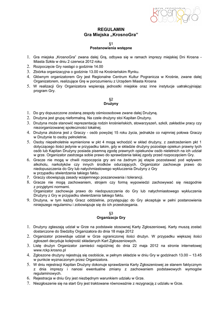 REGULAMIN Gra Miejska „KrosnoGra” §1 Postanowienia wstępne 1. Gra miejska „KrosnoGra” zwana dalej Grą, odbywa się w ramach imprezy miejskiej Dni Krosna Miasta Szkła w dniu 2 czerwca 2012 roku 2. Rozpoczęcie Gry nastąpi o godzinie 14.00 3. Zbiórka organizacyjna o godzinie 13.00 na Krośnieńskim Rynku. 4. Głównym organizatorem Gry jest Regionalne Centrum Kultur Pogranicza w Krośnie, zwane dalej Organizatorem, realizujące Grę w porozumieniu z Urzędem Miasta Krosna 5. W realizacji Gry Organizatora wspierają jednostki miejskie oraz inne instytucje uatrakcyjniając program Gry. §2 Drużyny 1. Do gry dopuszczone zostaną zespoły ośmioosobowe zwane dalej Drużyną. 2. Drużyna jest grupą nieformalną. Na czele drużyny stoi Kapitan Drużyny. 3. Drużyna może stanowić reprezentację rodzin krośnieńskich, stowarzyszeń, szkół, zakładów pracy czy niezorganizowanej społeczności lokalnej. 4. Drużyna złożona jest z Graczy - osób powyżej 15 roku życia, jednakże co najmniej połowa Graczy w Drużynie to osoby pełnoletnie. 5. Osoby niepełnoletnie wymienione w pkt 4 mogą wchodzić w skład drużyny, z zastrzeżeniem pkt 1 dotyczącego ilości jedynie w przypadku takim, gdy w składzie drużyny pozostaje opiekun prawny tych osób lub Kapitan Drużyny posiada pisemną zgodę prawnych opiekunów osób nieletnich na ich udział w grze. Organizator zastrzega sobie prawo do sprawdzenia takiej zgody przed rozpoczęciem Gry. 6. Gracze nie mogą w chwili rozpoczęcia gry ani na żadnym jej etapie pozostawać pod wpływem alkoholu, narkotyków czy innych środków odurzających. Organizator zachowuje prawo do niedopuszczenia do Gry lub natychmiastowego wykluczenia Drużyny z Gry w przypadku stwierdzenia takiego faktu. 7. Graczy obowiązują zasady wzajemnego poszanowania i tolerancji. 8. Gracze nie mogą zachowaniem, strojem czy formą wypowiedzi zachowywać się niezgodnie z przyjętymi normami. Organizator zachowuje prawo do niedopuszczenia do Gry lub natychmiastowego wykluczenia Drużyny z Gry w przypadku stwierdzenia takiego faktu. 9. Drużyna, w tym każdy Gracz oddzielnie, przystępując do Gry akceptuje w pełni postanowienia niniejszego regulaminu i zobowiązuje się do ich przestrzegania. §3 Organizacja Gry 1. Drużyny zgłaszają udział w Grze na podstawie stosownej Karty Zgłoszeniowej. Karty muszą zostać dostarczone do Siedziby Organizatora do dnia 18 maja 2012 2. Organizator przewiduje udział w Grze ograniczonej ilości drużyn. W przypadku większej ilości zgłoszeń decyduje kolejność składanych Kart Zgłoszeniowych. 3. Listę drużyn Organizator zamieści najpóźniej do dnia 22 maja 2012 na stronie internetowej 4. 5. 6. 7. www.rckp.krosno.pl Zgłoszone drużyny rejestrują się osobiście, w pełnym składzie w dniu Gry w godzinach 13.00 – 13.45 w punkcie wyznaczonym przez Organizatora. W dniu rejestracji Kapitan Drużyny dokonuje sprawdzenia Karty Zgłoszeniowej ze stanem faktycznym z dnia imprezy i nanosi ewentualne zmiany z zachowaniem podstawowych wymogów regulaminowych. Rejestracja w dniu Gry jest niezbędnym warunkiem udziału w Grze. Niezgłoszenie się na start Gry jest traktowane równoważnie z rezygnacją z udziału w Grze. 8. Drużyna, w tym każdy Gracz oddzielnie wypełniając Kartę Zgłoszeniową wyraża zgodę na 9. przetwarzanie danych osobowych w zakresie niezbędnym do prawidłowego przeprowadzenia Gry. Nad prawidłowym przebiegiem Gry czuwa Rada Strażników, w skład której wchodzą Strażnicy Przystanków i Strażnicy Główni. Wszyscy Strażnicy są niezależnymi podmiotami, powołanymi przez organizatorów Gry. §4 Nagrody 1. Jako nagrody organizator przewidział 8 równowartościowych zestawów, po jednym dla Każdego 2. 3. 4. 5. 6. 7. Gracza zwycięskiej drużyny. Organizator przewiduje jedną nagrodę główną za zajęcie I miejsca oraz dwie dodatkowe nagrody na zajęcie II i III miejsca. Nagroda przyznawana jest Drużynie z uwzględnieniem każdego z jej Graczy. W przypadku pozyskania sponsorów Organizator może powiększyć pulę trzech nagród podstawowych lub przyznać dodatkowe nagrody dla kolejnych Drużyn. Organizator może przekazać dodatkową nagrodę drużynową lub indywidualną dla Gracza nieprzewidzianą regulaminem i nie związaną z ilością otrzymanych punktów, w celu uhonorowania szczególnego Drużyny lub indywidualnego Gracza. Organizator ustala, iż wartość nagrody dla jednego Gracza nie przekroczy kwoty 760 PLN i nie podlega opodatkowaniu. Organizator przewiduje różne nagrody w formie rzeczowej. Nagrody nie podlegają wymianie na środki finansowe oraz na inne rodzaje nagród. §5 Zasady Gry 1. Gra zostanie przeprowadzona w sobotę 2 czerwca 2012 roku. Rozpoczęcie gry nastąpi o godzinie 14.00. Gra planowana jest na 4 godziny. 2. Zadaniem Drużyn jest prawidłowe przejście trasy Gry, zgodnie z podanymi wskazówkami i w podanej kolejności, wykonanie zadań na poszczególnych przystankach kontrolnych oraz wykonanie zadania finałowego. 3. Trasa składa się z przystanków kontrolnych, takich samych dla wszystkich drużyn. 4. Każda drużyna otrzymuje indywidualną trasę różniącą się miejscem rozpoczęcia Gry, kolejnością zdobywania przystanków kontrolnych i indywidualnymi wskazówkami uzależnionymi od specyfiki ułożenia trasy. Nie powinno się omijać przystanków kontrolnych ani zmieniać ich kolejności. 5. Na każdym punkcie kontrolnym drużyna wykonuje zadanie zgodnie ze wskazówkami Strażnika. 6. Strażnik czuwa nad prawidłowym wykonaniem zadania przez drużynę. 7. Zadania na przystanku kontrolnym są takie same dla każdej drużyny, ale posiadają różne stopnie trudności, w związku z czym za wykonanie zadania Drużyny mogą otrzymać różną ilość punktów na tym samym przystanku kontrolnym. 8. Strażnik przydziela punkty w dwóch postaciach: I kategoria - Punkty wejściowe – za prawidłowe dojście do przystanku zgodnie z indywidualną trasą oraz za