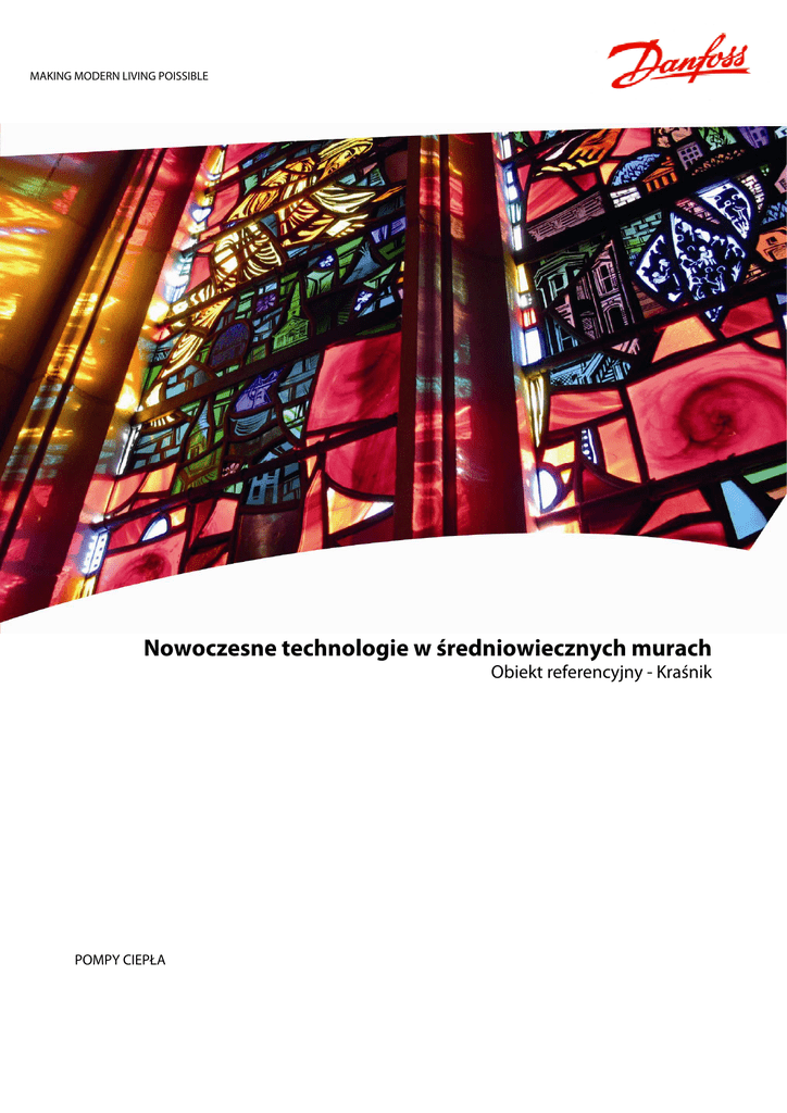 MAKING MODERN LIVING POISSIBLE Nowoczesne technologie w średniowiecznych murach Obiekt referencyjny - Kraśnik POMPY CIEPŁA Od początku swego istnienia Kraśnik i jego świątynie narażone były na napady ze strony Tatarów, Kozaków /1648/ i Szwedów /1657/. Na początku XV w. spłonął drewniany kościół pod wezwaniem św. Pawła. Jednak kilka lat później w tym samym miejscu zbudowano murowaną świątynię. Następnie Jan Rabsztyński-Tęczyński rozbudował świątynię w 1468 r. Rodzina Tęczyńskich - Rabsztyńskich wybudowała murowany klasztor w kształcie litery "L" oraz dokonała kolejnej rozbudowy kościoła parafialnego poprzez dobudowanie dwóch kaplic. Kościół zbudowany pierwotnie w stylu gotyckim nabrał cech renesansowych. Odnawiana i zadbana świątynia kraśnicka jest żywym ośrodkiem życia religijnego miasta i okolicy. Dziś Kraśnik jest też siedzibą dekanatu. Odkrywając historię W latach 1980-1983 przeprowadzono gruntowny remont więźby dachowej. Dach kościoła i dzwonnicy pokryty został blachą miedzianą. Odrestaurowano wnętrze kościoła. Pod nadzorem Wojewódzkiego Konserwatora Zabytków odkryte zostały cenne freski i odnowiono kamienne nagrobki. W roku 1996 zainstalowany został na wieży komputerowy zegar z kurantami oraz komputerowe sterowane dzwony. Wraz z członkowstwem w Unii Europejskiej stworzone zostały nowe możliwości finansowania prac inwestycyjnych. Kolejne prace modernizacyjne wokół kościoła Wniebowzięcia Najświętszej Marii Panny w Kraśniku rozpoczęły się w 2007 roku. Konserwatorzy zabrali się najpierw za elewację zewnętrzną i pomieszczenia zakrystii. Budowlańcy zdjęli tynk, który zakrywał piękne ciosy z wapienia. A to właśnie z niego zbudowano świątynię. W 2009 roku prace zostały przeniesione do wnętrza. Konserwator zabytków wydał Fot. 1 Widok Kościoła i Klasztoru zgodę na zmianę posadzki i wykonanie ogrzewania podłogowego. Warto nadmienić, iż poprzedni system ogrzewania bazował na starych kotłach gazowych oraz nagrzewnicach, które miały niszczący wpływ na zabytkowe wnętrze kościoła oraz solidnie obciążały budżet parafii. W tym momencie władze kościoła wraz z firmą wykonującą ogrzewanie postanowiły spróbować zrobić ogrzewanie podłogowe, które korzysta z energii odnawialnej. „W taki sposób pompy ciepła ogrzewają budynki w Szwecji. Dlaczego nie miałoby to działać i u nas…?” mówi ks. Jerzy Zamorski, proboszcz parafii WNMP, który jest zwolennikiem takiego pomysłu. „…Zdecydowaliśmy się na współpracę z firmą Ciepłotech z Chełma, która ma wieloletnie doświadczenie w modernizacji ogrzewania w obiektach sakralnych”– kontynuuje proboszcz. Dolne źródło - łatwiej powiedzieć, trudniej zrobić Ogrzewanie niskotemperaturowe, czyli podłogowe jest wręcz idealne dla takich Fot. 2 Widok kościoła od strony wieży zegarowej obiektów jak kościół, jak również dla pomp ciepła korzystających z energii odnawialnej. Jednak warto podkreślić, iż w normalnych warunkach temperatura komfortu to ok. 2022⁰C, natomiast w kościele temperatura komfortu to ok. 10-12⁰C a więc energetycznie i finansowo sytuacja jeszcze bardziej korzystna. Początek instalacji pomp ciepła to przede wszystkim dobrze wykonane dolne źródło. Na terenie parafii wykonanych zostało 15 odwiertów, każdy głęboki na 100 metrów, następnie rury doprowadzone zostały do kotłowni z pompami ciepła zlokalizowanej w podziemiach budynków poklasztornych. Wszystkie rury z odwiertów zostały podłączone do jednego rozdzielacza. „Wszystkie odwierty zrobiliśmy w ciągu 3 tygodni, ale największym zaskoczeniem było dojście do rozdzielacza. Myśleliśmy, że zrobimy to w 2-4 dni, ale przewiercenie 30 otworów przez 2 metrowy stary mur fundamentowy zajęło nam kolejne dwa tygodnie” – mówi Roman Wysoczański z firmy Geo-Wir odpowiedzialnej za przygotowanie dolnego źródła. „…w efekcie był to nasz największy rozdzielacz wyregulowany hydraulicznie, jaki zrobiliśmy” - dodaje Pan Roman. Kotłownia w pierwszym etapie została wyposażona w dwie pompy ciepła DHP-L typu solanka-woda o mocy 12 kW każda. Ogrzewają one kościół i będą dostarczać ciepła wodę użytkową latem. Fot. 3 Roman Wysoczański przy rozdzielaczu dolnego źródła Wydawałoby się, że 24 kW to mało jak na tak duży obiekt. Jednak należy pamiętać, że zapotrzebowanie na ciepło zmienia się w zależności od temperatury zewnętrznej a jej wartości obliczeniowe występują bardzo rzadko. Ekonomicznie uzasadnione jest posługiwanie się właściwie dobranymi pompami ciepła oraz zastosowanie źródła szczytowego w postaci podgrzewaczy elektrycznych. W ogólnym rozrachunku jest to rozwiązanie optymalne inwestycyjnie i eksploatacyjnie. Pełna moc zestawu zamontowanego to 42 kW. Dystrybucja ciepła pełna niespodzianek Za pomocą pomp ciepła ciepło dostarczane jest z dolnego źródła do kościoła, a następnie poprzez pętle ogrzewania podłogowego przekazywane jest do pomieszczeń. Odległość między budynkiem klasztornym a kościołem to ok. 30 metrów. „Planując transport ciepła rurami do kościoła musieliśmy „improwizować” i na bieżąco zmieniać drogę, która idą rury. Kościół jest bardzo stary, wielokrotnie przechodził remonty i modernizacje, po których nie pozostawiono dokumentacji” – mówi Karol Sawicz z firmy Ciepłotech. Sieć przesyłowa to w sumie 160 metrów zaizolowanych rur, doprowadzają one ciepło do 5 rozdzielaczy umiejscowionych w filarach podpierających sklepienie. Z rozdzielaczy odchodzi w sumie 25 pętli, zaś temperatura zasilania instalacji to 32°C. Dwie dwudziesto kilowatowe nagrzewnice gazowe Fot. 4 Karol Sawicz przy pompach ciepła DHP-L 12 kW w zmodernizowanej kotłowni. zastąpiono pompami ciepła o łącznej mocy 42 kW, ponadto instalacja pracuje na tzw. „niskim parametrze”, co umożliwi osiągnięcie wysokiego wsk