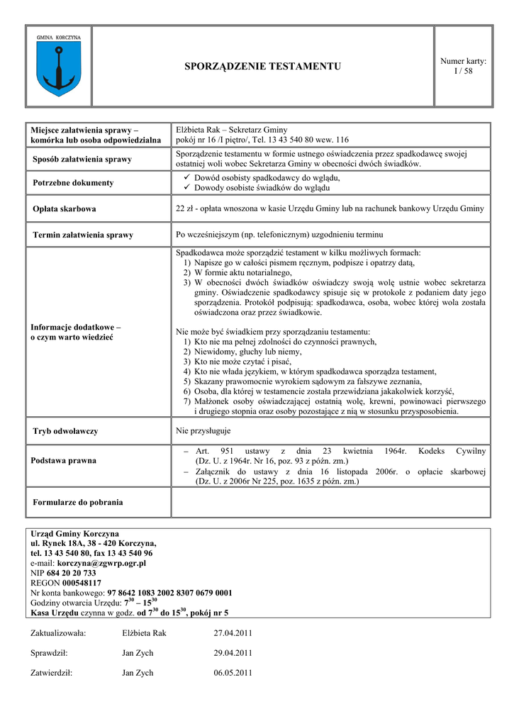 SPORZĄDZENIE TESTAMENTU Numer karty: I / 58 Miejsce załatwienia sprawy – komórka lub osoba odpowiedzialna Elżbieta Rak – Sekretarz Gminy pokój nr 16 /I piętro/, Tel. 13 43 540 80 wew. 116 Sposób załatwienia sprawy Sporządzenie testamentu w formie ustnego oświadczenia przez spadkodawcę swojej ostatniej woli wobec Sekretarza Gminy w obecności dwóch świadków. Dowód osobisty spadkodawcy do wglądu, Dowody osobiste świadków do wglądu Potrzebne dokumenty Opłata skarbowa 22 zł - opłata wnoszona w kasie Urzędu Gminy lub na rachunek bankowy Urzędu Gminy Termin załatwienia sprawy Po wcześniejszym (np. telefonicznym) uzgodnieniu terminu Spadkodawca może sporządzić testament w kilku możliwych formach: 1) Napisze go w całości pismem ręcznym, podpisze i opatrzy datą, 2) W formie aktu notarialnego, 3) W obecności dwóch świadków oświadczy swoją wolę ustnie wobec sekretarza gminy. Oświadczenie spadkodawcy spisuje się w protokole z podaniem daty jego sporządzenia. Protokół podpisują: spadkodawca, osoba, wobec której wola została oświadczona oraz przez świadkowie. Informacje dodatkowe – o czym warto wiedzieć Nie może być świadkiem przy sporządzaniu testamentu: 1) Kto nie ma pełnej zdolności do czynności prawnych, 2) Niewidomy, głuchy lub niemy, 3) Kto nie może czytać i pisać, 4) Kto nie włada językiem, w którym spadkodawca sporządza testament, 5) Skazany prawomocnie wyrokiem sądowym za fałszywe zeznania, 6) Osoba, dla której w testamencie została przewidziana jakakolwiek korzyść, 7) Małżonek osoby oświadczającej ostatnią wolę, krewni, powinowaci pierwszego i drugiego stopnia oraz osoby pozostające z nią w stosunku przysposobienia. Nie przysługuje Tryb odwoławczy Art. 951 ustawy z dnia 23 kwietnia 1964r. Kodeks Cywilny (Dz. U. z 1964r. Nr 16, poz. 93 z późn. zm.) Załącznik do ustawy z dnia 16 listopada 2006r. o opłacie skarbowej (Dz. U. z 2006r Nr 225, poz. 1635 z późn. zm.) Podstawa prawna Formularze do pobrania Urząd Gminy Korczyna ul. Rynek 18A, 38 - 420 Korczyna, tel. 13 43 540 80, fax 13 43 540 96 e-mail: [email protected] NIP 684 20 20 733 REGON 000548117 Nr konta bankowego: 97 8642 1083 2002 8307 0679 0001 Godziny otwarcia Urzędu: 730 – 1530 Kasa Urzędu czynna w godz. od 730 do 1530, pokój nr 5 Zaktualizowała: Elżbieta Rak 27.04.2011 Sprawdził: Jan Zych 29.04.2011 Zatwierdził: Jan Zych 06.05.2011