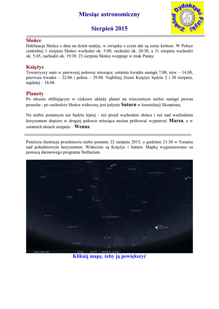 Miesiąc astronomiczny Sierpień 2015 Słońce Deklinacja Słońca z dnia na dzień maleje, w związku z czym dni są coraz krótsze. W Polsce centralnej 1 sierpnia Słońce wschodzi ok. 5:00, zachodzi ok. 20:30, a 31 sierpnia wschodzi ok. 5:45, zachodzi ok. 19:30. 23 sierpnia Słońce wstępuje w znak Panny. Księżyc Towarzyszy nam w pierwszej połowie miesiąca: ostatnia kwadra nastąpi 7.08, nów – 14.08, pierwsza kwadra – 22.08 i pełnia – 29.08. Najbliżej Ziemi Księżyc będzie 2 i 30 sierpnia, najdalej – 18.08. Planety Po okresie obfitującym w ciekawe układy planet na wieczornym niebie nastąpi pewna posucha - po zachodzie Słońca widoczny jest jedynie Saturn w konstelacji Skorpiona. Na niebie porannym nie będzie lepiej - tuż przed wschodem słońca i tuż nad wschodnim horyzontem dopiero w drugiej połowie miesiąca można próbować wypatrzeć Marsa, a w ostatnich dniach sierpnia – Wenus. Poniższa ilustracja przedstawia niebo poranne 22 sierpnia 2015, o godzinie 21:30 w Toruniu nad południowym horyzontem. Widoczne są Księżyc i Saturn. Mapkę wygenerowano za pomocą darmowego programu Stellarium. Kliknij mapę, żeby ją powiększyć