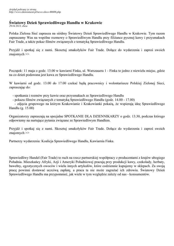 Artykuł pobrany ze strony http://www.ekonsument.pl/news-show-66686.php Światowy Dzień Sprawiedliwego Handlu w Krakowie 29.04.2013, Zuza Polska Zielona Sieć zaprasza na siódmy Światowy Dzień Sprawiedliwego Handlu w Krakowie. Tym razem zapraszamy Was na wspólne rozmowy o Sprawiedliwym Handlu przy filiżance pysznej kawy i przysmakach Fair Trade, a także pokaz filmów związanych z tematyką Sprawiedliwego Handlu. Przyjdź i spotkaj się z nami. Skosztuj smakołyków Fair Trade. Dołącz do wydarzenia i zaproś swoich znajomych >> Początek: 11 maja o godz. 13.00 w kawiarni Finka, ul. Warszauera 1 - Finka to jedno z niewielu miejsc, gdzie na co dzień podawana jest kawa ze Sprawiedliwego Handlu. W kawiarni od godz. 13.00 do 17.00 czekać będą pracownicy i wolontariusze Polskiej Zielonej Sieci, zapraszając do: - spotkania i rozmów przy kawie oraz przysmakach ze Sprawiedliwego Handlu - pokazu filmów związanych z tematyką Sprawiedliwego Handlu (godz. 14.00 - 17.00) - zdjęcia grupowego na którym Krakowianie i Krakowianki pokażą, że wspierają ideę Sprawiedliwego Handlu (g. 15.00) Organizatorzy zapraszają na specjalne SPOTKANIE DLA DZIENNIKARZY o godz. 13.30, podczas którego odpowiemy na nurtujące pytania związane ze Sprawiedliwym Handlem. Przyjdź i spotkaj się z nami. Skosztuj smakołyków Fair Trade. Dołącz do wydarzenia i zaproś swoich znajomych >> Partnerzy wydarzenia: Koalicja Sprawiedliwego Handlu, Kawiarnia Finka. Sprawiedliwy Handel (Fair Trade) to ruch na rzecz partnerskiej współpracy z producentami z krajów ubogiego Południa. Mieszkańcy Afryki, Azji i Ameryki Południowej pracują przy produkcji kawy, czekolady, herbaty, bawełny, egzotycznych owoców i wielu innych artykułów, które codziennie kupujemy w sklepach. Za swoją pracę powinni dostawać uczciwą zapłatę, a praca ta nie może zagrażać ich zdrowiu. Światowy Dzień Sprawiedliwego Handlu ma przypomnieć, jak wiele w tym względzie zależy od nas - konsumentów.