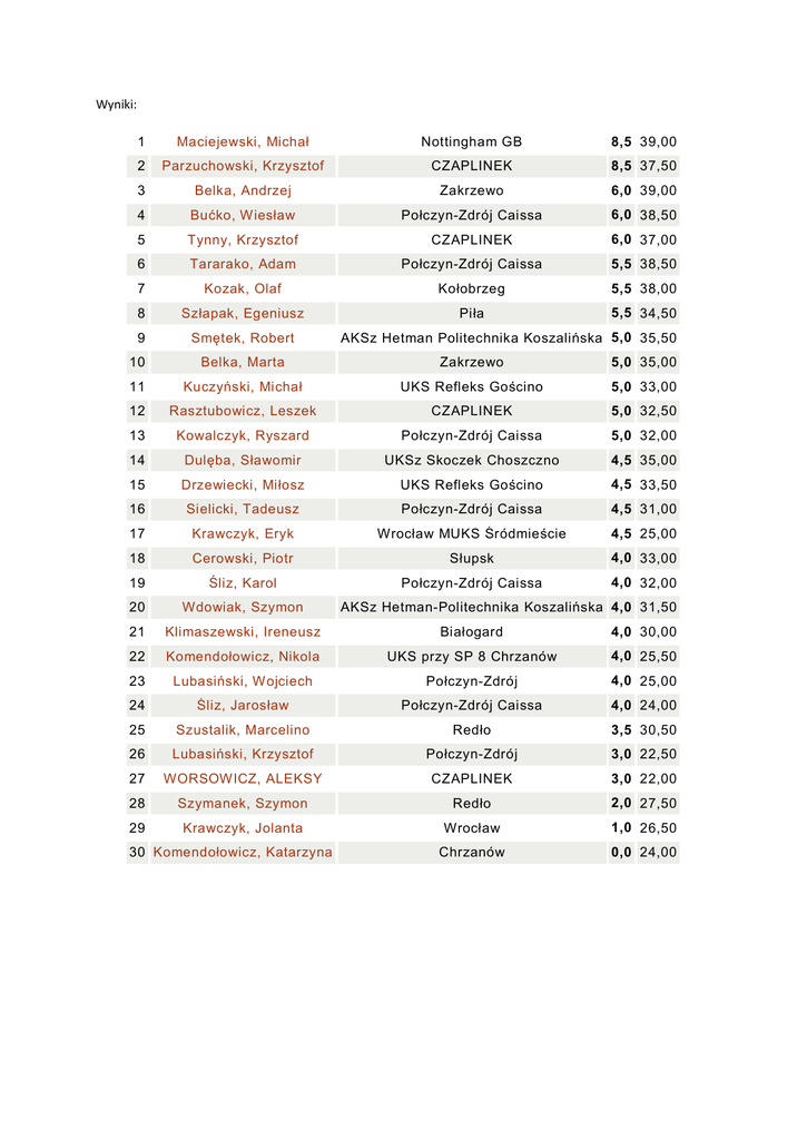 Wyniki: 1 Maciejewski, Michał Nottingham GB 8,5 39,00 2 Parzuchowski, Krzysztof CZAPLINEK 8,5 37,50 3 Belka, Andrzej Zakrzewo 6,0 39,00 4 Bućko, Wiesław Połczyn-Zdrój Caissa 6,0 38,50 5 Tynny, Krzysztof CZAPLINEK 6,0 37,00 6 Tararako, Adam Połczyn-Zdrój Caissa 5,5 38,50 7 Kozak, Olaf Kołobrzeg 5,5 38,00 8 Szłapak, Egeniusz Piła 5,5 34,50 9 Smętek, Robert AKSz Hetman Politechnika Koszalińska 5,0 35,50 10 Belka, Marta Zakrzewo 5,0 35,00 11 Kuczyński, Michał UKS Refleks Gościno 5,0 33,00 12 Rasztubowicz, Leszek CZAPLINEK 5,0 32,50 13 Kowalczyk, Ryszard Połczyn-Zdrój Caissa 5,0 32,00 14 Dulęba, Sławomir UKSz Skoczek Choszczno 4,5 35,00 15 Drzewiecki, Miłosz UKS Refleks Gościno 4,5 33,50 16 Sielicki, Tadeusz Połczyn-Zdrój Caissa 4,5 31,00 17 Krawczyk, Eryk Wrocław MUKS Śródmieście 4,5 25,00 18 Cerowski, Piotr Słupsk 4,0 33,00 19 Śliz, Karol Połczyn-Zdrój Caissa 4,0 32,00 20 Wdowiak, Szymon 21 Klimaszewski, Ireneusz Białogard 4,0 30,00 22 Komendołowicz, Nikola UKS przy SP 8 Chrzanów 4,0 25,50 23 Lubasiński, Wojciech Połczyn-Zdrój 4,0 25,00 24 Śliz, Jarosław Połczyn-Zdrój Caissa 4,0 24,00 25 Szustalik, Marcelino Redło 3,5 30,50 26 Lubasiński, Krzysztof Połczyn-Zdrój 3,0 22,50 27 WORSOWICZ, ALEKSY CZAPLINEK 3,0 22,00 28 Szymanek, Szymon Redło 2,0 27,50 29 Krawczyk, Jolanta Wrocław 1,0 26,50 Chrzanów 0,0 24,00 30 Komendołowicz, Katarzyna AKSz Hetman-Politechnika Koszalińska 4,0 31,50