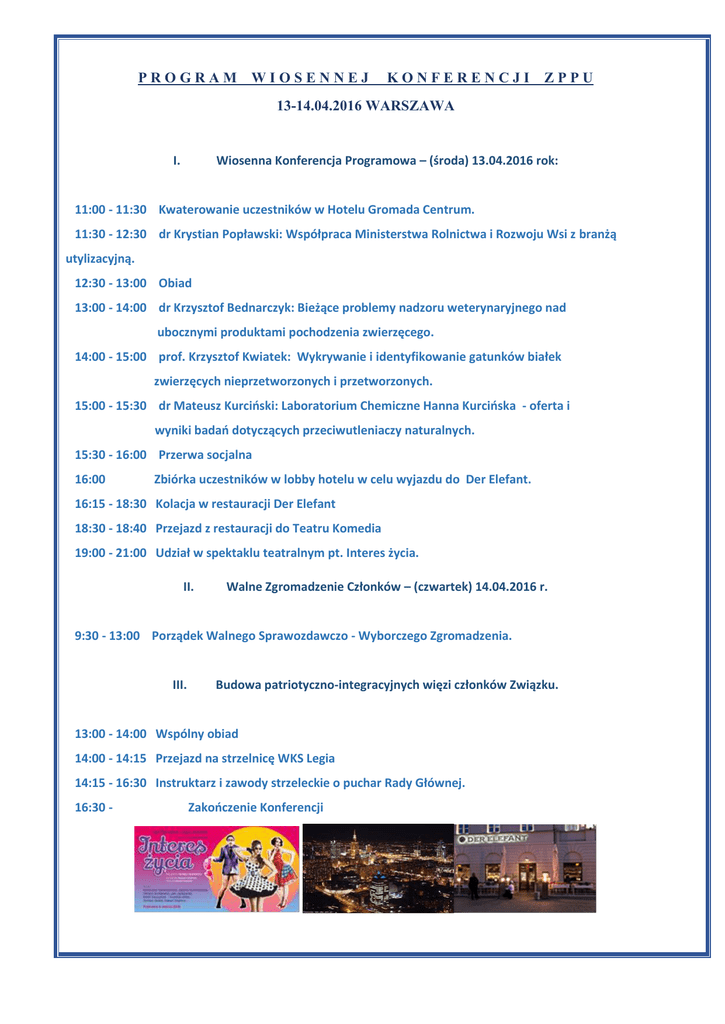 PROGRAM WIOSENNEJ KONFERENCJI ZPPU 13-14.04.2016 WARSZAWA I. Wiosenna Konferencja Programowa – (środa) 13.04.2016 rok: 11:00 - 11:30 Kwaterowanie uczestników w Hotelu Gromada Centrum. 11:30 - 12:30 dr Krystian Popławski: Współpraca Ministerstwa Rolnictwa i Rozwoju Wsi z branżą utylizacyjną. 12:30 - 13:00 Obiad 13:00 - 14:00 dr Krzysztof Bednarczyk: Bieżące problemy nadzoru weterynaryjnego nad ubocznymi produktami pochodzenia zwierzęcego. 14:00 - 15:00 prof. Krzysztof Kwiatek: Wykrywanie i identyfikowanie gatunków białek zwierzęcych nieprzetworzonych i przetworzonych. 15:00 - 15:30 dr Mateusz Kurciński: Laboratorium Chemiczne Hanna Kurcińska - oferta i wyniki badań dotyczących przeciwutleniaczy naturalnych. 15:30 - 16:00 Przerwa socjalna 16:00 Zbiórka uczestników w lobby hotelu w celu wyjazdu do Der Elefant. 16:15 - 18:30 Kolacja w restauracji Der Elefant 18:30 - 18:40 Przejazd z restauracji do Teatru Komedia 19:00 - 21:00 Udział w spektaklu teatralnym pt. Interes życia. II. Walne Zgromadzenie Członków – (czwartek) 14.04.2016 r. 9:30 - 13:00 Porządek Walnego Sprawozdawczo - Wyborczego Zgromadzenia. III. Budowa patriotyczno-integracyjnych więzi członków Związku. 13:00 - 14:00 Wspólny obiad 14:00 - 14:15 Przejazd na strzelnicę WKS Legia 14:15 - 16:30 Instruktarz i zawody strzeleckie o puchar Rady Głównej. 16:30 - Zakończenie Konferencji