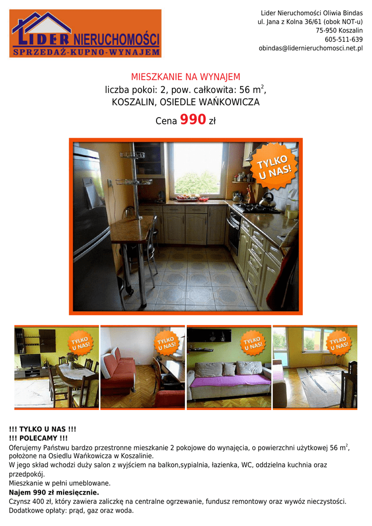 Lider Nieruchomości Oliwia Bindas ul. Jana z Kolna 36/61 (obok NOT-u) 75-950 Koszalin 605-511-639 [email protected] MIESZKANIE NA WYNAJEM liczba pokoi: 2, pow. całkowita: 56 m2, KOSZALIN, OSIEDLE WAŃKOWICZA Cena 990 zł !!! TYLKO U NAS !!! !!! POLECAMY !!! Oferujemy Państwu bardzo przestronne mieszkanie 2 pokojowe do wynajęcia, o powierzchni użytkowej 56 m2, położone na Osiedlu Wańkowicza w Koszalinie. W jego skład wchodzi duży salon z wyjściem na balkon,sypialnia, łazienka, WC, oddzielna kuchnia oraz przedpokój. Mieszkanie w pełni umeblowane. Najem 990 zł miesięcznie. Czynsz 400 zł, który zawiera zaliczkę na centralne ogrzewanie, fundusz remontowy oraz wywóz nieczystości. Dodatkowe opłaty: prąd, gaz oraz woda. Lider Nieruchomości Oliwia Bindas ul. Jana z Kolna 36/61 (obok NOT-u) 75-950 Koszalin 605-511-639 [email protected] Kaucja 1000 zł. !!! MIESZKANIE WYŁĄCZNIE DLA STUDENTÓW !!! Nieruchomość położona jest na terenie o bogatej infrastrukturze. W pobliżu liczne sklepy, szkoła, przedszkole oraz Politechnika Koszalińska. W niedalekiej odległości przystanek komunikacji miejskiej, z którego jest idealne połączenie w każdy zakątek Koszalina. !!! DOSTĘPNE OD ZARAZ DO CZERWCA !!! Oglądanie po wcześniejszym umówieniu z Pośrednikiem. Symbol 38/LDR/OMW Typ nieruchomości MIESZKANIE Rodzaj transakcji WYNAJEM Status AKTUALNA Rodzaj rynku WTÓRNY Cena 990 PLN Cena za m2 17,68 PLN Cena negocjowana NIE Kaucja 1 000,00 PLN Kraj POLSKA Województwo ZACHODNIOPOMORSKIE Powiat koszaliński Gmina KOSZALIN Miejscowość KOSZALIN Kod pocztowy 75-950 Dzielnica - osiedle OSIEDLE WAŃKOWICZA Położenie MIASTO Budynki w sąsiedztwie OSIEDLE BLOKÓW MIESZKALNYCH Pow. całkowita 56,00 m2 Pow. użytkowa 56,00 m2 Rodzaj mieszkania 2-POKOJOWE Rodzaj budynku BLOK Rok budowy 1980 Standard BARDZO DOBRY Konstrukcja budynku WIELKOPŁYTOWA Technika budowy WIELKA PŁYTA Typ kuchni Z OKNEM, ODDZIELNA Wyposażenie kuchni PEŁNE Liczba łazienek 1 Stan łazienki DOBRY Liczba WC 1 Droga dojazdowa CICHA ULICA Rodzaj nawierzchni ASFALTOWA / KOSTKA Liczba pokoi 2 Piętro 2 Liczba pięter 4 Ilość poziomów 1 Umeblowanie PEŁNE Źródło c.w. SIEĆ MIEJSKA Ogrzewanie C.O. Z SIECI MIEJSKIEJ Energia elektryczna JEST Podłączony gaz JEST Rodzaj kanalizacji MIEJSKA Źródło wody WODA MIEJSKA Lider Nieruchomości Oliwia Bindas ul. Jana z Kolna 36/61 (obok NOT-u) 75-950 Koszalin 605-511-639 [email protected] Głośność okolicy CICHE Lodówka JEST Piekarnik JEST Kuchnia gazowa JEST Domofon JEST Rodzaj okien PLASTIKOWE Rodzaj podłogi TERAKOTA, PARKIET Balkon JEST Widok na wschód JEST Widok na zachód JEST Oliwia Bindas Dyrektor 605 511 639 [email protected] Więcej ofert na stronie www.lidernieruchomosci.net.pl