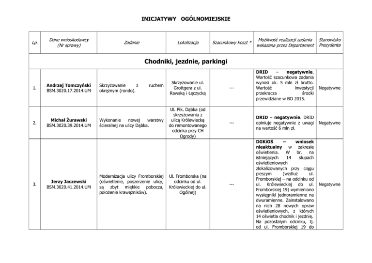 INICJATYWY OGÓLNOMIEJSKIE Lp. Dane wnioskodawcy (Nr sprawy) Zadanie Lokalizacja Szacunkowy koszt * Możliwość realizacji zadania wskazana przez Departament Stanowisko Prezydenta Chodniki, jezdnie, parkingi 1. 2. 3. Andrzej Tomczyński BSM.3020.17.2014.UM Michał Żurawski BSM.3020.39.2014.UM Jerzy Jaczewski BSM.3020.41.2014.UM Skrzyżowanie z okrężnym (rondo). ruchem Wykonanie nowej warstwy ścieralnej na ulicy Dąbka. Modernizacja ulicy Fromborskiej (oświetlenie, poszerzenie ulicy, są zbyt miękkie pobocza, położenie krawężników). DRID – negatywnie. Wartość szacunkowa zadania wynosi ok. 5 mln zł brutto. Wartość inwestycji przekracza środki przewidziane w BO 2015. Skrzyżowanie ul. Grottgera z ul. Rawską i Łęczycką --- Ul. Płk. Dąbka (od skrzyżowania z ulicą Królewiecką do remontowanego odcinka przy CH Ogrody) --- DRID – negatywnie. DRID opiniuje negatywnie z uwagi na wartość 6 mln zł. Negatywne Ul. Fromborska (na odcinku od ul. Królewieckiej do ul. Ogólnej) --- DGKiOŚ – wniosek nieaktualny w zakresie oświetlenia. W br. na istniejących 14 słupach oświetleniowych zlokalizowanych przy ciągu pieszym (wzdłuż ul. Fromborskiej – na odcinku od ul. Królewieckiej do ul. Fromborskiej 19) wymieniono wysięgniki jednoramienne na dwuramienne. Zainstalowano na nich 28 nowych opraw oświetleniowych, z których 14 oświetla chodnik i jezdnię. Na pozostałym odcinku, tj. od ul. Fromborskiej 19 do Negatywne Negatywne INICJATYWY OGÓLNOMIEJSKIE Lp. Dane wnioskodawcy (Nr sprawy) Zadanie Lokalizacja Szacunkowy koszt * Możliwość realizacji zadania wskazana przez Departament Stanowisko Prezydenta Ogólnej oświetlenie należy budować wraz z drogą. DRID – negatywnie. Wartość szacunkowa zadania wynosi około 1.600.00,00 zł brutto. Wartość inwestycji przekracza środki przewidziane w budżecie obywatelskim. 4. 5. 6. Ewa Mickiewicz BSM.3020.98.2014.UM Wykonanie chodnika dla pieszych do schroniska dla zwierząt na ul. Królewieckiej. Ul. Królewiecka od nr 223 do nr 233 Do 400.000,00 DRID – pozytywnie. Pozytywne Halina Kufel BSM.3020.105.2014.UM Bezpieczne dojście do ogrodów działkowych ROD „Kotlinka” ul. Łęczycka. Położenie chodnika przy płocie Cmentarza Dębica Górna. Ul. Łęczycka 60.000,00 DRID – pozytywnie. Pozytywne Położenie kładki lub innego rozwiązania łączącego dwie dzielnice miasta. Os. Nad Jarem – okolice ul. Tuwima przez wąwóz na os. Modrzewina DGKiOŚ+DRID negatywnie. DUA – Tereny Modrzewiny sąsiadujące z osiedlem „Nad Jarem” (rozdzielone terenami jaru rzeki ekologicznymi Babica) w planie miejscowym przeznaczone są pod lokalizację zabudowy techniczno – produkcyjnej (jednostka planu 4.3.PT). Na plan nie tym terenie przewiduje publicznych terenów zielenie Negatywne Krystyna Bielińska BSM.3020.124.2014.UM --- INICJATYWY OGÓLNOMIEJSKIE Lp. Dane wnioskodawcy (Nr sprawy) Zadanie Lokalizacja Szacunkowy koszt * Możliwość realizacji zadania wskazana przez Departament Stanowisko Prezydenta rekreacyjnej, ciągów pieszych, jak również połączenia tego obszaru z terenem osiedla Nad Jarem przez istniejący wąwóz. 7. 8. 9. 10. Karol Gorobec BSM.3020.155.2014.UM Piotr Bancerz BSM.3020.161.2014.UM Irena Oczkoś BSM.3020.180.2014.UM Mateusz Milanowski BSM.3020.191.2014.UM Bezpieczne przejście pieszych przy IV LO. Oznakowanie przejść pieszych przy szkołach. dla dla Deptak spacerowy na Bulwarze Zygmunta Augusta. Wymiana nawierzchni na drodze dojazdowej do Jeziora Martwego – Jelenia Dolina. Przejście i schody – Oliwska / Sienkiewicza – IV LO Teren miasta (w okolicy szkół głównie podstawowych i gimnazjalnych) Bulwar Zygmunta Augusta do ul. Panieńskiej do mostu Droga dojazdowa od ul. Fromborskiej do Jeziora Martwego (miejsce rekreacji Jelenia Dolina – parking „Smoki”) uszkodzony odcinek 60.000,00 (chodnik) --- DRID – pozytywnie. DRID – negatywnie Zadanie jest na bieżąco realizowane przez DRID zgodnie z przepisami. Pozytywne (w zakresie wskazany m przez Departame nt) Negatywne 220.000,00 DRID – pozytywnie. Wysokość środków dotyczy tylko pasa drogowego. Pozytywne (w zakresie wskazany m przez Departame nt) Do 400.000,00 DRID – pozytywnie do kwoty 400 tys. zł, gdyż wartość całego zadania wynosi 1,9 mln zł, co przekracza środki przeznaczone na BO. Pozytywne INICJATYWY OGÓLNOMIEJSKIE Lp. Dane wnioskodawcy (Nr sprawy) Zadanie Lokalizacja Szacunkowy koszt * Możliwość realizacji zadania wskazana przez Departament Stanowisko Prezydenta nawierzchni o długości 2,5 km 11. Stanisław Szczepański BSM.3020.197.2014.UM Remont tarasu i schodów przy ul. 1 Maja w reprezentacyjnym ciągu komunikacyjnym łączącym ścisłe centrum miasta ze Starówką. Centrum Miasta Ok. 200.000,00 DRID – oszacowanie. DGNiG – pozytywnie. Jednocześnie DGNiG informuje, że zadanie nie może być realizowane etapami. Pozytywne Oświetlenie, sygnalizacja świetlna 12. Marek Gierszewski BSM.3020.84.2014.UM Modernizacja sygnalizacji świetlnej na głównych skrzyżowaniach w mieście. Całe Miasto --- DRID – negatywnie. Wartość szacunkowa przewyższa BO 2015 (ponad 1 mln zł). Negatywne DGNiG+ZBK – pozytywnie plac zabaw w zmienionej lokalizacji, ponieważ przedmiotowa nieruchomość docelowo zostanie przeznaczona do zbycia, w związku z powyższym wykonanie wnioskowanej inwestycji jako tymczasowej Pozytywne (w zakresie wskazany m przez Departame nt) Place zabaw, boiska, kompleksy rekreacyjne 13. Grażyna Zimmermann BSM.3020.61.2014.UM Budowa placu zabaw dla dzieci z ulic Dolna, Pływacka, Niska. Barierki przy tramwaju. Ul. Dolna 150.000,00 (plac zabaw) INICJATYWY OGÓLNOMIEJSKIE Lp. Dane wnioskodawcy (Nr sprawy) Zadanie Lokalizacja Szacunkowy koszt * Możliwość realizacji zadania wskazana przez Departament Stanowisko Prezydenta jest niezasadne. Proponuje się lokalizację na rogu ul. Nowej i Browarnej od strony ronda, Dz. 53/78. TE – negatywnie w zakresie barierek (płotków). Płotki zos