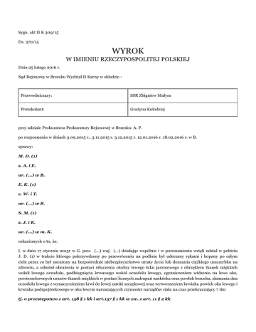 Sygn. akt II K 309/15 Ds. 370/15 WYROK W IMIENIU RZECZYPOSPOLITEJ POLSKIEJ Dnia 25 lutego 2016 r. Sąd Rejonowy w Brzesku Wydział II Karny w składzie : Przewodniczący: SSR Zbigniew Małysa Protokolant: Grażyna Kołodziej przy udziale Prokuratora Prokuratury Rejonowej w Brzesku: A. P. po rozpoznaniu w dniach 3.09.2015 r., 3.11.2015 r. 3.12.2015 r. 12.01.2016 r. 18.02.2016 r. w B. sprawy: M. D. (1) s. A. i E. ur. (...) w B. E. K. (1) c. W. i T. ur. (...) w B. S. M. (1) s. J. i K. ur. (...) w m. K. oskarżonych o to, że: I. w dniu 17 stycznia 2015r w G. pow. (...) woj. (...) działając wspólnie i w porozumieniu wzięli udział w pobiciu J. D. (1) w trakcie którego pokrzywdzony po przewróceniu na podłoże był uderzany rękami i kopany po całym ciele przez co był narażony na bezpośrednie niebezpieczeństwo utraty życia lub doznania ciężkiego uszczerbku na zdrowiu, a odniósł obrażenia w postaci stłuczenia okolicy lewego łuku jarzmowego z obrzękiem tkanek miękkich wokół lewego oczodołu, podbiegnięcia krwawego wokół oczodołu lewego, ograniczeniem widzenia na lewe oko, powierzchownych urazów tkanek miękkich w postaci licznych zadrapań naskórka oraz powłok brzucha, złamania dna oczodołu lewego z wynaczynieniem krwi do lewej zatoki szczękowej oraz wytworzeniem krwiaka powiek oka lewego i krwiaka podspojówkowego w oku lewym naruszających czynności narządów ciała na czas przekraczający 7 dni tj. o przestępstwo z art. 158 § 1 kk i art.157 § 1 kk w zw. z art. 11 § 2 kk a S. M. (1) również o to, że II. W dniu 07 kwietnia 2015r w G. pow. (...) woj. (...) groził L. K. pozbawieniem życia przy czym groźba ta wzbudzała u niej uzasadnioną obawę, że zostanie spełniona tj. o przestępstwo z art. 190 § 1 kk III. W dniu 07 kwietnia 2015r w G. pow. (...) woj. (...) groził H. C. (1) pozbawieniem życia przy czym groźba ta wzbudzała u niej uzasadnioną obawę, że zostanie spełniona tj. o popełnienie przestępstwa z art. 190 § l kk IV. W dniu 07 kwietnia 2015r w G. pow. (...) woj. (...) groził T. C. (1) pozbawieniem życia przy czym groźba ta wzbudzała u niego uzasadnioną obawę, że zostanie spełniona tj. o popełnienie przestępstwa z art. l90 § l kk I. uznaje oskarżonych M. D. (1), E. K. (1) i S. M. za winnych popełnienia czynu zarzucanego im w pkt I aktu oskarżenia, a stanowiącego przestępstwo z art. 158 § 1 kk i art.157 § 1 kk w zw. z art. 11 § 2 kk i za to na mocy art. 157 §1 kk w zw. z art. 11 § 3 kk wymierza oskarżonym M. D. (1) i S. M. (1) kary w wymiarze po 1 (jednym) roku pozbawienia wolności, zaś oskarżonej E. K. (1) karę 6 (sześciu) miesięcy pozbawienia wolności, II. na mocy art. 46 § 2 kk orzeka wobec oskarżonych M. D. (1) i S. M. (1) kwoty po 4 000 (cztery tysiące) złotych od każdego z nich, zaś wobec oskarżonej E. K. (1) kwotę 2 000 (dwa tysiące) złotych na rzecz pokrzywdzonego J. D. (1) tytułem nawiązki, III. uznaje oskarżonego S. M. (1) za winnego czynów opisanych w pkt od II – IV aktu oskarżenia co w każdym z tych przypadków stanowi przestępstwo z art. 190 § 1 kk i za to na mocy powołanego przepisu wymierza mu kary po 3 (trzy) miesiące pozbawienia wolności za każdy czyn, IV. na mocy art. 85 kk i art. 86 § 1 kk w brzemieniu obowiązującym do 30.06.2015 r. w zw. z art. 4 § 1 kk w miejsce jednostkowych kar pozbawienia wolności orzeczonych w pkt I i III wyroku orzeka wobec oskarżonego S. M. (1) karę łączną w wymiarze 1 (jednego) roku pozbawienia wolności, V. na mocy art. 69 § 1 i 2 kk i art. 70 § 1 pkt 1 kk w brzmieniu obowiązującym do 30.06.2015 r. w zw. z art. 4 § 1 kk wykonanie orzeczonej kary pozbawienia wolności wobec E. K. (1) i kary łącznej pozbawienia wolności wobec S. M. (1) warunkowo zawiesza na okres próby wynoszący po 2 (dwa) lata wobec każdego z nich, VI. na mocy art. 69 § 1 i § 2 kk i art. 70 § 2 kk w brzmieniu obowiązującym do 30.06.2015 r. w zw. z art. 4 § 1 kk wykonanie orzeczonej kary pozbawienia wolności warunkowo zawiesza wobec oskarżonego M. D. (1) na okres próby wynoszący 3 (trzy) lata, VII. na mocy art. 73 § 2 kk oddaje oskarżonego M. D. (1) w okresie próby pod dozór kuratora sądowego, VIII. na mocy art. 29 ust.1 ustawy Prawo o adwokaturze zasądza od Skarbu Państwa na rzecz Kancelarii Adwokackiej adw. L. R. kwotę 1394,82 (tysiąc trzysta dziewięćdziesiąt cztery 82/100) złotych tytułem kosztów pełnomocnictwa oskarżyciela posiłkowego z urzędu, IX. na podstawie art. 624 § 1 kpk zwalnia oskarżonych w całości od ponoszenia na rzecz Skarbu Państwa kosztów sądowych. Sygn. akt II K 309/15 UZASADNIENIE Sąd ustalił następujący stan faktyczny: W miejscowości G. mieszkali do 2016 r. wdowa E. K. (1) i jej konkubin S. M. (1). Obecnie oboje wyprowadzili się już z G.. E. K. (1) zamieszkała w B. zaś S. M. na terenie woj. (...). ( wiadomość znana sądowi z urzędu ). W tej samej miejscowości mieszka także 19 letni J. D. (1) - siostrzeniec E. K. (1). W dniu 17.01.2015 r. J. D. (1) wraz ze swoim kolegą M. D. (1) spożywali wspólnie alkohol w postaci piwa, a następnie wódki kupionej w sklepie w L.. Pod wpływem alkoholu obaj zdemolowali wiatę przystanku autobusowego w G. na kwotę 1500 złotych. Za zniszczenie mienia M. D. został prawomocnie skazany za przest. z art. 288 § 1 kk na karę 5 miesięcy pozbawienia wolności z warunkowym zawieszeniem na okres 3 lat próby wraz z obowiązkiem naprawienia szkody. J. D. (1) za to samo przestępstwo skazany został skazany w sprawie II K 119/15 na jednostkową karę 8 miesięcy pozbawienia wolności. Również on został zobowiązany do naprawienia szkody na rzecz Urzędu Gminy G.. ( d. odpis wyroku M. D. w sprawie II K 101/15, k. 110, odpis wyroku w sprawie II K 119/15, k. 249, zezn. J. D., k. 224-226, 2, 60 ) Następnie tego dnia w godzinach wieczornych J. D. (1) wraz ze swoim kolegą M. D. (1) udali się do domu E. K. (1) aby tam dalej spożywać alkohol. Na pomys