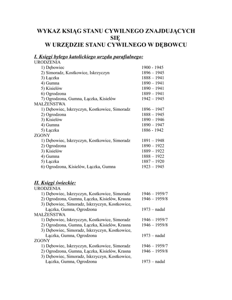 WYKAZ KSIĄG STANU CYWILNEGO ZNAJDUJĄCYCH SIĘ W URZĘDZIE STANU CYWILNEGO W DĘBOWCU I. Księgi byłego katolickiego urzędu parafialnego: URODZENIA 1) Dębowiec 2) Simoradz, Kostkowice, Iskrzyczyn 3) Łączka 4) Gumna 5) Kisielów 6) Ogrodzona 7) Ogrodzona, Gumna, Łączka, Kisielów MAŁŻEŃSTWA 1) Dębowiec, Iskrzyczyn, Kostkowice, Simoradz 2) Ogrodzona 3) Kisielów 4) Gumna 5) Łączka ZGONY 1) Dębowiec, Iskrzyczyn, Kostkowice, Simoradz 2) Ogrodzona 3) Kisielów 4) Gumna 5) Łączka 6) Ogrodzona, Kisielów, Łączka, Gumna 1900 - 1945 1896 – 1945 1888 – 1941 1890 – 1941 1890 – 1941 1889 – 1941 1942 – 1945 1896 – 1947 1888 – 1945 1890 – 1946 1890 – 1947 1886 - 1942 1891 – 1948 1890 – 1922 1889 – 1922 1888 – 1922 1887 – 1920 1923 – 1945 II. Księgi świeckie: URODZENIA 1) Dębowiec, Iskrzyczyn, Kostkowice, Simoradz 2) Ogrodzona, Gumna, Łączka, Kisielów, Krasna 3) Dębowiec, Simoradz, Iskrzyczyn, Kostkowice, Łączka, Gumna, Ogrodzona MAŁŻEŃSTWA 1) Dębowiec, Iskrzyczyn, Kostkowice, Simoradz 2) Ogrodzona, Gumna, Łączka, Kisielów, Krasna 3) Dębowiec, Simoradz, Iskrzyczyn, Kostkowice, Łączka, Gumna, Ogrodzona ZGONY 1) Dębowiec, Iskrzyczyn, Kostkowice, Simoradz 2) Ogrodzona, Gumna, Łączka, Kisielów, Krasna 3) Dębowiec, Simoradz, Iskrzyczyn, Kostkowice, Łączka, Gumna, Ogrodzona 1946 – 1959/7 1946 – 1959/8 1973 – nadal 1946 – 1959/7 1946 – 1959/8 1973 – nadal 1946 – 1959/7 1946 – 1959/8 1973 – nadal UWAGI! 1. Księgi Parafialnego Urzędu Ewangelickiego oraz księgi świeckie z lat 1960 – 1972 znajdują się w: a)USC Skoczów – dotyczące Dębowca, Simoradza, Iskrzyczyna, Kostkowic b)USC Cieszyn – dotyczące Ogrodzonej, Gumien, Łączki, Kisielowa, Krasnej 2. Księgi dotyczące miejscowości Kisielów znajdują się w: a) do 1945 r. (wyznanie katolickie) – USC Dębowiec (wyznanie ewangelickie) – USC Goleszów b) 1946 – 1959 – USC Dębowiec c) 1960 – 1972 – USC Cieszyn d)od 1973 r. – USC Goleszów REJESTRACJA NIETYPOWA Księga urodzeń miejscowości Ogrodzona zaczyna się rokiem 1889, lecz po pag. 111 są zapisy odnośnie urodzeń dzieci wyznania żydowskiego z lat 1867 – 1880 czyli z okresu przed założeniem księgi, oznakowane stroną pag. 1 W Strumieniu znajdują się księgi parafialne ewangelickie z Drogomyśla z lat 1936-1942 i 1945/E Polskie księgi stanu cywilnego z obszarów które obecnie wchodzą w skład państw federacji rosyjskiej znajdują się w USC Warszawa Śródmieście. Akta stanu cywilnego odtworzone w postępowaniu sadowym w okresie od 28.10.1947 do 30.04.1952 znajdują się w USC Łódź Centrum