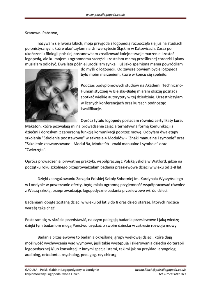 www.polskilogopeda.co.uk Szanowni Państwo, nazywam się Iwona Libich, moja przygoda z logopedią rozpoczęła się już na studiach polonistycznych, które ukończyłam na Uniwersytecie Śląskim w Katowicach. Zaraz po ukończeniu filologii polskiej postanowiłam zrealizować kolejne swoje marzenie i zostać logopedą, ale ku mojemu ogromnemu szczęściu zostałam mamą prześlicznej córeczki i plany musiałam odłożyć. Dwa lata później urodziłam synka i już jako spełniona mama powróciłam do myśli o logopedii. Od zawsze bowiem bycie logopedą było moim marzeniem, które w końcu się spełniło. Podczas podyplomowych studiów na Akademii TechnicznoHumanistycznej w Bielsku-Białej miałam okazję poznać i spotkać wielkie autorytety w tej dziedzinie. Uczestniczyłam w licznych konferencjach oraz kursach podnosząc kwalifikacje. Oprócz tytułu logopedy posiadam również certyfikaty kursu Makaton, które pozwalają mi na prowadzenie zajęć alternatywną formą komunikacji z dziećmi i dorosłymi z zaburzoną funkcją komunikacji poprzez mowę. Odbyłam dwa etapy szkolenia "Szkolenie podstawowe" w zakresie 4 Modułów - "Znaki manualne i symbole" oraz "Szkolenie zaawansowane - Moduł 9a, Moduł 9b - znaki manualne i symbole" oraz "Zwierzęta". Oprócz prowadzenia prywatnej praktyki, współpracuję z Polską Szkołą w Watford, gdzie na początku roku szkolnego przeprowadzałam badania przesiewowe dzieci w wieku od 3-8 lat. Dzięki zaangażowaniu Zarządu Polskiej Szkoły Sobotniej im. Kardynała Wyszyńskiego w Londynie w poszerzanie oferty, będę miała ogromną przyjemność współpracować również z Waszą szkołą, przeprowadzając logopedyczne badania przesiewowe wśród dzieci. Badaniami objęte zostaną dzieci w wieku od lat 3 do 8 oraz dzieci starsze, których rodzice wyrażą taka chęć. Postaram się w skrócie przedstawić, na czym polegają badania przesiewowe i jaką wiedzę dzięki tym badaniom mogą Państwo uzyskać o swoim dziecku w zakresie rozwoju mowy. Badania przesiewowe to badania określonej grupy wiekowej dzieci, które dają możliwość wychwycenia wad wymowy, jeśli takie występują i skierowania dziecka do terapii logopedycznej i/lub konsultacji z innymi specjalistami, takimi jak na przykład laryngolog, audiolog, ortodonta, psycholog, pedagog, czy chirurg. GADUŁA - Polski Gabinet Logopedyczny w Londynie Dyplomowany Logopeda Iwona Libich [email protected] tel. 07508 609 703 www.polskilogopeda.co.uk Badanie przesiewowe przeprowadzone jest w formie krótkiej zabawy z dzieckiem, podczas której wykorzystuję testy obrazkowe, pacynki, prowadzę krótka rozmowę z dzieckiem badając jego mowę spontaniczną. Podczas takiego badania sprawdzam prawidłową budowę aparatu artykulacyjnego (język, zęby, podniebienie, zgryz, wargi) oraz przeprowadzam orientacyjne badanie słuchu. Dla każdego z przebadanych dzieci opracowuję indywidualną informację, którą otrzymują Rodzice po zakończeniu badań. Wszystkie informacje o dziecku są poufne, a wyniki badań nie są rozpowszechniane ani upubliczniane bez pisemnej zgody Rodziców. Badanie nie jest obowiązkowe, dlatego do przeprowadzenia takiego badania z Państwa dziećmi również potrzebna jest pisemna zgoda Rodzica. Formularz przekażą Wam nauczycielki. O terminie rozpoczęcia badań zostaną Państwo poinformowani za pośrednictwem Szkoły. Serdecznie pozdrawiam, a w razie jakichkolwiek pytań i wątpliwości pozostaję do dyspozycji. mgr Iwona Libich, logopeda GADUŁA - Polski Gabinet Logopedyczny w Londynie Dyplomowany Logopeda Iwona Libich [email protected] tel. 07508 609 703