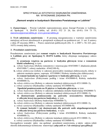 IGM.343- 27/2008 -1- SPECYFIKACJA ISTOTNYCH WARUNKÓW ZAMÓWIENIA NA WYKONANIE ZADANIA PN. „Remont wnętrz w budynkach Starostwa Powiatowego w Lublinie” 1. Zamawiający – Powiat Lubelski reprezentowany przez Zarząd Powiatu w Lublinie, ul. Spokojna 9, 20-074 Lublin, tel. (0-81) 532 21 26, fax (0-81) 534 73 73, [email protected], www.powiat.lublin.pl. 2. Tryb udzielenia zamówienia – II przetarg nieograniczony o wartości zamówienia mniejszej od kwot określonych w przepisach wydanych na podstawie art. 11 ust. 8 ustawy z dnia 29 stycznia 2004 r. – Prawo zamówień publicznych (Dz. U. z 2007 r. Nr 223, poz. 1655) zwanej dalej ustawą. 3. Przedmiot zamówienia. Przedmiotem zamówienia jest remont wnętrz w budynkach Starostwa Powiatowego w Lublinie przy ul. Spokojnej 9, 20-074 Lublin, który obejmuje następujący zakres robót : 1) aranŜacja wnętrza na parterze w budynku głównym wraz z remontem klatki schodowej, w tym: a. roboty budowlane (Roboty remontowe i renowacyjne 45453000-7, kładzenie płytek 45431000-7, roboty malarskie 45442100-8), b. roboty elektryczne (roboty w zakresie przewodów instalacji elektrycznych, roboty w zakresie montaŜu opraw, osprzętu 43310000-3 Roboty instalacyjne elektryczne); 2) remont łazienki na I piętrze i parterze w budynku głównym, w tym: a. roboty budowlane (Pokrywanie podłóg i ścian 45430000-0, Roboty malarskie 45440000-3), b. roboty elektryczne (Roboty w zakresie instalacji elektrycznych 453110000–3), c. roboty sanitarne (Hydraulika i roboty sanitarne 45330000-9); 3)podział pomieszczenia na II piętrze w budynku głównym, w tym: a. roboty budowlane (Roboty w zakresie zakładania stolarki budowlanej 45420000-7) b. roboty elektryczne (Roboty w zakresie instalacji elektrycznych 453110000–3); 4) dostosowanie pomieszczenia na potrzeby orzecznictwa lekarskiego w oficynie lewej (na parterze budynku), w tym: a. roboty budowlane (Roboty budowlane 45000000-7), b. roboty elektryczne (Roboty w zakresie instalacji elektrycznych 453110000–3), c. roboty sanitarne (Hydraulika i roboty sanitarne 45330000-9); 5) remont łazienki i jej dostosowanie dla potrzeb osób niepełnosprawnych w oficynie lewej (na parterze budynku), w tym: a. roboty budowlane (Pokrywanie podłóg i ścian 45430000-0, Roboty malarskie 45440000-3), b. roboty elektryczne (Roboty w zakresie instalacji elektrycznych 453110000–3), c. roboty sanitarne (Hydraulika i roboty sanitarne 45330000-9). Szczegółowe warunki jakie ma spełniać przedmiot zamówienia, a takŜe zakres robót określa dokumentacja techniczna stanowiąca załącznik nr 3 do niniejszej specyfikacji. IGM.343- 27/2008 -2- Wskazanie w dokumentacji technicznej znaków towarowych lub pochodzenia materiałów i wyrobów naleŜy rozumieć jako określenie wymaganych dla nich parametrów technicznych lub standardów jakościowych. Do realizacji zamówienia mogą być uŜyte inne materiały czy wyroby, ale o parametrach technicznych lub standardach jakościowych nie mniejszych niŜ wskazane w specyfikacji. Oznacza to, Ŝe zgodnie z art. 29 ust. 3 ustawy dopuszcza się stosowanie produktów równowaŜnych. 4. Oferty częściowe. Nie dopuszcza się moŜliwości składania ofert częściowych. 5. Zamówienia uzupełniające. Nie przewiduje się udzielenia zamówień uzupełniających. 6. Oferty wariantowe. Nie dopuszcza się moŜliwości składania ofert wariantowych. 7. Termin wykonania zamówienia. Wymagany termin realizacji zamówienia – 17 listopada 2008 r. 8. Opis warunków udziału w postępowaniu oraz opis sposobu dokonywania oceny spełnienia tych warunków. O udzielenie niniejszego zamówienia mogą ubiegać się Wykonawcy, którzy: 1) spełniają warunki określone w art. 22 ust. 1 z dnia 29.01.2004 r. – Prawo zamówień publicznych (Dz. U. z 2007 r. Nr 223, poz. 1655) oraz nie podlegają wykluczeniu na podstawie art. 24 niniejszej ustawy, 2) są uprawnieni do występowania w obrocie prawnym, 3) wykonali w ciągu ostatnich 5 lat przed dniem wszczęcia niniejszego postępowania, a jeŜeli okres prowadzenia działalności jest krótszy – za ten okres, roboty budowlane odpowiadające swoim rodzajem (realizacja remontów obejmująca branŜę budowlaną – w tym branŜę sanitarną i elektryczną) i wartością robotom budowlanym stanowiącym przedmiot zamówienia. Ocena spełniania warunków zostanie przeprowadzona w oparciu o przedłoŜone dokumenty opisane w punkcie 9 niniejszej SIWZ, które będą sprawdzane pod względem zgodności z prawem oraz kompletności. 9. Informacja o oświadczeniach i dokumentach jakie mają dostarczyć wykonawcy w celu potwierdzenia spełniania warunków udziału w postępowaniu. W celu potwierdzenia, Ŝe wykonawca spełnia warunki udziału w niniejszym postępowaniu jest zobowiązany do złoŜenia – w formie oryginału lub kserokopii poświadczonej przez siebie za zgodność z oryginałem, następujących dokumentów: a) oświadczenia o spełnianiu warunków udziału określonych przepisem art. 22 ust. 1 pkt 1-4 ww. ustawy (wg wzoru - zał. nr 1 do formularza ofertowego), b) odpisu z właściwego rejestru albo zaświadczenia o wpisie do ewidencji działalności gospodarczej (wystawionego nie wcześniej niŜ 6 m-cy przed upływem terminu składania ofert)*, c) wykazu wykonanych robót budowlanych w ciągu ostatnich 5 lat przed dniem wszczęcia niniejszego postępowania, a jeŜeli okres prowadzenia działalności jest krótszy – za ten okres, odpowiadających swoim rodzajem (realizacja remontów obejmująca branŜę budowlaną – w tym branŜę sanitarną i elektryczną) i wartością robotom budowlanym stanowiącym przedmiot zamówienia z podaniem ich wartości, daty i miejsca wykonania oraz załączeniem dokumentów potwierdzających, Ŝe roboty te wykonane zostały naleŜycie (naleŜy załączyć 2 referencje). IGM.343- 27/2008 -3- * JeŜeli Wykonawca ma siedzibę lub miejsce zamieszkania poza terytorium Rzeczypospolitej Polskiej zamiast dokumentów, o których mo