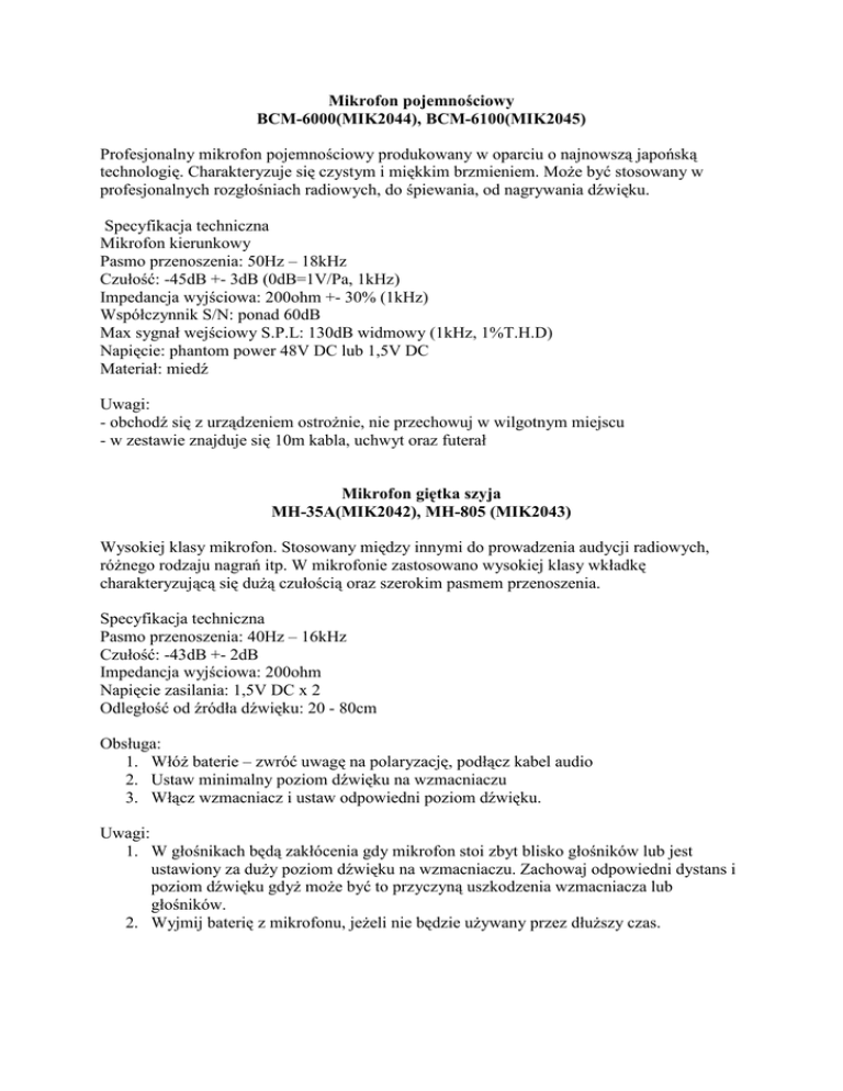 Mikrofon pojemnościowy BCM-6000(MIK2044), BCM-6100(MIK2045) Profesjonalny mikrofon pojemnościowy produkowany w oparciu o najnowszą japońską technologię. Charakteryzuje się czystym i miękkim brzmieniem. MoŜe być stosowany w profesjonalnych rozgłośniach radiowych, do śpiewania, od nagrywania dźwięku. Specyfikacja techniczna Mikrofon kierunkowy Pasmo przenoszenia: 50Hz – 18kHz Czułość: -45dB +- 3dB (0dB=1V/Pa, 1kHz) Impedancja wyjściowa: 200ohm +- 30% (1kHz) Współczynnik S/N: ponad 60dB Max sygnał wejściowy S.P.L: 130dB widmowy (1kHz, 1%T.H.D) Napięcie: phantom power 48V DC lub 1,5V DC Materiał: miedź Uwagi: - obchodź się z urządzeniem ostroŜnie, nie przechowuj w wilgotnym miejscu - w zestawie znajduje się 10m kabla, uchwyt oraz futerał Mikrofon giętka szyja MH-35A(MIK2042), MH-805 (MIK2043) Wysokiej klasy mikrofon. Stosowany między innymi do prowadzenia audycji radiowych, róŜnego rodzaju nagrań itp. W mikrofonie zastosowano wysokiej klasy wkładkę charakteryzującą się duŜą czułością oraz szerokim pasmem przenoszenia. Specyfikacja techniczna Pasmo przenoszenia: 40Hz – 16kHz Czułość: -43dB +- 2dB Impedancja wyjściowa: 200ohm Napięcie zasilania: 1,5V DC x 2 Odległość od źródła dźwięku: 20 - 80cm Obsługa: 1. WłóŜ baterie – zwróć uwagę na polaryzację, podłącz kabel audio 2. Ustaw minimalny poziom dźwięku na wzmacniaczu 3. Włącz wzmacniacz i ustaw odpowiedni poziom dźwięku. Uwagi: 1. W głośnikach będą zakłócenia gdy mikrofon stoi zbyt blisko głośników lub jest ustawiony za duŜy poziom dźwięku na wzmacniaczu. Zachowaj odpowiedni dystans i poziom dźwięku gdyŜ moŜe być to przyczyną uszkodzenia wzmacniacza lub głośników. 2. Wyjmij baterię z mikrofonu, jeŜeli nie będzie uŜywany przez dłuŜszy czas.