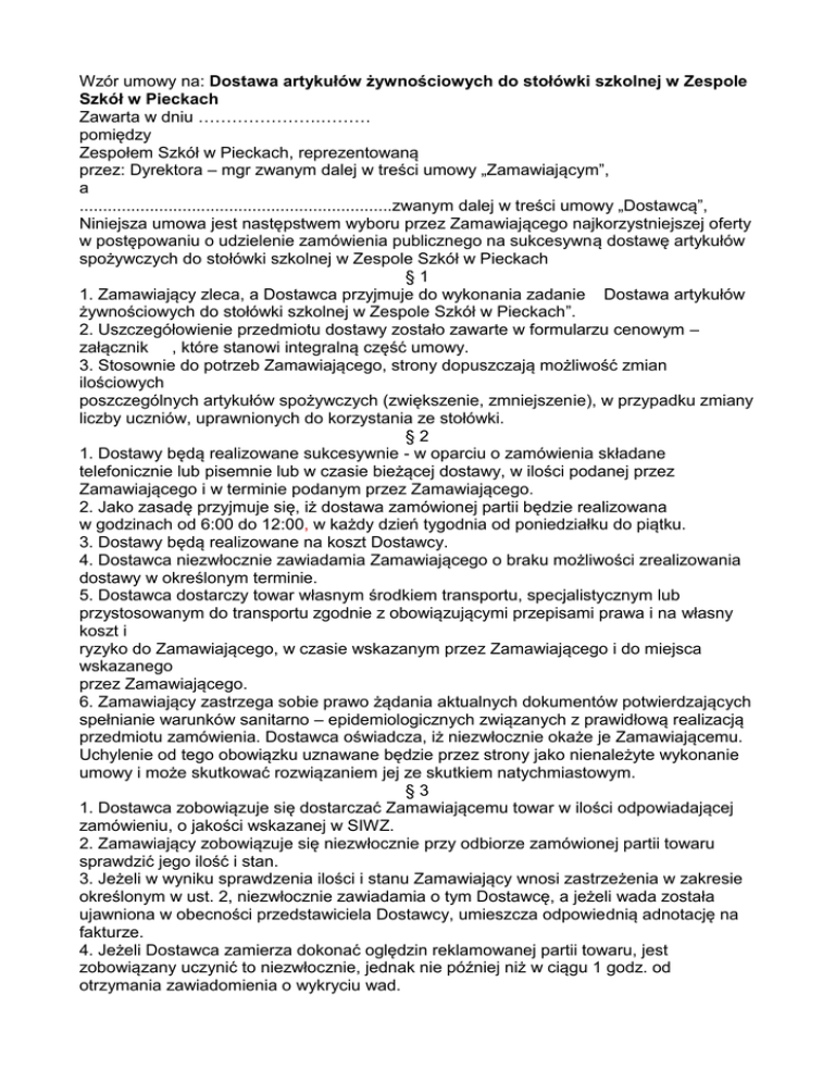 Wzór umowy na: Dostawa artykułów żywnościowych do stołówki szkolnej w Zespole Szkół w Pieckach Zawarta w dniu ………………….……… pomiędzy Zespołem Szkół w Pieckach, reprezentowaną przez: Dyrektora – mgr zwanym dalej w treści umowy „Zamawiającym”, a ...................................................................zwanym dalej w treści umowy „Dostawcą”, Niniejsza umowa jest następstwem wyboru przez Zamawiającego najkorzystniejszej oferty w postępowaniu o udzielenie zamówienia publicznego na sukcesywną dostawę artykułów spożywczych do stołówki szkolnej w Zespole Szkół w Pieckach §1 1. Zamawiający zleca, a Dostawca przyjmuje do wykonania zadanie Dostawa artykułów żywnościowych do stołówki szkolnej w Zespole Szkół w Pieckach”. 2. Uszczegółowienie przedmiotu dostawy zostało zawarte w formularzu cenowym – załącznik , które stanowi integralną część umowy. 3. Stosownie do potrzeb Zamawiającego, strony dopuszczają możliwość zmian ilościowych poszczególnych artykułów spożywczych (zwiększenie, zmniejszenie), w przypadku zmiany liczby uczniów, uprawnionych do korzystania ze stołówki. §2 1. Dostawy będą realizowane sukcesywnie - w oparciu o zamówienia składane telefonicznie lub pisemnie lub w czasie bieżącej dostawy, w ilości podanej przez Zamawiającego i w terminie podanym przez Zamawiającego. 2. Jako zasadę przyjmuje się, iż dostawa zamówionej partii będzie realizowana w godzinach od 6:00 do 12:00, w każdy dzień tygodnia od poniedziałku do piątku. 3. Dostawy będą realizowane na koszt Dostawcy. 4. Dostawca niezwłocznie zawiadamia Zamawiającego o braku możliwości zrealizowania dostawy w określonym terminie. 5. Dostawca dostarczy towar własnym środkiem transportu, specjalistycznym lub przystosowanym do transportu zgodnie z obowiązującymi przepisami prawa i na własny koszt i ryzyko do Zamawiającego, w czasie wskazanym przez Zamawiającego i do miejsca wskazanego przez Zamawiającego. 6. Zamawiający zastrzega sobie prawo żądania aktualnych dokumentów potwierdzających spełnianie warunków sanitarno – epidemiologicznych związanych z prawidłową realizacją przedmiotu zamówienia. Dostawca oświadcza, iż niezwłocznie okaże je Zamawiającemu. Uchylenie od tego obowiązku uznawane będzie przez strony jako nienależyte wykonanie umowy i może skutkować rozwiązaniem jej ze skutkiem natychmiastowym. §3 1. Dostawca zobowiązuje się dostarczać Zamawiającemu towar w ilości odpowiadającej zamówieniu, o jakości wskazanej w SIWZ. 2. Zamawiający zobowiązuje się niezwłocznie przy odbiorze zamówionej partii towaru sprawdzić jego ilość i stan. 3. Jeżeli w wyniku sprawdzenia ilości i stanu Zamawiający wnosi zastrzeżenia w zakresie określonym w ust. 2, niezwłocznie zawiadamia o tym Dostawcę, a jeżeli wada została ujawniona w obecności przedstawiciela Dostawcy, umieszcza odpowiednią adnotację na fakturze. 4. Jeżeli Dostawca zamierza dokonać oględzin reklamowanej partii towaru, jest zobowiązany uczynić to niezwłocznie, jednak nie później niż w ciągu 1 godz. od otrzymania zawiadomienia o wykryciu wad. 5. Jeżeli Dostawca nie dokona oględzin w terminie podanym w ust. 4 uważa się, że uznał reklamację Zamawiającego. 6. W przypadku uznania reklamacji Dostawca zobowiązuje się do natychmiastowej wymiany zakwestionowanej ilości dostarczonej partii towaru na wolną od wad, w terminie nie dłuższym niż 1 godzina; w uzasadnionych przypadkach Zamawiający może zwiększyć ten czas do 24 godzin. 7. Jeżeli Dostawca nie uznał reklamacji albo w razie niezgodności stanowisk co do oceny jakości towaru, strony niezwłocznie sporządzają protokół i pobierają próbki towaru. Pobraną próbkę wadliwego towaru Zamawiający dostarczy w ciągu 2 godz. do Stacji Sanitarno-Epidemiologicznej w Mrągowie, w celu wydania orzeczenia co do jakości dostarczonego towaru. 8. Koszt badania próbek ponosi Dostawca tylko wtedy, jeżeli ocena wskazała wadliwą jakość dostarczonego towaru. 9. Wyniki ekspertyz oraz badań laboratoryjnych wiążą strony. §4 1. Cenę towaru określa cena oferty zawarta w zbiorczym formularzu ofertowym z dnia ……………….. stanowiącym załącznik nr 2 do niniejszej umowy. 2. Podstawą do zapłaty za dostarczony towar będzie faktura wystawiona przez Dostawcę. 3. Zmiana stawki VAT w trakcie obowiązywania umowy nie stanowi zmiany ceny brutto towaru i nie wymaga podpisania stosownego aneksu do umowy. 4. Zapłata za dostarczony towar będzie dokonywana przelewem, po wystawieniu faktury i wydaniu przedmiotu dostawy, w terminie 21 dni od dnia doręczenia faktury Zamawiającemu na rachunek bankowy nr…………………………………………………, znajdujący się w Banku…………………………………………………. 5. Za nieterminowe regulowanie należności Dostawca ma prawo naliczyć Zamawiającemu odsetki ustawowe. §5 1. Strony dopuszczają możliwość zmiany postanowień zawartej umowy w przypadkach: a) zmiany obowiązujących przepisów prawa w zakresie mającym wpływ na realizację przedmiotu umowy, b) zmiany, która jest korzystna dla Zamawiającego lub zmiany, której nie można było przewidzieć na etapie przygotowania postępowania o udzielenie zamówienia, c) innych nieistotnych zmian postanowień zawartej umowy w stosunku do treści oferty, na podstawie której dokonano wyboru Dostawcy. §6 1. W razie niewykonania lub nienależytego wykonania umowy Dostawca zobowiązuje się zapłacić Zamawiającemu karę umowną w wysokości 10% wartości brutto określonej w formularzu ofertowym. 2. W razie zaistnienia istotnej zmiany okoliczności powodującej, że wykonanie umowy nie leży w interesie publicznym, czego nie można było przewidzieć w chwili zawarcia umowy, Zamawiający może odstąpić od umowy w terminie 30 dni od powzięcia wiadomości o tych okolicznościach. W takim przypadku Dost