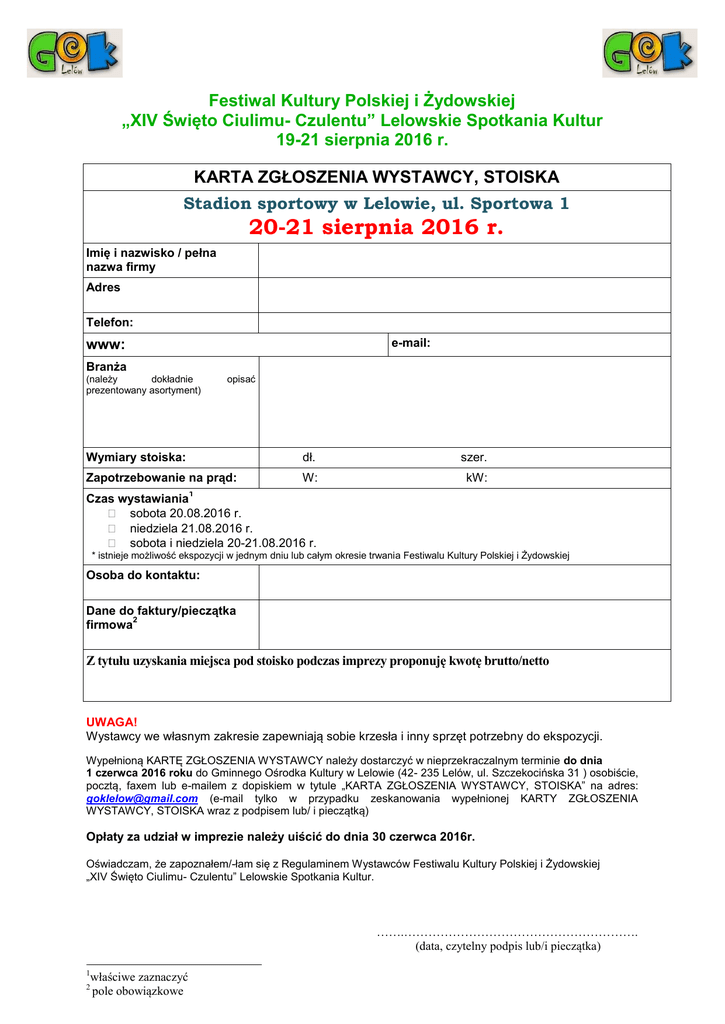 Festiwal Kultury Polskiej i Żydowskiej „XIV Święto Ciulimu- Czulentu” Lelowskie Spotkania Kultur 19-21 sierpnia 2016 r. KARTA ZGŁOSZENIA WYSTAWCY, STOISKA Stadion sportowy w Lelowie, ul. Sportowa 1 20-21 sierpnia 2016 r. Imię i nazwisko / pełna nazwa firmy Adres Telefon: e-mail: www: Branża (należy dokładnie prezentowany asortyment) opisać Wymiary stoiska: Zapotrzebowanie na prąd: dł. szer. W: kW: 1 Czas wystawiania sobota 20.08.2016 r. niedziela 21.08.2016 r. sobota i niedziela 20-21.08.2016 r. * istnieje możliwość ekspozycji w jednym dniu lub całym okresie trwania Festiwalu Kultury Polskiej i Żydowskiej Osoba do kontaktu: Dane do faktury/pieczątka 2 firmowa Z tytułu uzyskania miejsca pod stoisko podczas imprezy proponuję kwotę brutto/netto UWAGA! Wystawcy we własnym zakresie zapewniają sobie krzesła i inny sprzęt potrzebny do ekspozycji. Wypełnioną KARTĘ ZGŁOSZENIA WYSTAWCY należy dostarczyć w nieprzekraczalnym terminie do dnia 1 czerwca 2016 roku do Gminnego Ośrodka Kultury w Lelowie (42- 235 Lelów, ul. Szczekocińska 31 ) osobiście, pocztą, faxem lub e-mailem z dopiskiem w tytule „KARTA ZGŁOSZENIA WYSTAWCY, STOISKA” na adres: [email protected] (e-mail tylko w przypadku zeskanowania wypełnionej KARTY ZGŁOSZENIA WYSTAWCY, STOISKA wraz z podpisem lub/ i pieczątką) Opłaty za udział w imprezie należy uiścić do dnia 30 czerwca 2016r. Oświadczam, że zapoznałem/-łam się z Regulaminem Wystawców Festiwalu Kultury Polskiej i Żydowskiej „XIV Święto Ciulimu- Czulentu” Lelowskie Spotkania Kultur. …….…………………………………………………. (data, czytelny podpis lub/i pieczątka) 1 2 właściwe zaznaczyć pole obowiązkowe Regulamin Wystawców i Stoisk Festiwalu Kultury Polskiej i Żydowskiej „XIV Święto Ciulimu- Czulentu” Lelowskie Spotkania Kultur 1. Każdy wystawca zobowiązany jest przestrzegać Regulaminu Wystawców i Stoisk Festiwalu Kultury Polskiej i Żydowskiej „XIV Święto Ciulimu- Czulentu” Lelowskie Spotkania Kultur 2. Festiwal Kultury Polskiej i Żydowskiej „XIV Święto Ciulimu- Czulentu” Lelowskie Spotkania Kultur odbywa się w plenerze w dniach 20-21 sierpnia 2016 r. przy ul. Sportowej 1 w Lelowie. 3. Miejsce ekspozycji wskazuje wystawcy Organizator. 4. Każdy wystawca zobowiązuje się do zachowania porządku w obrębie swojego stoiska. 5. Organizator nie ponosi odpowiedzialności za pozostawione rzeczy i eksponaty wystawione na stoisku. 6. Warunkiem udziału w imprezie plenerowej Festiwal Kultury Polskiej i Żydowskiej „XIV Święto Ciulimu- Czulentu” Lelowskie Spotkania Kultur, jest dostarczenie dokładnie wypełnionego formularza zgłoszeniowego osobiście lub pocztą na adres Gminnego Ośrodka Kultury w Lelowie, ul. Szczekocińska 31, 42-235 Lelów, e- mail [email protected] (tylko w przypadku zeskanowania wypełnionej KARTY ZGŁOSZENIA WYSTAWCY, STOISKA wraz z podpisem lub/ i pieczątką) lub fax na nr 34/355-00-47. 7. Po akceptacji zgłoszenia przez Organizatora, wystawca jest zobowiązany dokonać wpłaty za udział w imprezie przelewem na rachunek bankowy Gminnego Ośrodka Kultury w Lelowie: KBSO/Niegowa Filia Lelów nr 15 8591 0007 0330 0923 0606 0001 z dopiskiem WYSTAWCY, STOISKO - XIV ŚWIĘTO CIULIMU- CZULENTU. Wystawca traci prawo udziału w Festiwalu, jeśli nie opłaci należności zgodnie z formularzem zgłoszeniowym do dnia 30 czerwca 2016 r. 8. Ostateczną wysokość opłaty za stoisko ustala Organizator. 9. W przypadku wycofania deklaracji udziału w imprezie wniesione przez wystawcę wpłaty nie podlegają zwrotowi. 10. Wystawca podpisując formularz zgłoszeniowy akceptuje warunki określone w „Regulaminie Wystawców i Stoisk”, co jest jednoznaczne z zawarciem umowy. 11. Organizatorzy zastrzegają sobie prawo odmowy przyjęcia zgłoszenia bez podania przyczyny. 12. Wystawca zobowiązany jest okazać kartę zgłoszenia oraz dowód wpłaty za udział w imprezie.
