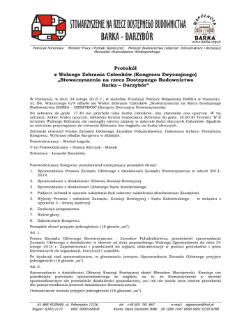 Patronat honorowy: Minister Pracy i Polityki Społecznej Minister Budownictwa (obecnie: Infrastruktury i Rozwoju) Marszałek Województwa Wielkopolskiego Protokół z Walnego Zebrania Członków (Kongresu Zwyczajnego) „Stowarzyszenia na rzecz Dostępnego Budownictwa Barka – Darzybór” W Poznaniu, w dniu 24 lutego 2015 r., w siedzibie Fundacji Pomocy Wzajemnej BARKA w Poznaniu, ul. Św. Wincentego 6/9 odbyło się Walne Zebranie Członków „Stowarzyszenia na Rzecz Dostępnego Budownictwa BARKA – DZRZYBÓR” (Kongres Zwyczajny Stowarzyszenia). Na zebranie do godz. 17.30 nie przybyła taka liczba członków, aby stanowiła ona quorum. W tej sytuacji, wobec braku quorum, odłożono termin rozpoczęcia Zebrania do godz. 18.00 (II Termin). W II terminie Walnego Zebrania nie nastąpiły istotne zmiany w zakresie ilości obecnych Członków. Zgodnie ze statutem przystąpiono do otwarcia Zebrania bez względu na liczbę obecnych. Zebranie otworzył Prezes Zarządu Głównego Jarosław Południkiewicz. Dokonano wyboru Prezydium Kongresu. Wybrano władze Kongresu w składzie: Przewodniczący – Michał Łagoda V-ce Przewodniczący – Hanna Kluczak - Misiak Sekretarz – Leopold Kamiński. Przewodniczący Kongresu przedstawiał następujący porządek obrad: 1. Sprawozdanie Prezesa Zarządu Głównego z działalności Zarządu Stowarzyszenia w latach 20132014. 2. Sprawozdanie z działalności Głównej Komisji Rewizyjnej. 3. Sprawozdanie z działalności Głównego Sądu Koleżeńskiego. 4. Podjęcie uchwał w sprawie udzielenia (lub odmowy udzielenia) absolutorium Zarządowi. 5. Wybory Prezesa i członków Zarządu, Komisji Rewizyjnej i Sądu Koleżeńskiego upływem 3 – letniej kadencji. 6. Dyskusja programowa. 7. Wolne głosy. 8. Zakończenie Kongresu. w związku z Porządek obrad przyjęto jednogłośnie (18 głosów „za”). Ad. 1. Prezes Zarządu Głównego Stowarzyszenia - Jarosław Południkiewicz, przedstawił sprawozdanie Zarządu Głównego z działalności w okresie od dnia poprzedniego Walnego Zgromadzenia do dnia 24 lutego 2015 r. Zaprezentował i przedstawił do wglądu dokumentację w postaci protokołów i pism kierowanych do organizacji, instytucji i urzędów. Po dyskusji nad sprawozdaniem, w głosowaniu jawnym, Sprawozdanie Zarządu Głównego przyjęto jednogłośnie (18 głosów „za”). Ad. 2. Sprawozdanie z działalności Głównej Komisji Rewizyjnej złożył Mirosław Maciejewski. Komisja nie przedłożyła protokołu sprawozdawczego ze względu na to, że Stowarzyszenie w okresie sprawozdawczym nie prowadziło działalności gospodarczej, ani też nie zaszły inne istotne przesłanki dla przeprowadzenia kontroli działalności Stowarzyszenia. Oświadczenie zostało przyjęte jednogłośnie (18 głosami „za”). 61-885 POZNAŃ, ul. Półwiejska 17/26 Regon: 634512172 KRS: 0000168504 tel. +48 601 761 867 Konto: Bank Zachodni WBK e-mail: [email protected] 28 1090 1447 0000 0001 0150 8788 Ad. 3. Tomasz Sadowski, przewodniczący Głównego Sądu Koleżeńskiego, oświadczył że w okresie sprawozdawczym nie miały miejsca żadne sprawy sporne. Stąd Główny Sąd Koleżeński nie skierował na Walne Zgromadzenie protokołu sprawozdawczego. Oświadczenie zostało przyjęte jednogłośnie (18 głosami „za”). Ad.4 W głosowaniu jawnym Kongres Stowarzyszenia podjął uchwałę udzielającą Zarządowi Głównemu absolutorium z działalności Stowarzyszenia od dnia poprzedniego Walnego Zgromadzenia do dnia 24 lutego 2015 r. Uchwała została podjęta jednogłośnie (18 głosów „za”). Ad. 5. Przystąpiono do Koleżeńskiego. zgłaszania kandydatów na członków Zarządu, Komisji Rewizyjnej i Sądu Zgłoszono kandydatury na członków Zarządu Głównego kolejnej kadencji, dotychczasowych członków Zarządu Głównego: tj. Jarosława Południkiewicza, Andrzeja Gorońskiego, Wiesława Buczkowskiego, Aleksandrę Konieczną, Michała Łagodę, Włodzimierza Urbańczaka, oraz Artura Marszała. Zgłoszeni wyrazili zgodę na kandydowanie. W głosowaniu jawnym Walne Zgromadzenie dokonało wyboru zgłoszonych kandydatur na członków Zarządu Głównego jednogłośnie (18 głosów „za”). Spośród wybranych członków Zarządu Głównego zgłoszono kandydaturę Jarosława Południkiewicza na Prezesa Zarządu Głównego. W głosowaniu jawnym Walne Zgromadzenie dokonało wyboru Prezesa Zarządu Głównego w osobie Jarosława Południkiewicza jednogłośnie (18 głosów „za”). Następnie zgłoszono kandydatury na członków Komisji Rewizyjnej kolejnej kadencji dotychczasowych członków tej Komisji: tj. Leopolda Kamińskiego, Hanny Kulczak - Misiak, oraz Mirosława Maciejewskiego. Zgłoszeni kandydaci wyrazili zgodę na kandydowanie. W głosowaniu jawnym Walne Zgromadzenie dokonało wyboru zgłoszonych kandydatur na członków Komisji Rewizyjnej nowej kadencji jednogłośnie (18 głosów „za”). Następnie zgłoszono kandydatury na członków Sądu Koleżeńskiego w osobach dotychczasowych członków Sądu Koleżeńskiego, tj.: Tomasza Sadowskiego, Wojciecha Gaczka oraz Mariana Tokarza. Zgłoszeni kandydaci obecni na Zebraniu wyrazili zgodę na kandydowanie. W głosowaniu jawnym Walne Zgromadzenie dokonało wyboru zgłoszonych kandydatur na członków Sądu Koleżeńskiego kolejnej kadencji jednogłośnie (18 głosów „za”). Ad. 6 W ramach dyskusji programowej Zarząd Stowarzyszenia przedłożył członkom projekt „Programu działań Stowarzyszenia na lata 2015/2016”. Po przeprowadzonej debacie Walne Zebranie zatwierdziło Program, który stanowi załącznik do niniejszego protokołu. Ad. 7 Brak wolnych głosów. Ad. 8 Przewodniczący Prezydium Kongresu zamknął obrady Kongresu. Przewodniczący Prezydium Walnego Zgromadzenia Michał Łagoda Sekretarz Prezydium Walnego Zgromadzenia Leopold Kamiński Załącznik do protokołu z Walnego Zebrania Członków w dniu 24.02.2015 r. Stowarzyszenie na Rzecz Dostępnego Budownictwa „BARKA – DARZYBÓR