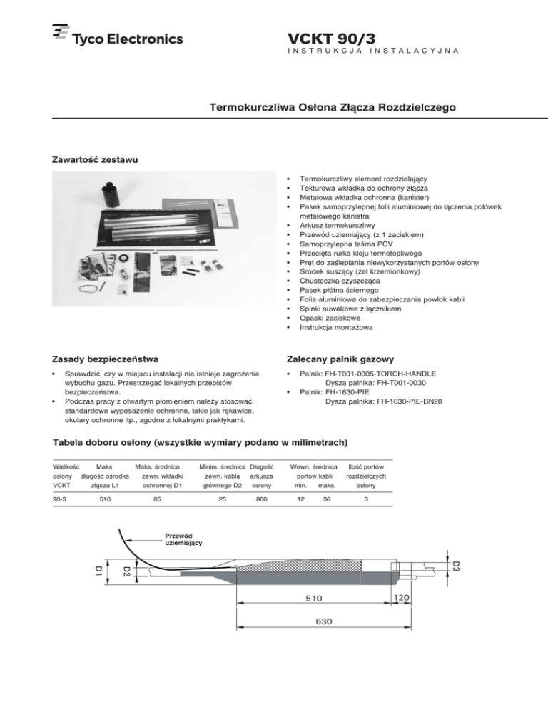 VCKT 90/3 INSTRUKCJA INSTALACYJNA Termokurczliwa Os∏ona Z∏àcza Rozdzielczego ZawartoÊç zestawu • • • • • • • • • • • • • • • • Termokurczliwy element rozdzielajàcy Tekturowa wk∏adka do ochrony z∏àcza Metalowa wk∏adka ochronna (kanister) Pasek samoprzylepnej folii aluminiowej do ∏àczenia po∏ówek metalowego kanistra Arkusz termokurczliwy Przewód uziemiajàcy (z 1 zaciskiem) Samoprzylepna taÊma PCV Przeci´ta rurka kleju termotopliwego Pr´t do zaÊlepiania niewykorzystanych portów os∏ony Ârodek suszàcy (˝el krzemionkowy) Chusteczka czyszczàca Pasek p∏ótna Êciernego Folia aluminiowa do zabezpieczania pow∏ok kabli Spinki suwakowe z ∏àcznikiem Opaski zaciskowe Instrukcja monta˝owa Zasady bezpieczeƒstwa Zalecany palnik gazowy • • • Sprawdziç, czy w miejscu instalacji nie istnieje zagro˝enie wybuchu gazu. Przestrzegaç lokalnych przepisów bezpieczeƒstwa. Podczas pracy z otwartym p∏omieniem nale˝y stosowaç standardowe wyposa˝enie ochronne, takie jak r´kawice, okulary ochronne itp., zgodne z lokalnymi praktykami. • Palnik: FH-T001-0005-TORCH-HANDLE Dysza palnika: FH-T001-0030 Palnik: FH-1630-PIE Dysza palnika: FH-1630-PIE-BN28 Tabela doboru os∏ony (wszystkie wymiary podano w milimetrach) WielkoÊç Maks. Maks. Êrednica Minim. Êrednica D∏ugoÊç Wewn. Êrednica IloÊç portów portów kabli rozdzielczych os∏ony d∏ugoÊç oÊrodka zewn. wk∏adki zewn. kabla arkusza VCKT z∏àcza L1 ochronnej D1 g∏ównego D2 os∏ony min. maks. os∏ony 25 800 12 36 3 510 85 Przewód SHCO uziemiajàcy D2 D1 3D 90-3 510 630 120 1 Przygotowanie kabli 1.1 U∏o˝yç kabel g∏ówny i kable rozdzielcze w miejscu ich monta˝u. WyczyÊciç pow∏oki kabli z brudu i zanieczyszczeƒ na odcinku o d∏ugoÊci 1500 mm. 1.5 Owinàç dooko∏a wszystkich kabli rozdzielczych ochronnà foli´ aluminiowà w taki sposób, aby niebieska linia na folii pokrywa∏a si´ ze znakiem wykonanym uprzednio na kablu. Wyg∏adziç ochronnà foli´ aluminiowà za pomocà t´pego narz´dzia. 1.2 Wprowadziç kable rozdzielcze do odpowiednich portów termokurczliwego elementu rozdzielajàcego. Ustawiç ten element w docelowym po∏o˝eniu. 1.3 Zaznaczyç na kablach rozdzielczych górnà kraw´dê portów termokurczliwego elementu rozdzielajàcego. Przesunàç element rozdzielajàcy do góry i zamocowaç go w tej pozycji za pomocà taÊmy samoprzylepnej. 1.6 Wykonaç na kablach rozdzielczych znak umieszczony 120 mm poni˝ej kraw´dzi aluminiowej folii ochronnej, wyznaczajàcy punkt usuni´cia pow∏ok tych kabli. 1.4 WyczyÊciç (za pomocà chusteczki czyszczàcej) i zdegradowaç (za pomocà paska p∏ótna Êciernego) powierzchni´ pow∏ok kabli rozdzielczych na odcinku o d∏ugoÊci oko∏o 100 mm. Uwaga! Nale˝y zwróciç uwag´ na to, aby nie zetrzeç z pow∏ok kabli wykonanych uprzednio znaków. 2 1.10 Zabezpieczyç zacisk przewodu uziemiajàcego taÊmà samoprzylepnà. 2 Instalacja os∏ony 2.1 Wykonaç z∏àcze kablowe zgodnie z lokalnie zatwierdzonà praktykà. 2.2 Wyjàç z torebki aluminiowej ˝el krzemionkowy do osuszania wn´trza os∏ony i umieÊciç go w obszarze z∏àcza kablowego. Wiàzki ˝y∏ miedzianych nale˝y po∏àczyç zgodnie z lokalnymi zaleceniami. 1.7 Odmierzyç na kablu g∏ównym d∏ugoÊç L1 (podanà w tabeli doboru os∏ony na str. 1) i zaznaczyç jà na pow∏oce tego kabla. Zaznaczony punkt wyznacza miejsce usuni´cia pow∏oki kabla g∏ównego. Usunàç pow∏ok´ kabla g∏ównego i pow∏oki kabli rozdzielczych. 1.8 W celu zainstalowania na kablu g∏ównym przewodu uziemiajàcego, nale˝y u˝yç specjalnego no˝a do nacinania pow∏oki, za pomocà którego w pow∏oce kabla wycinamy pasek o d∏ugoÊci 25 mm i szerokoÊci 15 mm. Pod wyci´tym paskiem pow∏oki kabel nale˝y owinàç samoprzylepnà taÊmà ochronnà. 2.3 Owinàç ciasno dooko∏a z∏àcza kablowego tekturowà wk∏adk´ do ochrony z∏àcza, rozpoczynajàc od koƒca pow∏oki kabla g∏ównego. Zabezpieczyç wk∏adk´ taÊmà samoprzylepnà. Skontrolowaç, czy Êrednica zewn´trzna na wk∏adce ochronnej nie jest wi´ksza ni˝ Êrednica D1 (podana w tabeli doboru os∏ony na str. 1). 1.9 Za pomocà standardowych szczypiec p∏askich zainstalowaç na kablu g∏ównym zacisk przewodu uziemiajàcego. Przewód powinien byç skierowany w stron´ przeciwnà ni˝ z∏àcze kablowe. 3 3 Instalacja metalowej wk∏adki ochronnej (kanistra) 3.3 Nasunàç termokurczliwy element rozdzielajàcy na metalowy kanister. Zrównaç górnà kraw´dê termokurczliwego elementu rozdzielajàcego z niebieskà linià na folii aluminiowej do zabezpieczania pow∏ok kabli. 3.1 Zmontowaç dwie po∏ówki metalowej wk∏adki ochronnej tak, aby uzyskaç zawiasowo otwierany kanister i zabezpieczyç miejsca po∏àczeƒ paskami samoprzylepnej folii aluminiowej. Wyg∏adziç przylepionà taÊm´ t´pym narz´dziem. 3.2 Zabezpieczyç górnà kraw´dê metalowego kanistra za pomocà warstwy samoprzylepnej taÊmy polwinitowej. 4 3.4 Owinàç polwinitowà taÊmà samoprzylepnà koƒcowe korony metalowego kanistra a˝ do kabla g∏ównego. Nawijanie nale˝y rozpoczàç od korpusu kanistra i kontynuowaç, stosujàc 50-procentowà zak∏adk´, a˝ do wejÊcia na g∏ówny kabel. Pow∏oka kabla g∏ównego nie mo˝e byç owini´ta taÊmà na odcinku d∏u˝szym ni˝ 5 mm. 4 Instalacja uszczelnieƒ kabli rozdzielczych 4.1 Zamknàç niewykorzystane porty termokurczliwego elementu rozdzielajàcego os∏ony pr´tem zaÊlepiajàcym. Zainstalowaç opask´ zaciskowà dooko∏a pr´ta zaÊlepiajàcego i wsunàç go do wn´trza odpowiednich portów elementu rozdzielajàcego os∏ony. 4.3 Kontynuowaç obkurczanie termokurczliwego elementu rozdzielajàcego os∏ony a˝ do momentu uszczelnienia kabli rozdzielczych. Wygrzewanie termokurczliwego elementu rozdzielajàcego nale˝y kontynuowaç a˝ do chwili, gdy plamki farby termochromatycznej na jego powierzchni zmienià kolor z zieloneg