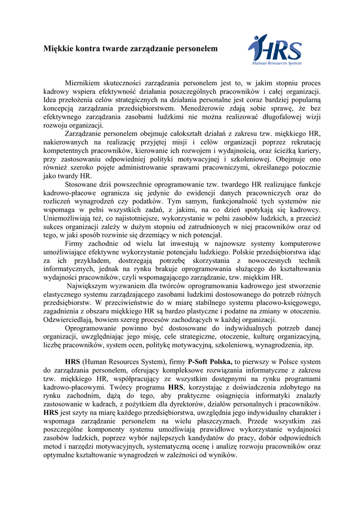 Miękkie kontra twarde zarządzanie personelem Miernikiem skuteczności zarządzania personelem jest to, w jakim stopniu proces kadrowy wspiera efektywność działania poszczególnych pracowników i całej organizacji. Idea przełożenia celów strategicznych na działania personalne jest coraz bardziej popularną koncepcją zarządzania przedsiębiorstwem. Menedżerowie zdają sobie sprawę, że bez efektywnego zarządzania zasobami ludzkimi nie można realizować długofalowej wizji rozwoju organizacji. Zarządzanie personelem obejmuje całokształt działań z zakresu tzw. miękkiego HR, nakierowanych na realizację przyjętej misji i celów organizacji poprzez rekrutację kompetentnych pracowników, kierowanie ich rozwojem i wydajnością, oraz ścieżką kariery, przy zastosowaniu odpowiedniej polityki motywacyjnej i szkoleniowej. Obejmuje ono również szeroko pojęte administrowanie sprawami pracowniczymi, określanego potocznie jako twardy HR. Stosowane dziś powszechnie oprogramowanie tzw. twardego HR realizujące funkcje kadrowo-płacowe ogranicza się jedynie do ewidencji danych pracowniczych oraz do rozliczeń wynagrodzeń czy podatków. Tym samym, funkcjonalność tych systemów nie wspomaga w pełni wszystkich zadań, z jakimi, na co dzień spotykają się kadrowcy. Uniemożliwiają też, co najistotniejsze, wykorzystanie w pełni zasobów ludzkich, a przecież sukces organizacji zależy w dużym stopniu od zatrudnionych w niej pracowników oraz od tego, w jaki sposób rozwinie się drzemiący w nich potencjał. Firmy zachodnie od wielu lat inwestują w najnowsze systemy komputerowe umożliwiające efektywne wykorzystanie potencjału ludzkiego. Polskie przedsiębiorstwa idąc za ich przykładem, dostrzegają potrzebę skorzystania z nowoczesnych technik informatycznych, jednak na rynku brakuje oprogramowania służącego do kształtowania wydajności pracowników, czyli wspomagającego zarządzanie, tzw. miękkim HR. Największym wyzwaniem dla twórców oprogramowania kadrowego jest stworzenie elastycznego systemu zarządzającego zasobami ludzkimi dostosowanego do potrzeb różnych przedsiębiorstw. W przeciwieństwie do w miarę stabilnego systemu płacowo-księgowego, zagadnienia z obszaru miękkiego HR są bardzo plastyczne i podatne na zmiany w otoczeniu. Odzwierciedlają, bowiem szereg procesów zachodzących w każdej organizacji. Oprogramowanie powinno być dostosowane do indywidualnych potrzeb danej organizacji, uwzględniając jego misję, cele strategiczne, otoczenie, kulturę organizacyjną, liczbę pracowników, system ocen, politykę motywacyjną, szkoleniową, wynagrodzenia, itp. HRS (Human Resources System), firmy P-Soft Polska, to pierwszy w Polsce system do zarządzania personelem, oferujący kompleksowe rozwiązania informatyczne z zakresu tzw. miękkiego HR, współpracujący ze wszystkim dostępnymi na rynku programami kadrowo-płacowymi. Twórcy programu HRS, korzystając z doświadczenia zdobytego na rynku zachodnim, dążą do tego, aby praktyczne osiągnięcia informatyki znalazły zastosowanie w kadrach, z pożytkiem dla dyrektorów, działów personalnych i pracowników. HRS jest szyty na miarę każdego przedsiębiorstwa, uwzględnia jego indywidualny charakter i wspomaga zarządzanie personelem na wielu płaszczyznach. Przede wszystkim zaś poszczególne komponenty systemu umożliwiają prawidłowe wykorzystanie wydajności zasobów ludzkich, poprzez wybór najlepszych kandydatów do pracy, dobór odpowiednich metod i narzędzi motywacyjnych, systematyczną ocenę i analizę rozwoju pracowników oraz optymalne kształtowanie wynagrodzeń w zależności od wyników. Oto niektóre moduły programu HRS wspomagające zarządzanie tzw. miękkim HR: Opisy stanowisk pracy Głównym celem sporządzania opisu stanowiska pracy jest utrwalenie związanego z danym stanowiskiem zakresu odpowiedzialności, a także wymaganych kwalifikacji. Jasne i przejrzyste opisy stanowisk informują pracowników o celu stanowiska i treści wykonywanej pracy i, co najważniejsze - o wymaganiach stawianych mu przez podwładnych i kryteriach, według, których oceniana jest jego praca. Wartościowanie stanowisk pracy Określenie wartości każdego stanowiska pod względem jego znaczenia w realizacji strategii przedsiębiorstwa umożliwia zbudowanie przejrzystej struktury organizacyjnej. Kryteria wartościowania mogą posłużyć do stworzenia wskaźników oceniania efektywności pracy. Rekrutacja Wybór kompetentnej kadry to wyzwanie dla każdego przedsiębiorstwa. Oceniając przydatność kandydata warto zaplanować jego potencjalną ścieżkę kariery, dobrać odpowiednią politykę motywacyjną i zaplanować etapy rozwoju zawodowego. Oceny okresowe Przeprowadzenie ocen okresowych, (zarówno w wersji 180, jak i 360 stopni) umożliwia oceniającemu oraz ocenianemu poznanie wzajemnych oczekiwań, co do przebiegu dalszej współpracy. Obie strony mogą zrozumieć sens swojej pracy, zadań i ich powiązania z realizacją celów firmy. Jest to kompleksowe narzędzie, zajmujące centralne miejsce w systemie zarządzania zasobami ludzkimi. Wyniki ocen umożliwiają, bowiem wieloaspektowo zmierzyć efektywność pracy i są wykorzystywane na każdym etapie procesu kadrowego. Szkolenia Kompleksowy system ocen umożliwia określenie indywidualnego kierunku rozwoju zawodowego każdego pracownika, wytyczenie ścieżki kariery i dobranie odpowiednich szkoleń. Dzięki systemowi możemy się upewnić, które szkolenia są niezbędne konkretnym pracownikom. Oznacza to koniec szkolenia całego personelu hurtowo i jednocześnie duże oszczędności dla firmy. Ocena kompetencji Na kwalifikacje pracownika składa się zespół umiejętności, cech osobowości, charakteru, nastawień, nawyków, motywacji. Bardzo trudno określić, które kompetencje decydować będą o sukcesie na określonym stanowisku pracy, a jeszcze trudniej zmierzyć je. Jednak może się to udać z pomocą systemu HRS! 