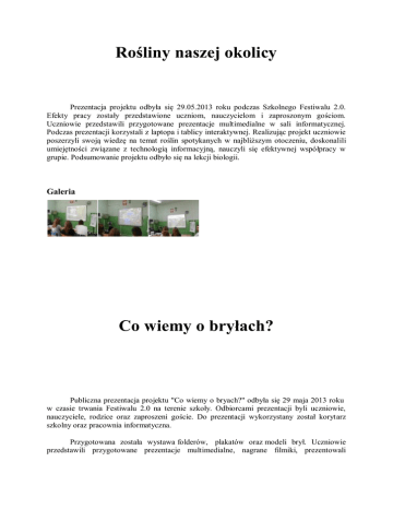 Rośliny naszej okolicy Prezentacja projektu odbyła się 29.05.2013 roku podczas Szkolnego Festiwalu 2.0. Efekty pracy zostały przedstawione uczniom, nauczycielom i zaproszonym gościom. Uczniowie przedstawili przygotowane prezentacje multimedialne w sali informatycznej. Podczas prezentacji korzystali z laptopa i tablicy interaktywnej. Realizując projekt uczniowie poszerzyli swoją wiedzę na temat roślin spotykanych w najbliższym otoczeniu, doskonalili umiejętności związane z technologią informacyjną, nauczyli się efektywnej współpracy w grupie. Podsumowanie projektu odbyło się na lekcji biologii. Galeria Co wiemy o bryłach? Publiczna prezentacja projektu "Co wiemy o bryach?" odbyła się 29 maja 2013 roku w czasie trwania Festiwalu 2.0 na terenie szkoły. Odbiorcami prezentacji byli uczniowie, nauczyciele, rodzice oraz zaproszeni goście. Do prezentacji wykorzystany został korytarz szkolny oraz pracownia informatyczna. Przygotowana została wystawa folderów, plakatów oraz modeli brył. Uczniowie przedstawili przygotowane prezentacje multimedialne, nagrane filmiki, prezentowali doświadczalnie odpowiedź na pytanie: Jak powstają bryły obrotowe? W związku z prezentacją wykorzystali narzędzia TIK: laptopy, projektor, tablicę interaktywną. Przygotowując sie do prezentacji projektu na szkolnym Festiwalu 2.0 uczniowie wykazali się umiejętnością prezentacji wyników własnej pracy, biegłego posługiwania się narzędziami TIK oraz współpracy w grupie. Galeria "Nie tylko mózg chodzi do szkoły" Podsumowanie realizowanego projektu odbyło się 29 maja 2013r. Efekty długoterminowej pracy zostały zaprezentowane: uczniom, nauczycielom, rodzicom i zaproszonym gościom. Prezentacja projektu została przeprowadzona na górnym korytarzu i w sali informatycznej Gimnazjum nr 1 w Kłodawie. Uczniowie przygotowali wystawę pt.: „Nie tylko mózg chodzi do szkoły”. Przedstawili: przygotowane prezentacje multimedialne i filmiki nakręcone przez siebie, wykonane broszurki z różnymi ciekawymi przepisami, plakaty tematyczne itp. Uczniowie podczas prezentacji projektu korzystali z różnych narzędzi TIK m. in.: projektora, laptopów, aparatów fotograficznych, które uatrakcyjniły zajęcia. Gimnazjaliści prezentując projekt wykazali się: Umiejętnościami prezentowania własnych osiągnięć kulinarnych, dając świadectwo, że potrafią dokonać wiele pożytecznych i dobrych rzeczy, jeżeli zostaną właściwie zmobilizowani i uzyskają właściwą pomoc. Pomysłowością i fantazją podczas przygotowywania wystaw na szkolnym korytarzu: - „Nietypowa zastawa stołowa” - wystawa zastawy stołowej. - „Broszurki z przepisami” – wystawa broszurek z przepisami kulinarnymi. - „W zdrowym ciele zdrowy duch” – wystawa plakatów. Umiejętnościami sprawnego posługiwania się komputerem podczas pokazu prezentacji multimedialnych i filmików. Umiejętnościami współpracy w grupie i skutecznego komunikowania się planowania i organizowania wystawy własnych prac. Galeria