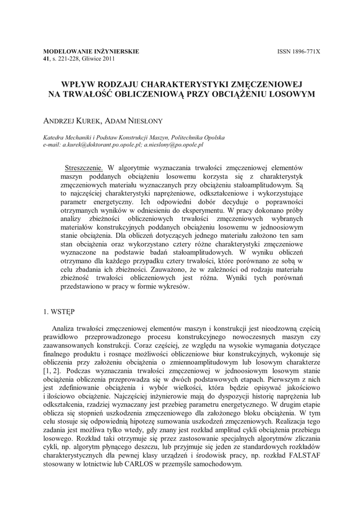 MODELOWANIE INŻYNIERSKIE 41, s. 221-228, Gliwice 2011 ISSN 1896-771X WPŁYW RODZAJU CHARAKTERYSTYKI ZMĘCZENIOWEJ NA TRWAŁOŚĆ OBLICZENIOWĄ PRZY OBCIĄŻENIU LOSOWYM ANDRZEJ KUREK, ADAM NIESŁONY Katedra Mechaniki i Podstaw Konstrukcji Maszyn, Politechnika Opolska e-mail: [email protected]; [email protected] Streszczenie. W algorytmie wyznaczania trwałości zmęczeniowej elementów maszyn poddanych obciążeniu losowemu korzysta się z charakterystyk zmęczeniowych materiału wyznaczanych przy obciążeniu stałoamplitudowym. Są to najczęściej charakterystyki naprężeniowe, odkształceniowe i wykorzystujące parametr energetyczny. Ich odpowiedni dobór decyduje o poprawności otrzymanych wyników w odniesieniu do eksperymentu. W pracy dokonano próby analizy zbieżności obliczeniowych trwałości zmęczeniowych wybranych materiałów konstrukcyjnych poddanych obciążeniu losowemu w jednoosiowym stanie obciążenia. Dla obliczeń dotyczących jednego materiału założono ten sam stan obciążenia oraz wykorzystano cztery różne charakterystyki zmęczeniowe wyznaczone na podstawie badań stałoamplitudowych. W wyniku obliczeń otrzymano dla każdego przypadku cztery trwałości, które porównano ze sobą w celu zbadania ich zbieżności. Zauważono, że w zależności od rodzaju materiału zbieżność trwałości obliczeniowych jest różna. Wyniki tych porównań przedstawiono w pracy w formie wykresów. 1. WSTĘP Analiza trwałości zmęczeniowej elementów maszyn i konstrukcji jest nieodzowną częścią prawidłowo przeprowadzonego procesu konstrukcyjnego nowoczesnych maszyn czy zaawansowanych konstrukcji. Coraz częściej, ze względu na wysokie wymagania dotyczące finalnego produktu i rosnące możliwości obliczeniowe biur konstrukcyjnych, wykonuje się obliczenia przy założeniu obciążenia o zmiennoamplitudowym lub losowym charakterze [1, 2]. Podczas wyznaczania trwałości zmęczeniowej w jednoosiowym losowym stanie obciążenia obliczenia przeprowadza się w dwóch podstawowych etapach. Pierwszym z nich jest zdefiniowanie obciążenia i wybór wielkości, która będzie opisywać jakościowo i ilościowo obciążenie. Najczęściej inżynierowie mają do dyspozycji historię naprężenia lub odkształcenia, rzadziej wyznaczany jest przebieg parametru energetycznego. W drugim etapie oblicza się stopnień uszkodzenia zmęczeniowego dla założonego bloku obciążenia. W tym celu stosuje się odpowiednią hipotezę sumowania uszkodzeń zmęczeniowych. Realizacja tego zadania jest możliwa tylko wtedy, gdy znany jest rozkład amplitud cykli obciążenia przebiegu losowego. Rozkład taki otrzymuje się przez zastosowanie specjalnych algorytmów zliczania cykli, np. algorytm płynącego deszczu, lub przyjmuje się jeden ze standardowych rozkładów charakterystycznych dla pewnej klasy urządzeń i środowisk pracy, np. rozkład FALSTAF stosowany w lotnictwie lub CARLOS w przemyśle samochodowym. 222 A. KUREK, A. NIESŁONY W zależności od tego, jaką wielkość wybrano do opisu obciążenia w algorytmie obliczeniowym, występuje odpowiednia charakterystyka zmęczeniowa materiału, która opisuje zależność liczby cykli do zniszczenia zmęczeniowego w funkcji wybranego parametru. Basquin zaproponował, aby wyniki eksperymentalne badań zmęczeniowych opisać następującą zależnością [3] σ a = σ ' f (2 N f )b , (1) gdzie σa jest amplitudą naprężenia, Nf liczbą cykli do zniszczenia, σ'f i b odpowiednio współczynnikiem i wykładnikiem wytrzymałości zmęczeniowej. Inną, bardzo popularną charakterystyką zmęczeniową materiału, jest charakterystyka odkształceniowa MansonaCoffina-Basquina (MCB) [3-5] ε a ,t = ε a,e + ε a , p = σ 'f (2 N ) b f E + ε ' f (2 N f ) c (2) gdzie εa,t oznacza amplitudę odkształcenia całkowitego wyrażoną sumą amplitud odkształcenia sprężystego εa,e i plastycznego εa,p, E jest modułem Younga, ε'f i c odpowiednio współczynnikiem i wykładnikiem zmęczeniowego odkształcenia plastycznego. Charakterystyka MCB zbudowana jest na kontrowersyjnym założeniu o poprawności opisu części sprężystej i plastycznej amplitudy odkształcenia całkowitego prostymi w układzie podwójnie logarytmicznym. Jednakże dla wielu materiałów założenie to nie jest prawdziwe, szczególnie w odniesieniu do amplitud odkształcenia plastycznego [6]. Dlatego też powstały i są wykorzystywane inne modele odkształceniowe wiążące amplitudę odkształcenia całkowitego z liczbą cykli do zniszczenia zmęczeniowego, np. propozycja Mansona [4] ε a,t ⎛ C =⎜ ⎜N ⎝ f 1 ⎞ξ ⎟ + ε0 , ⎟ ⎠ (3) gdzie C, ξ i ε0 są współczynnikami modelu wyznaczonymi przez dopasowanie krzywej do punktów eksperymentalnych metodą najmniejszych kwadratów. Trzecią grupą są charakterystyki zmęczeniowych oparte na parametrach energetycznych. Ze względu na różne definicje tych parametrów napotyka się znaczną grupę tych charakterystyk. Najczęściej są one otrzymywane poprzez przekształcenia wzorów wynikających z modeli naprężeniowych i odkształceniowych. Przykładem może tu być charakterystyka, którą otrzymuje się poprzez porównanie parametru Smitha-Watsona-Toppera (SWT) εaσmax z iloczynem charakterystyk naprężeniowej Basquina (1) i odkształceniowej MCB (2) [7]. W przypadku, gdy amplitudy naprężenia nie przejawiają wartości średnich, otrzymuje się (σ ' ) (2 N ) 2 ε a ,tσ a = 2b f E f + σ ' f ε ' f (2 N f ) . c+b (4) Zarówno charakterystykę zmęczeniową naprężeniową (1), odkształceniowe (2) i (3) jak i parametru energetycznego (4) można sporządzić na podstawie wyników jednej serii badań eksperymentalnych. Są to typowe badania określone w normach [8] realizowane przy stałej amplitudzie odkształcenia z rejestracją liczby cykli do zniszczenia i amplitudy naprężenia. Biorąc pod uwagę fakt, że tylko jedna para amplitud naprężenia i odkształcenia odpowiada WPŁYW RODZAJU CHARA