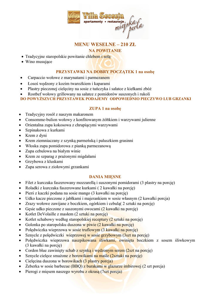 MENU WESELNE – 210 ZŁ NA POWITANIE Tradycyjne staropolskie powitanie chlebem i solą Wino musujące PRZYSTAWKI NA DOBRY POCZĄTEK 1 na osobę Carpaccio wołowe z marynatami i parmezanem Łosoś wędzony z kozim twarożkiem i kaparami Plastry pieczonej cielęciny na sosie z tuńczyka i sałatce z kiełkami zbóż Rostbef wołowy grillowany na sałatce z pomidorów suszonych i rukoli DO POWYŻSZYCH PRZYSTAWEK PODAJEMY ODPOWIEDNIO PIECZYWO LUB GRZANKI ZUPA 1 na osobę Tradycyjny rosół z naszym makaronem Consomme-bulion wołowy z konfitowanym żółtkiem i warzywami julienne Orientalna zupa kokosowa z chrupiącymi warzywami Szpinakowa z kurkami Krem z dyni Krem ziemniaczany z szynką parmeńską i paluszkiem grasinni Włoska zupa pomidorowa z pianką parmezanową Zupa cebulowa na białym winie Krem ze szparag z prażonymi migdałami Grzybowa z kluskami Zupa serowa z ziołowymi grzankami DANIA MIĘSNE Filet z kurczaka faszerowany mozzarellą i suszonymi pomidorami (3 plastry na porcję) Roladki z kurczaka faszerowane kurkami ( 2 kawałki na porcję) Pierś z kaczki podana na sosie mango (3 kawałki na porcję) Udko kacze pieczone z jabłkami i majerankiem w sosie własnym (2 kawałki porcja) Zrazy wołowe zawijane z boczkiem, ogórkiem i cebulą( 2 sztuki na porcję) Gęsie udko pieczone z suszonymi owocami (2 kawałki na porcję) Kotlet DeVolaille z masłem (2 sztuki na porcję) Kotlet schabowy według staropolskiej receptury (2 sztuki na porcję) Golonka po staropolsku duszona w piwie (2 kawałki na porcję) Polędwiczka wieprzowa w sosie truflowym (3 kawałki na porcję) Sznycle z polędwiczki wieprzowej w sosie grzybowym (3szt na porcję) Polędwiczka wieprzowa naszpikowana śliwkami, owinięta boczkiem z sosem śliwkowym (3 kawałki na porcję) Cordon blue zawinięty schab z szynką i wędzonym serem (2szt na porcję) Sznycle cielęce smażone z borowikami na maśle (2sztuki na porcję) Cielęcina duszona w borowikach (3 plastry porcja) Żeberka w sosie barbecue (BBQ) z burakami w glazurze imbirowej (2 szt porcja) Pierogi z mięsem naszego wyrobu z okrasą (7szt porcja) DANIA RYBNE Dorsz pieczony posypany kruszonką z oliwek i suszonych pomidorów (2 kawałki na porcję) Łosoś pieczony lub gotowany z sosem cytrynowym (2 kawałki na porcję) Halibut zapiekany z łososiem wędzonym na kaparowym sosie (2 kawałki na porcję) Grillowany filet z łososia(2 kawałki na porcję ) Bazyliowe pierogi z łososiem na krewetkowym sosie (7 szt na porcję) DODATKI DO POTRAW (6 do wyboru) Ziemniaki gotowane Ziemniaki pieczone Ziemniaki purre Ryż na sypko Ryż z warzywami Kasza z boczkiem i majerankiem Kluski lane Kluski śląskie Mix sałat Warzywa gotowane na parze Warzywa grillowane Modra kapusta Kapusta zasmażana Buraczki Szpinak Bukiet surówek WINO DO OBIADU 100ml na osobę Wino czerwone wytrawne Wino białe wytrawne DESER 1 na osobę Fondant czekoladowy z lodem orzechowym i sosem wiśniowym Lody z gorącymi malinami Pucharek lodów z owocami Puchar lodów czekoladowych z wiśniami Creme Brulee 3 smaki Panna cotta z sosem owocowym Tiramisu Strudel z jabłkami w cieście filo Szarlotka na ciepło z lodem i bitą śmietaną Sernik z bakaliami lodem waniliowym i bitą śmietaną ZAKĄSKI PODANE NA PÓŁMISKACH 5 na osobę Tatar ze świeżego łososia z ogórkiem papryką i kaparami Łosoś pieczony w kawałkach glazurowany jabłkową galaretką (3kawałki porcja) Ryby wędzone łosoś, pstrąg, halibut Śledź w trzech smakach: w oleju, po kaszubsku, w miodzie z bakaliami Półmisek wędlin oranżeria(na 2 osoby) - różne rodzaje wędlin Serowa kompozycja Oranżeria (na 2 osoby) - różne gatunki sera Tatar wołowy z dodatkami: cebula, ogórek kiszony, grzyby marynowane (2szt porcja) Szynka po rusku tradycyjnie przygotowana (2szt porcja) Łosoś wędzony z kozim twarożkiem i kaparami MIĘSA PIECZONE Schab w ziołach Schab pieczony z suszonymi owocami Karkówka pieczona z grzybami Karkówka pieczona z warzywami Karkówka pieczona ze śliwką kalifornijską Pierś kaczki z sosem jabłkowym Rostbef pieczony z musem chrzanowym Indyk pieczony z owocami Pierś kurczaka ze szpinakiem i fetą Pasztet staropolski z żurawiną (3 kawałki na porcję) Plastry pieczonej cielęciny SAŁATKI Z grillowanymi polędwiczkami drobiowymi , Sałatka grecka ,z serem, oliwkami, pomidorami, świeżym ogórkiem, papryką podaną na sałacie skropionej dresingiem winegret Sałatka z tuńczykiem i max sałat, pomidorki cherry, żółty ser, papryką, świeżym ogórkiem i sosem majonezowym Sałatka z krewetkami ze świeżymi warzywami na bukiecie sałat i kiełek zbóż polana sosem koktajlowym Sałatka z serem brie, owocami balsamicznymi i prażonymi pestkami ułożonymi na kolorowym miksie sałat Sałatka z łososiem wędzonym, jajkiem i kaparami na sałatach polana sosem koperkowym Sałatka z melonem i szynką parmeńską przyprószona parmezanem i skropiona sosem winegret ZAKĄSKI SERWOWANE NA CIEPŁO 2 na osobę Żurek staropolski z białą kiełbasą i jajkiem Barszcz z pasztecikiem z ciasta francuskiego Boeuf Strogonow Plastry kurczaka z kurkami w śmietanie Małże nowozelandzkie zapiekane na dwa sposoby 3szt porcja Pierogi z ciasta filo i ciasta francuskiego z mięsem, ze szpinakiem i serem (4szt porcja)